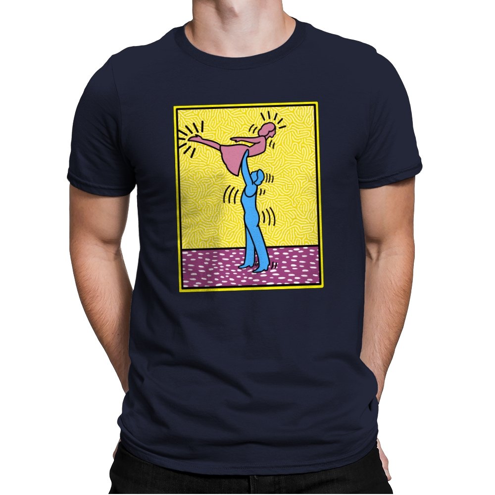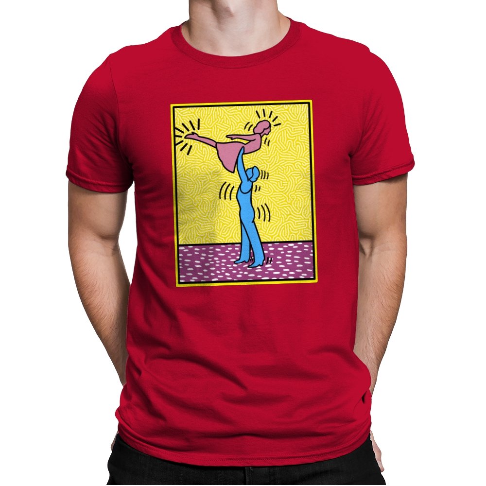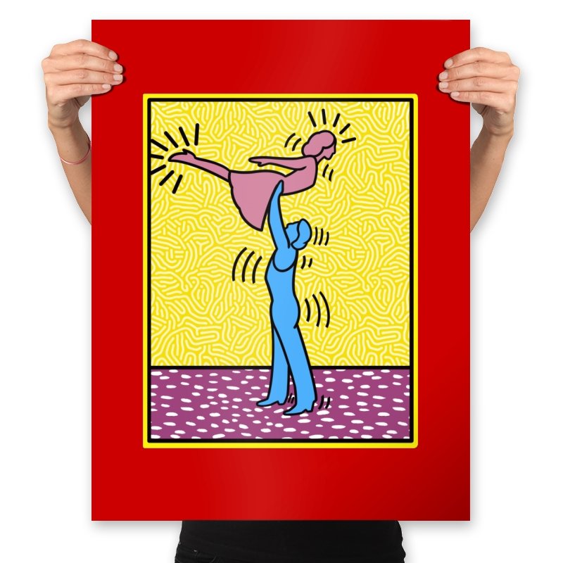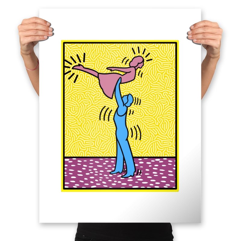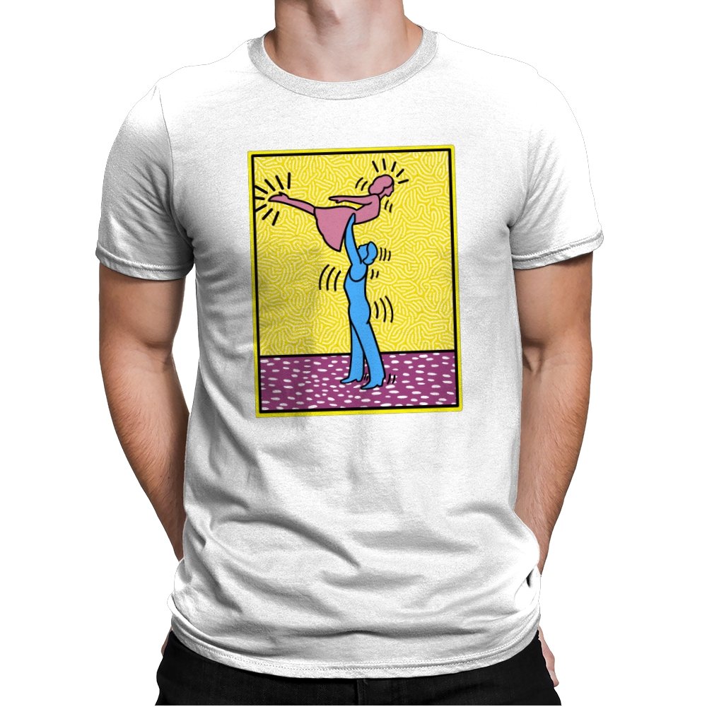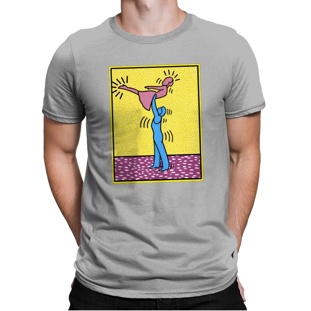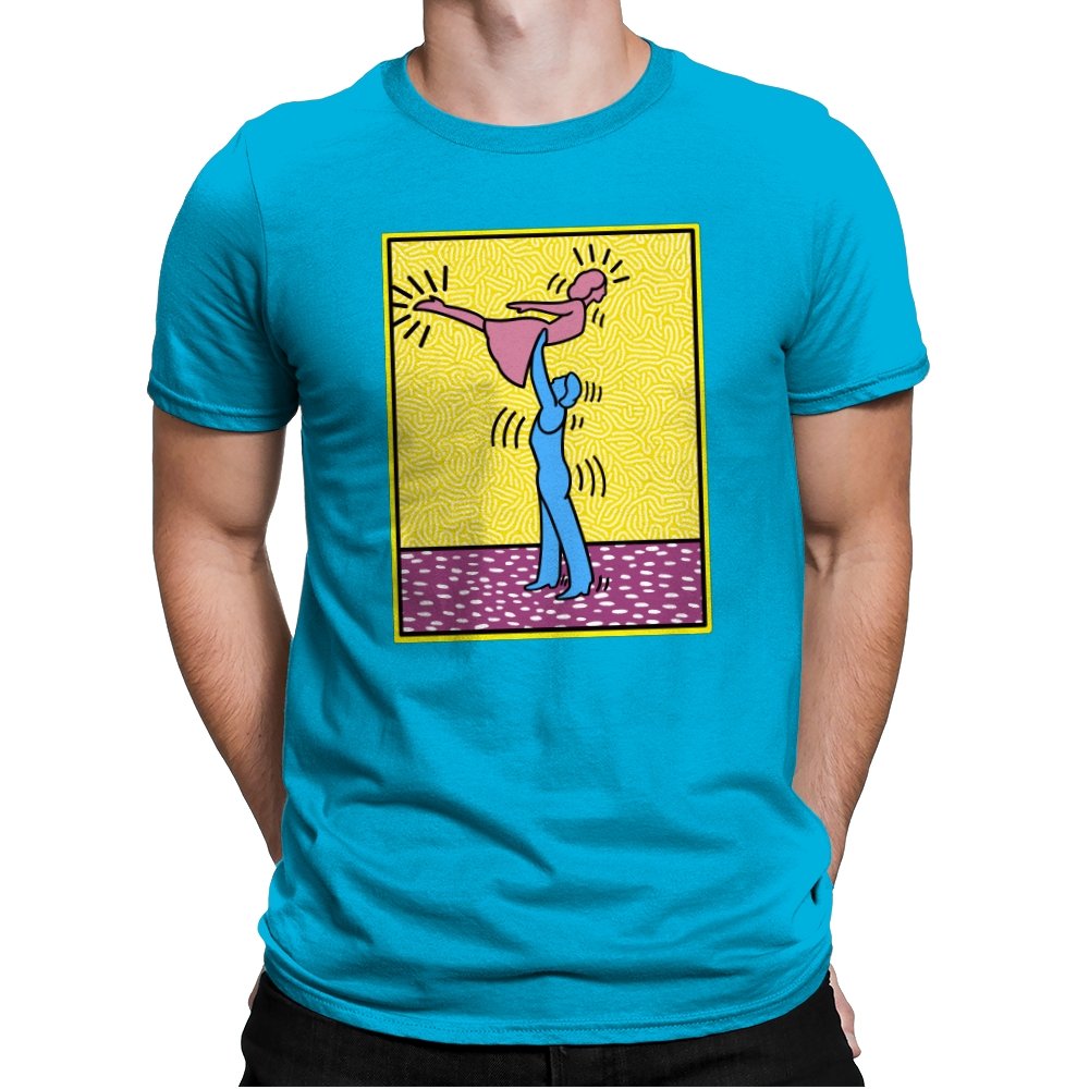 This design freezes a familiar pop-art moment mid-lift, where movement feels both playful and oddly formal. Two simplified figures balance color and motion, like a choreographed joke told with perfect timing. The bright background and thick outlines lean into that knowingly flat, gallery-wall energy. If you recognize the reference, you already understand why the pose matters.