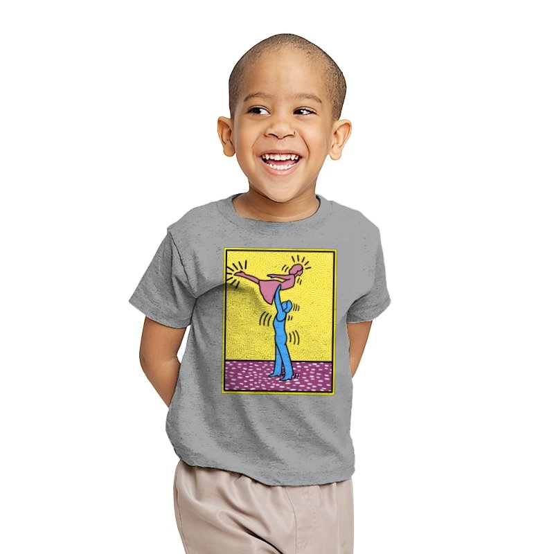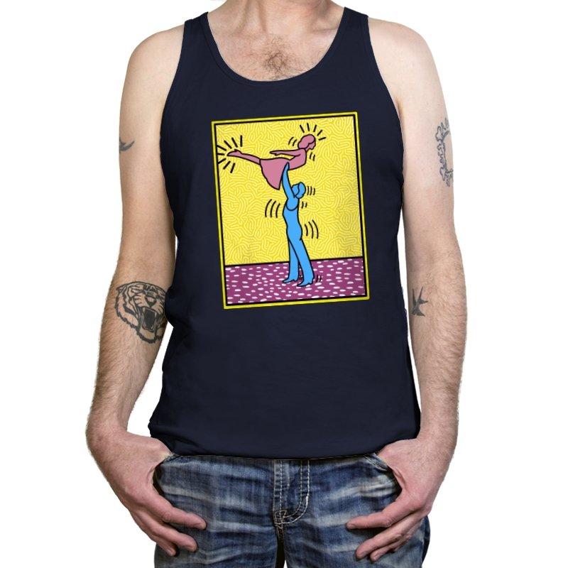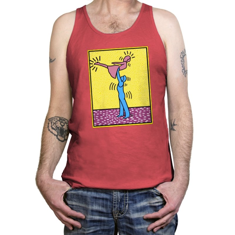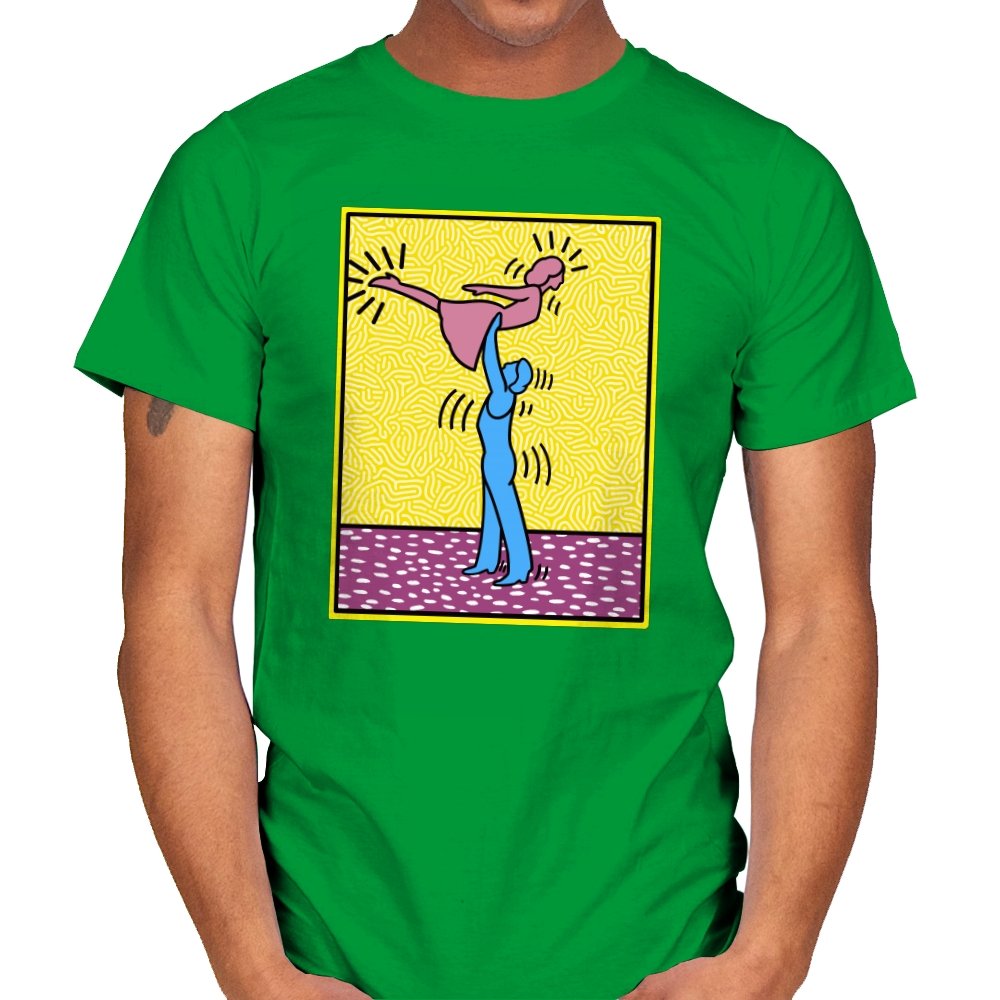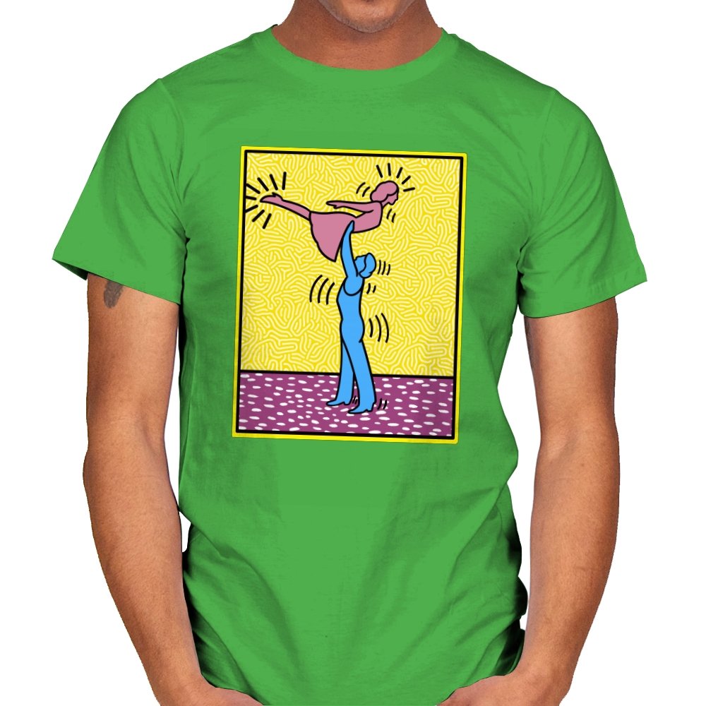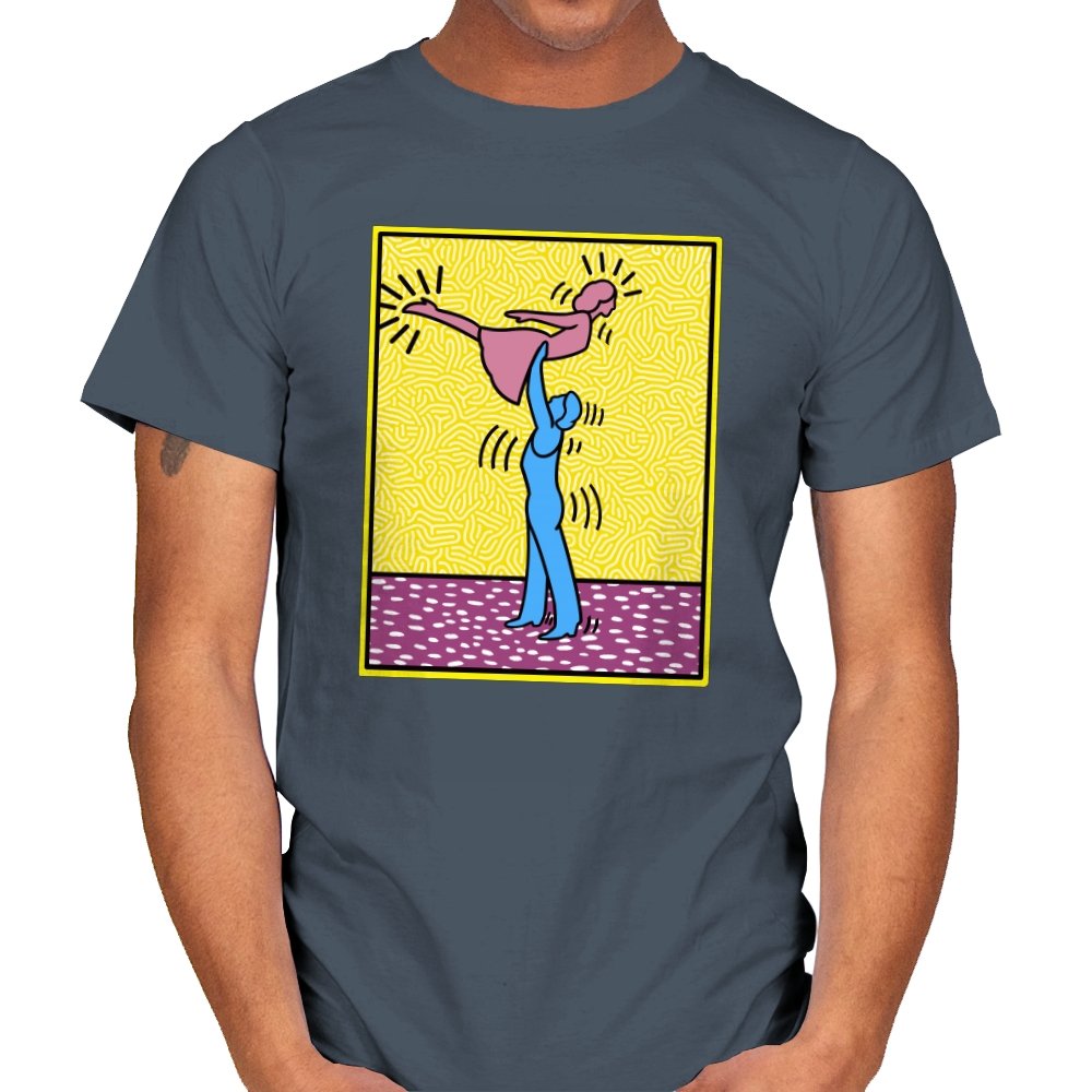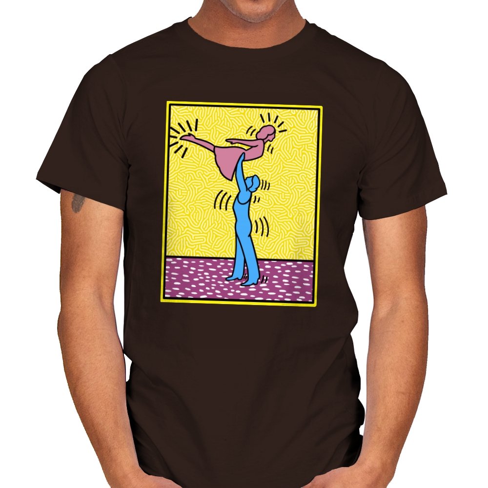 This design freezes a familiar pop-art moment mid-lift, where movement feels both playful and oddly formal. Two simplified figures balance color and motion, like a choreographed joke told with perfect timing. The bright background and thick outlines lean into that knowingly flat, gallery-wall energy. If you recognize the reference, you already understand why the pose matters.