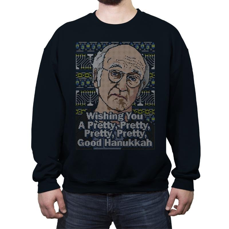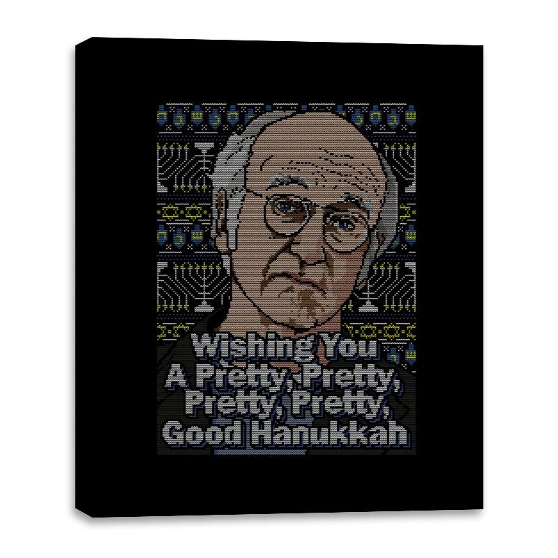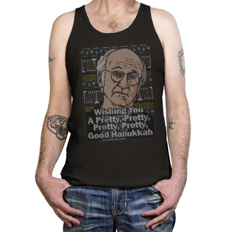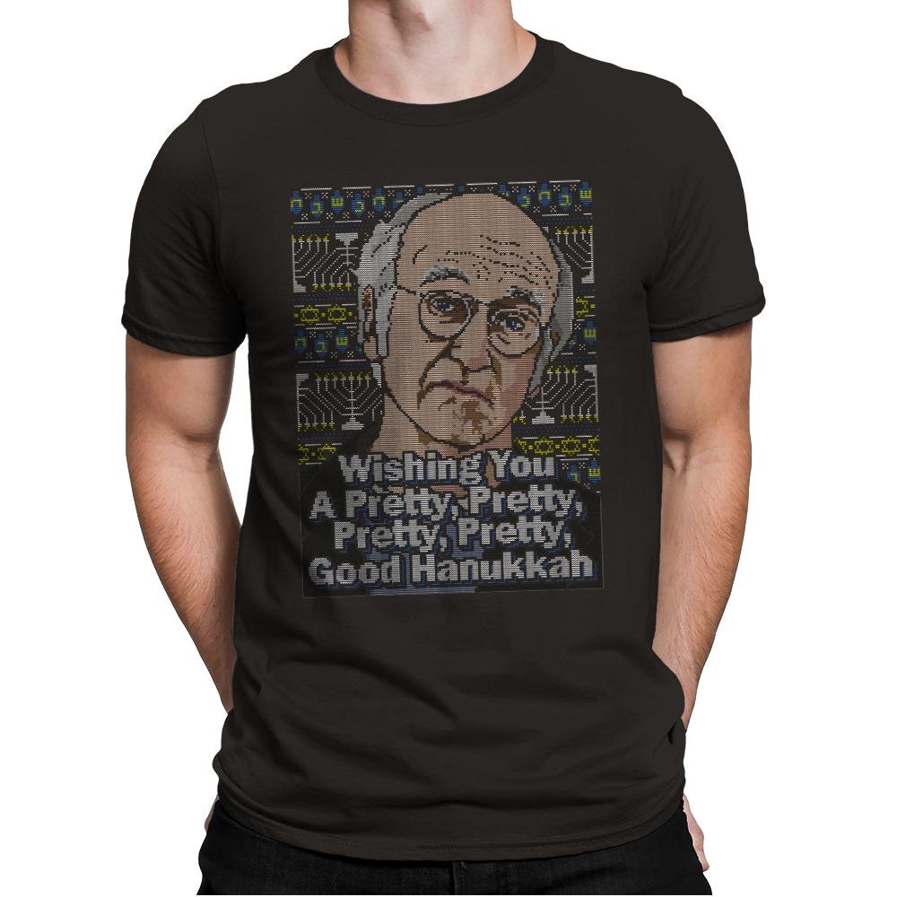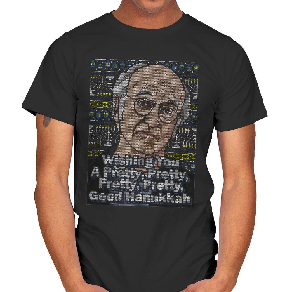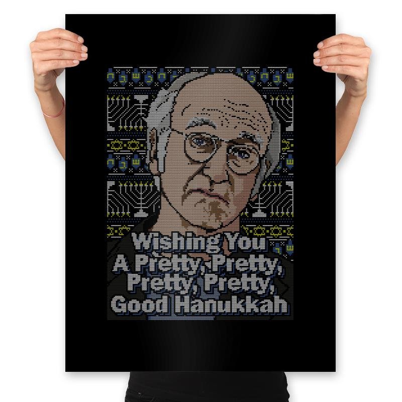 Pretty Good Hanukkah channels the dry charm of a famously grumpy TV personality who can make even holiday cheer sound like a negotiation. The design recreates his unimpressed stare in stitched sweater style, paired with a line that doubles as both a seasonal greeting and a wink to long time fans. Menorahs, dreidels, and patterned borders fill the background, giving the whole piece a cozy but distinctly sarcastic energy.