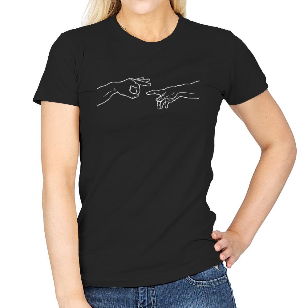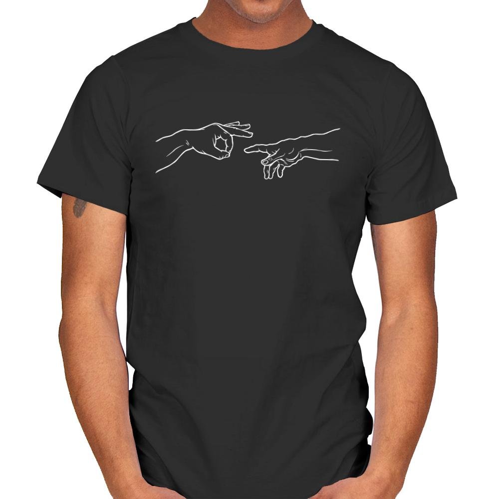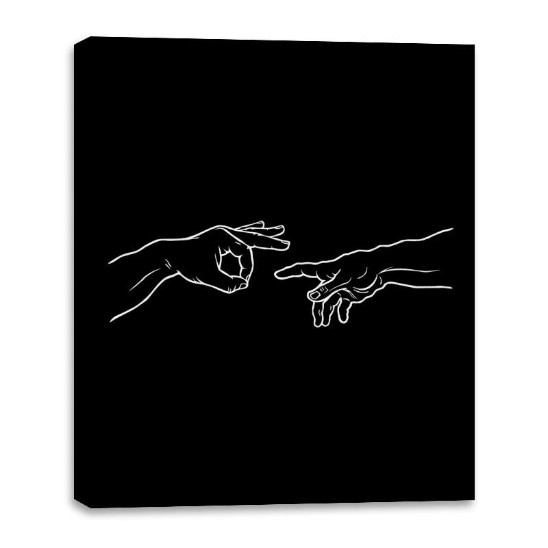 Procreation takes a very old and very serious art theme and flips it into something quietly dumb and clever at the same time. Two hands reach toward one another, outlined in clean white lines against black, but instead of divine drama the moment becomes a playground gag. The joke lands because the pose is so unmistakably art historical, yet the payoff is pure middle school mischief. Anyone who knows both references will smirk as soon as they spot it.