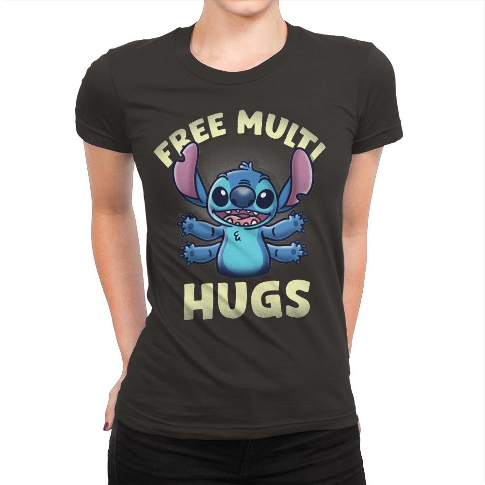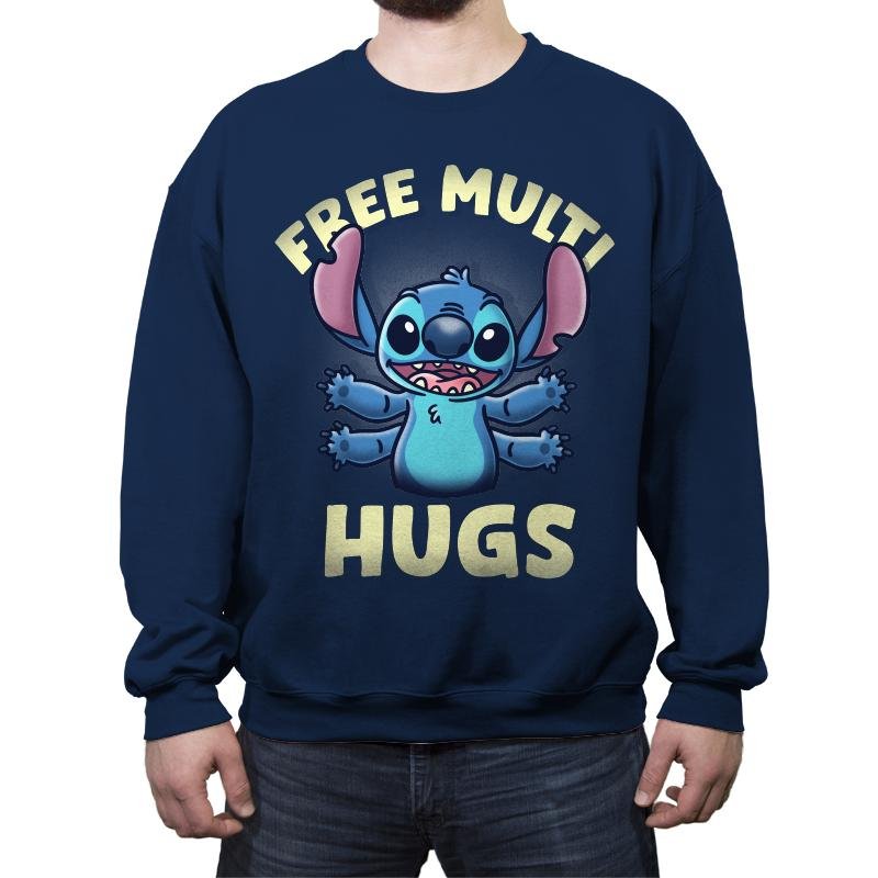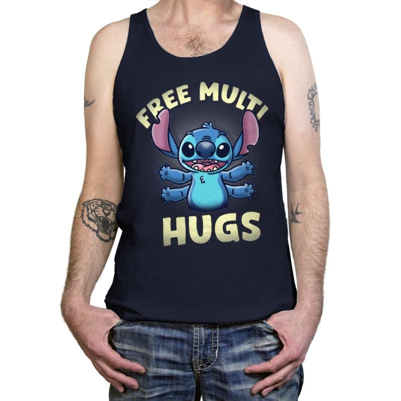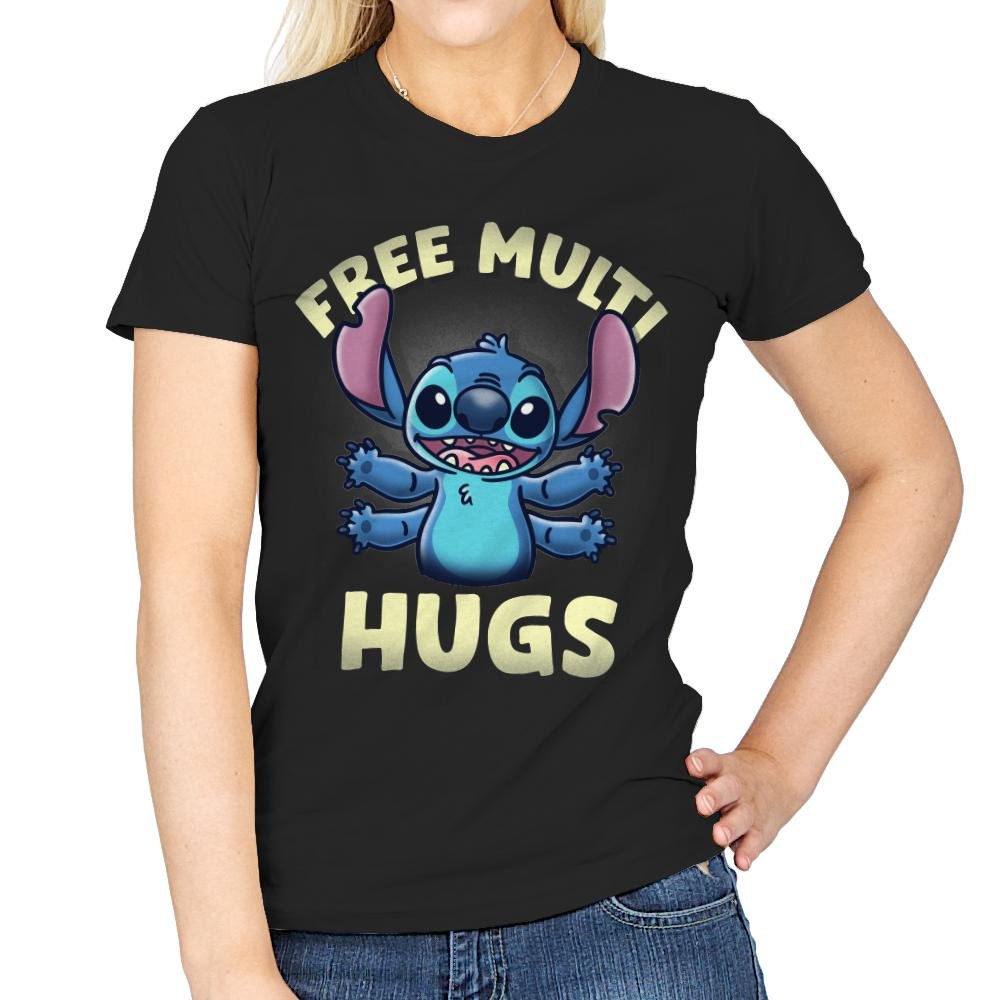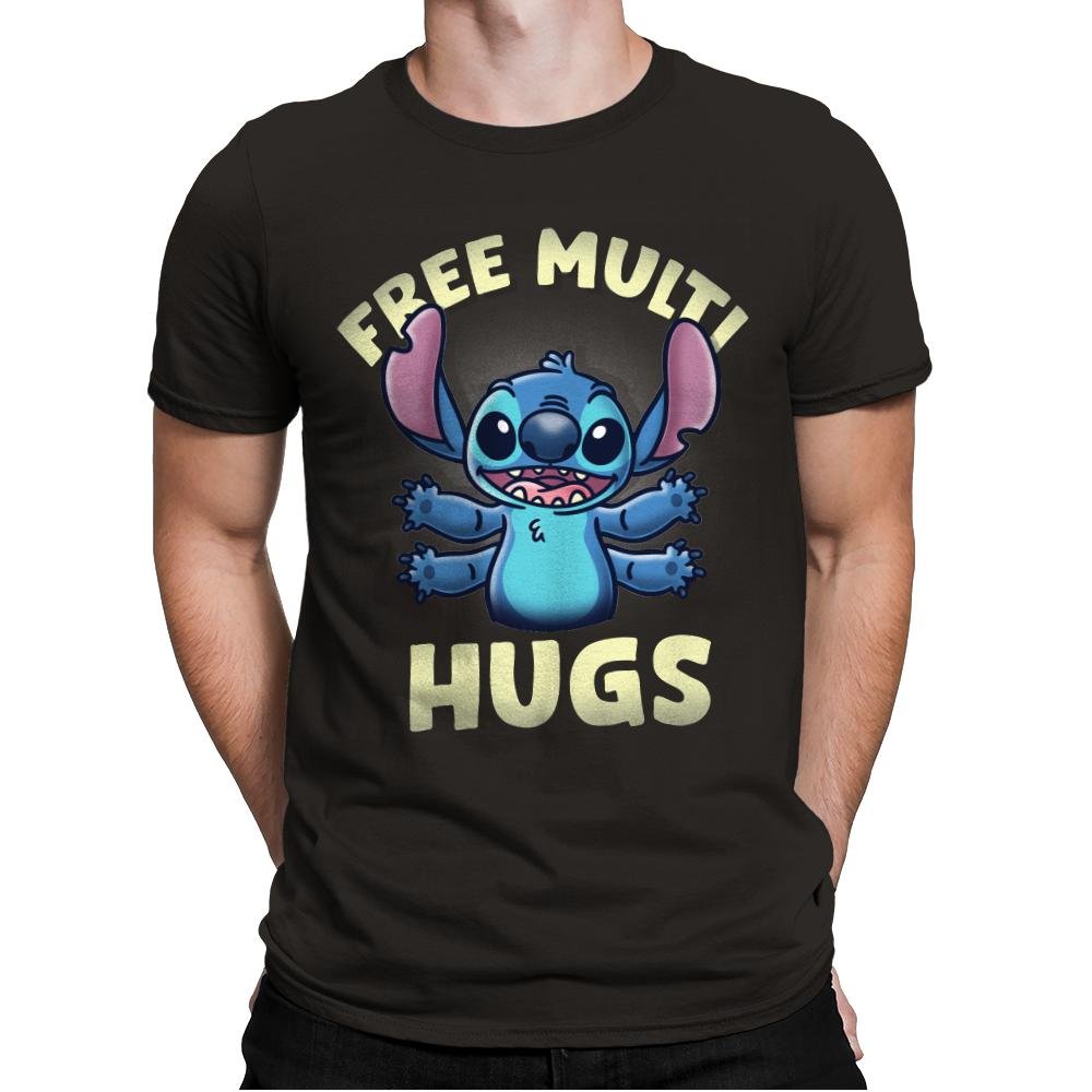 This design brings the beloved alien Stitch to life with a playful twist, offering “FREE MULTI HUGS” to all who appreciate his quirky charm. The cheerful blue character, with arms wide open, invites everyone for a fun and free hug, complete with his signature ears and wide-eyed smile. The bold lettering emphasizes the lighthearted, friendly nature of the design, making it perfect for fans who enjoy a dose of cute, feel-good energy.