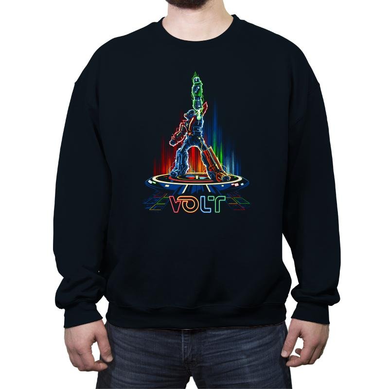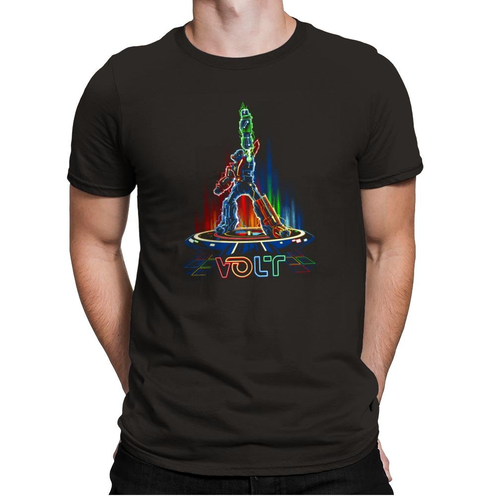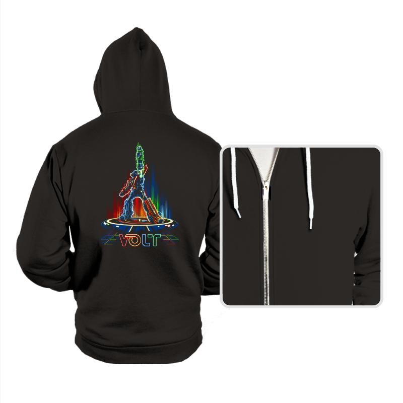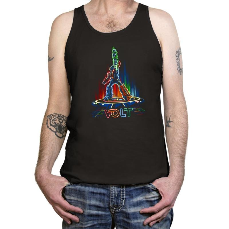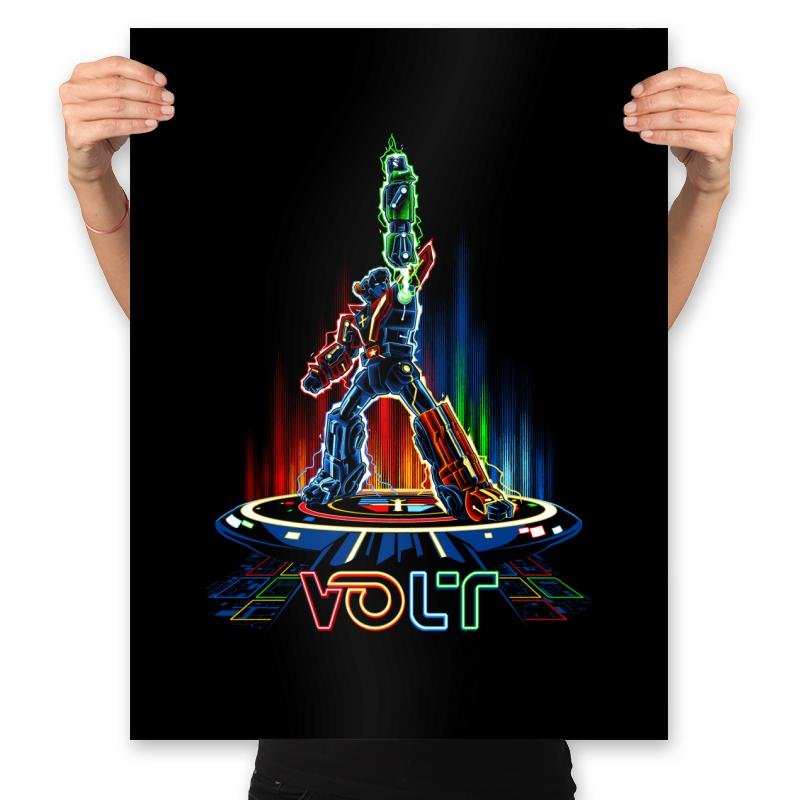 This design freezes the exact second when separate forces lock into something larger. A towering figure stands centered on a glowing platform, arm raised, outlined in sharp neon lines that feel pulled straight from an arcade cabinet. The color bands behind it read like sound waves or power levels, giving the whole scene a charged, digital pulse. If you grew up recognizing that pose instantly, this one speaks your language without explaining itself.