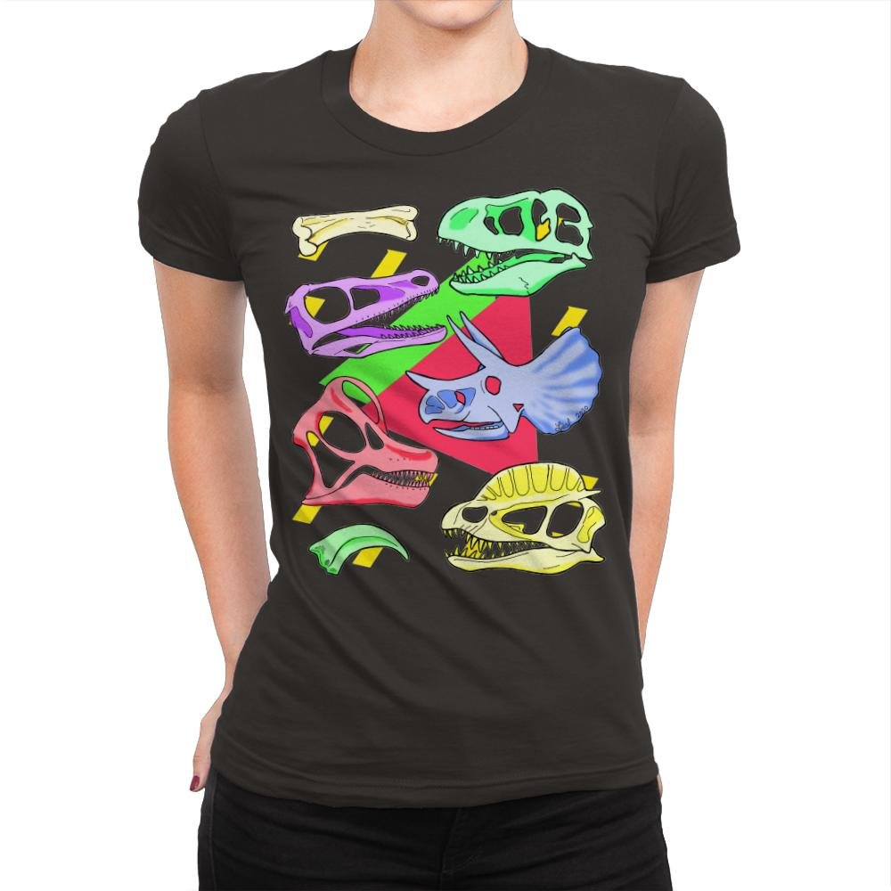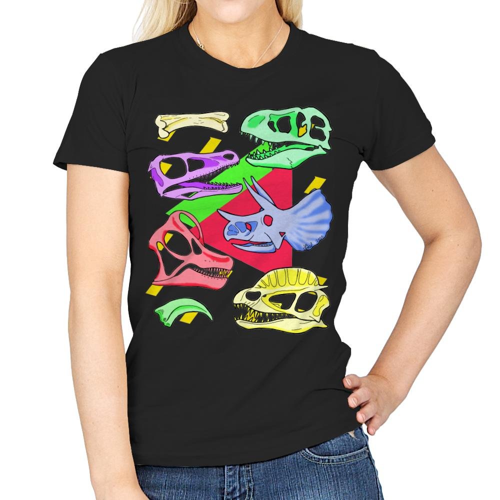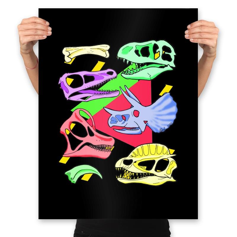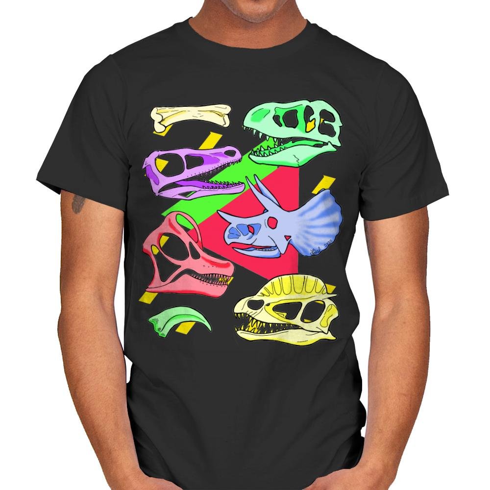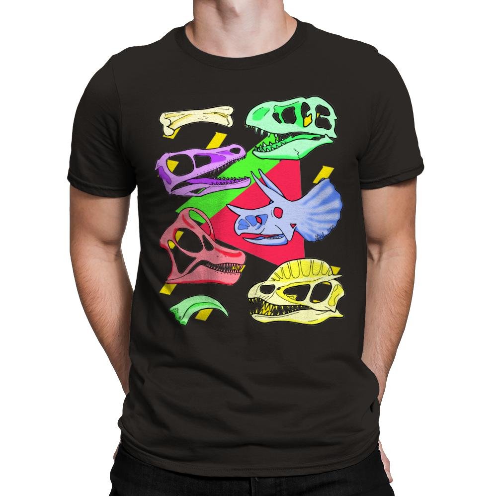 This design takes a bold, colorful approach to the iconic imagery of dinosaur skulls, giving them a modern twist. The bright neon hues pink, yellow, blue, and green pop against a black backdrop, transforming prehistoric fossils into vibrant, eye catching art. The overlapping skulls create an energetic composition that’s both fun and edgy, making this design a perfect blend of vintage and contemporary style. It’s an exciting way to express your love for dinosaurs while embracing a pop-art aesthetic.