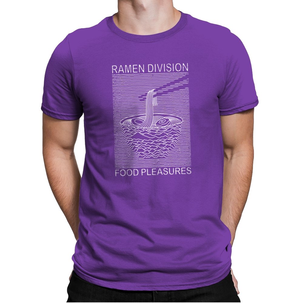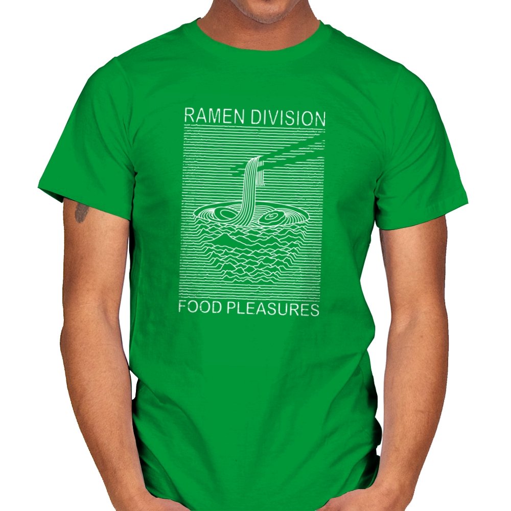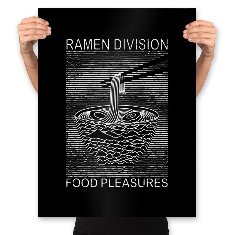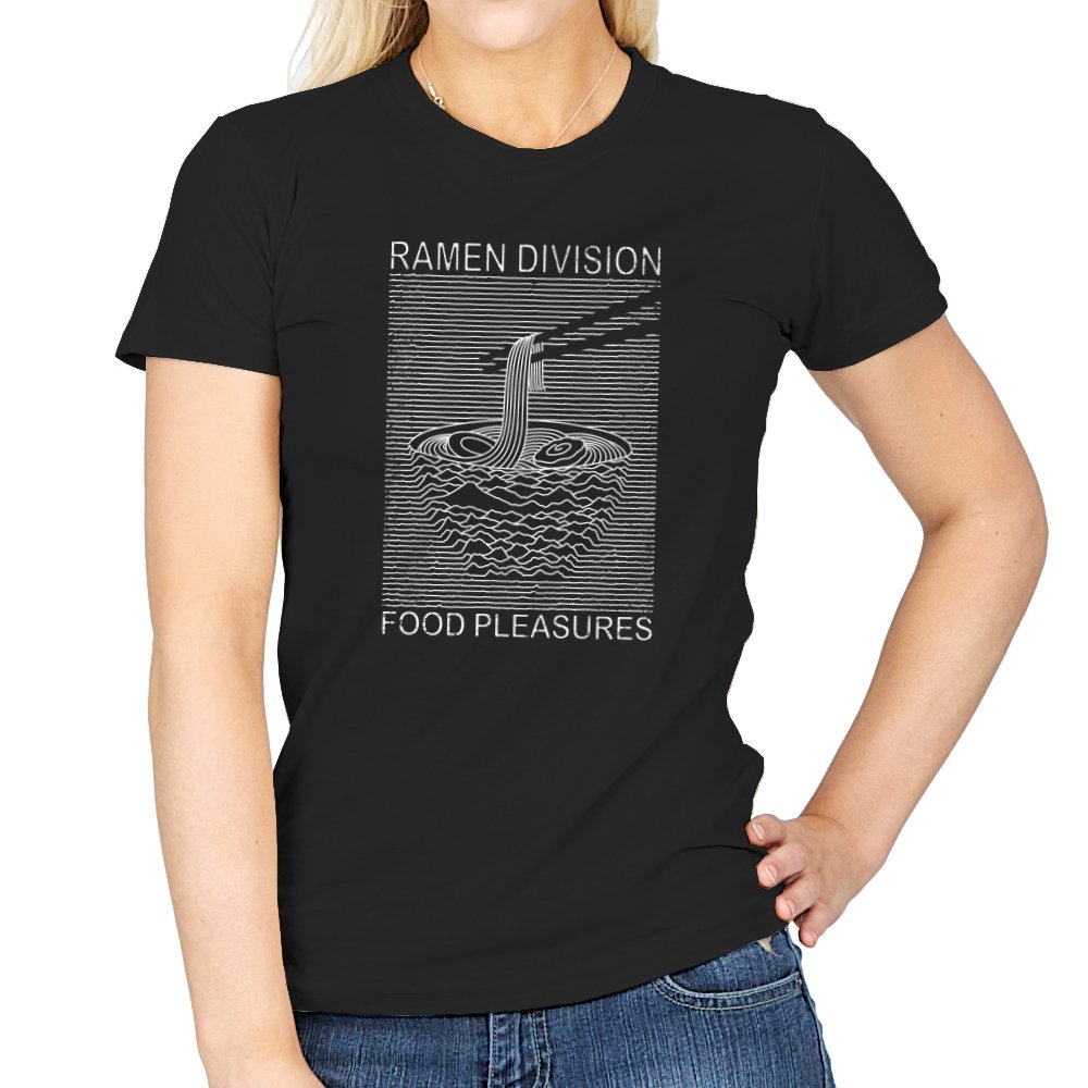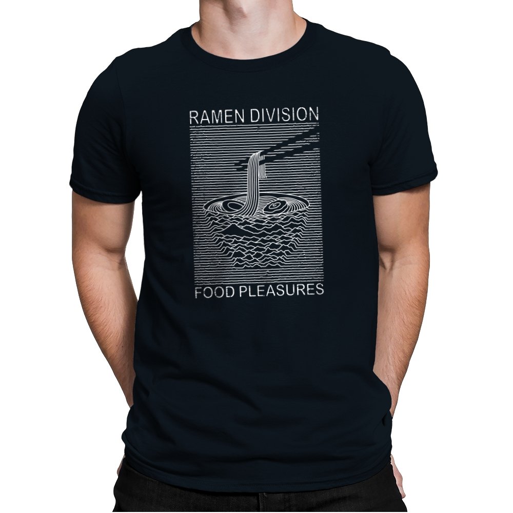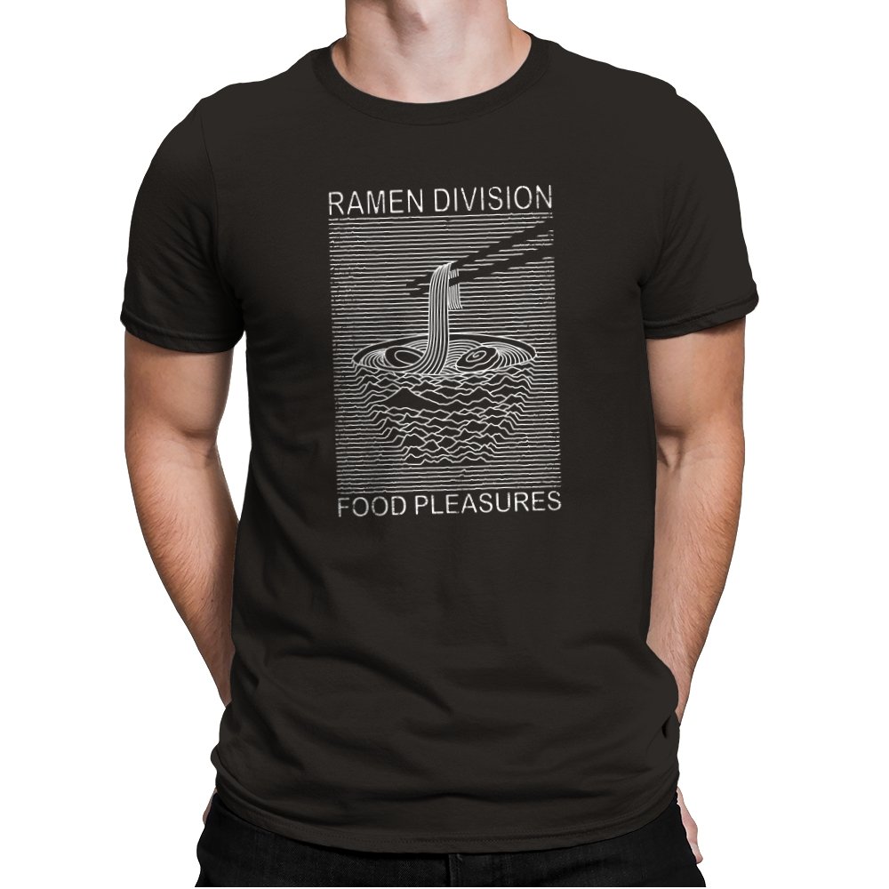 The design features a minimalist, black-and-white illustration of a ramen bowl with noodles rising in a dynamic, wavy motion. The line work creates a sense of movement, making the steam and noodles come alive. The phrase “Ramen Division” at the top and “Food Pleasures” at the bottom anchor the theme, focusing on the joy of indulging in comfort food. This design combines the simplicity of Japanese culinary culture with the edgy feel of contemporary art, making it perfect for fans who appreciate both food and style.