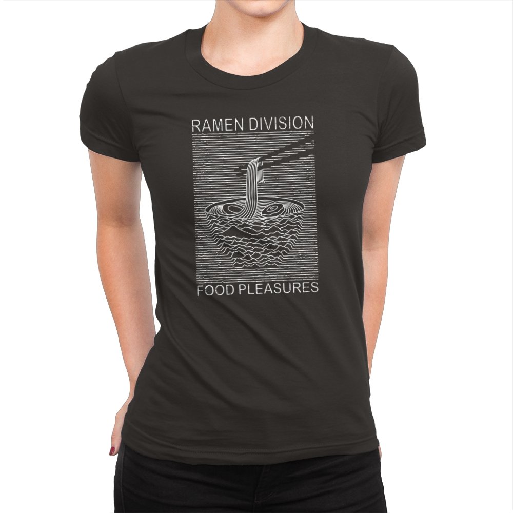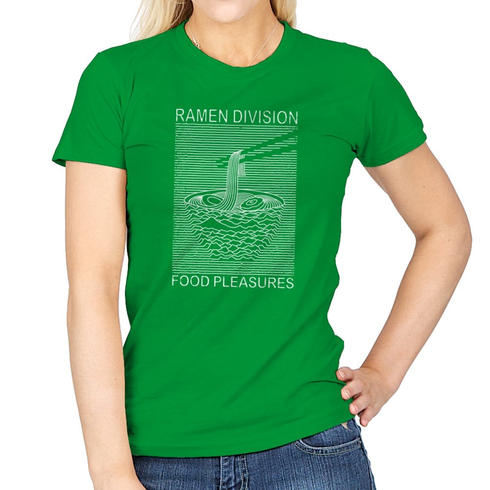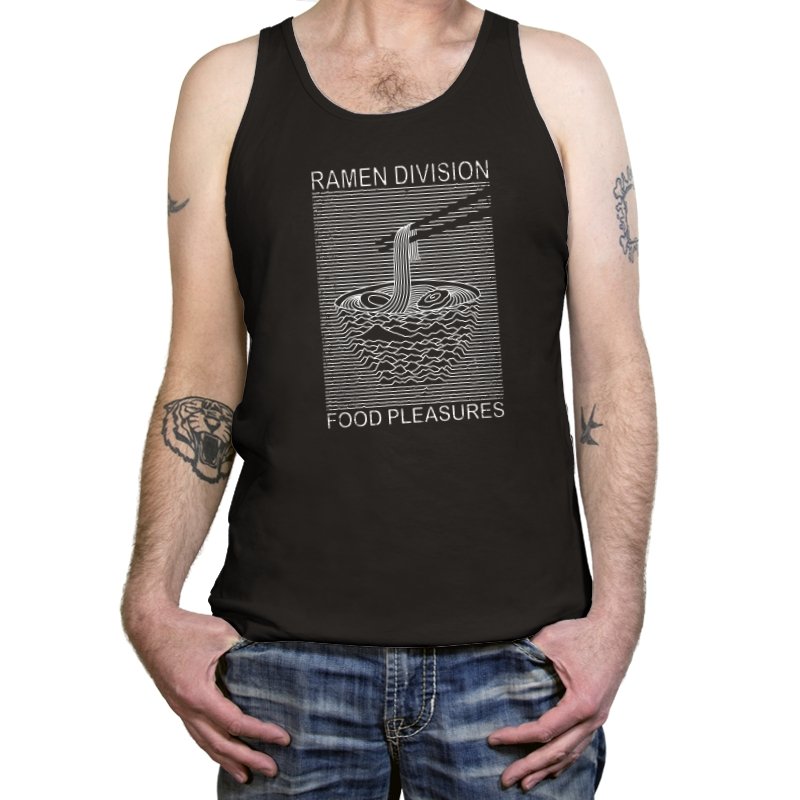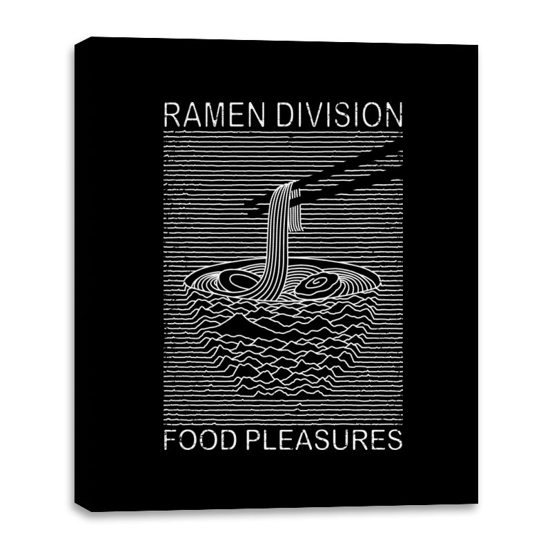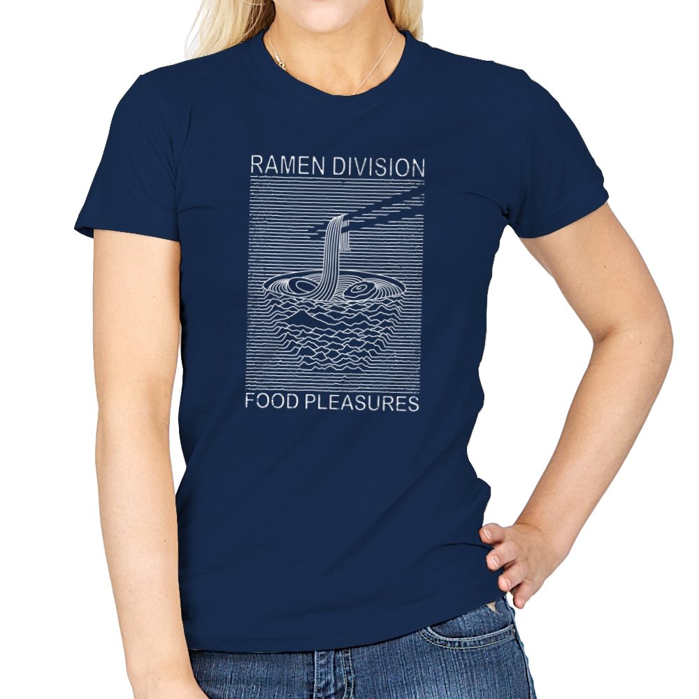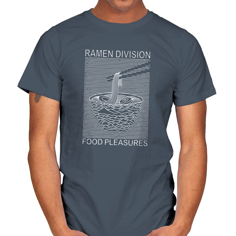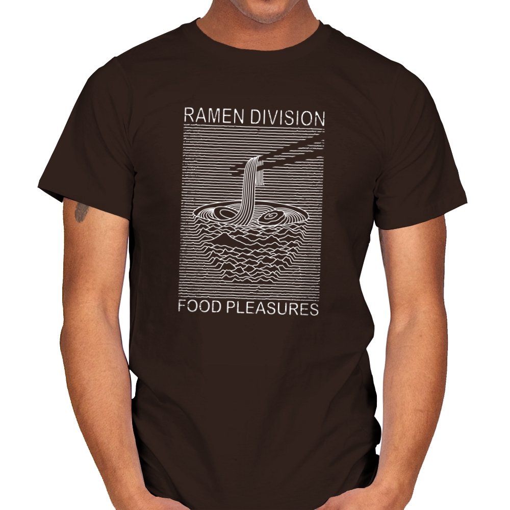 The design features a minimalist, black-and-white illustration of a ramen bowl with noodles rising in a dynamic, wavy motion. The line work creates a sense of movement, making the steam and noodles come alive. The phrase “Ramen Division” at the top and “Food Pleasures” at the bottom anchor the theme, focusing on the joy of indulging in comfort food. This design combines the simplicity of Japanese culinary culture with the edgy feel of contemporary art, making it perfect for fans who appreciate both food and style.