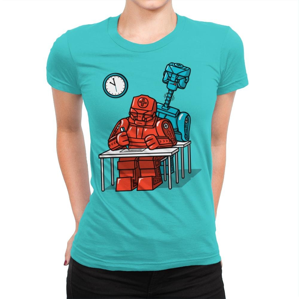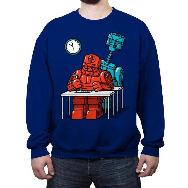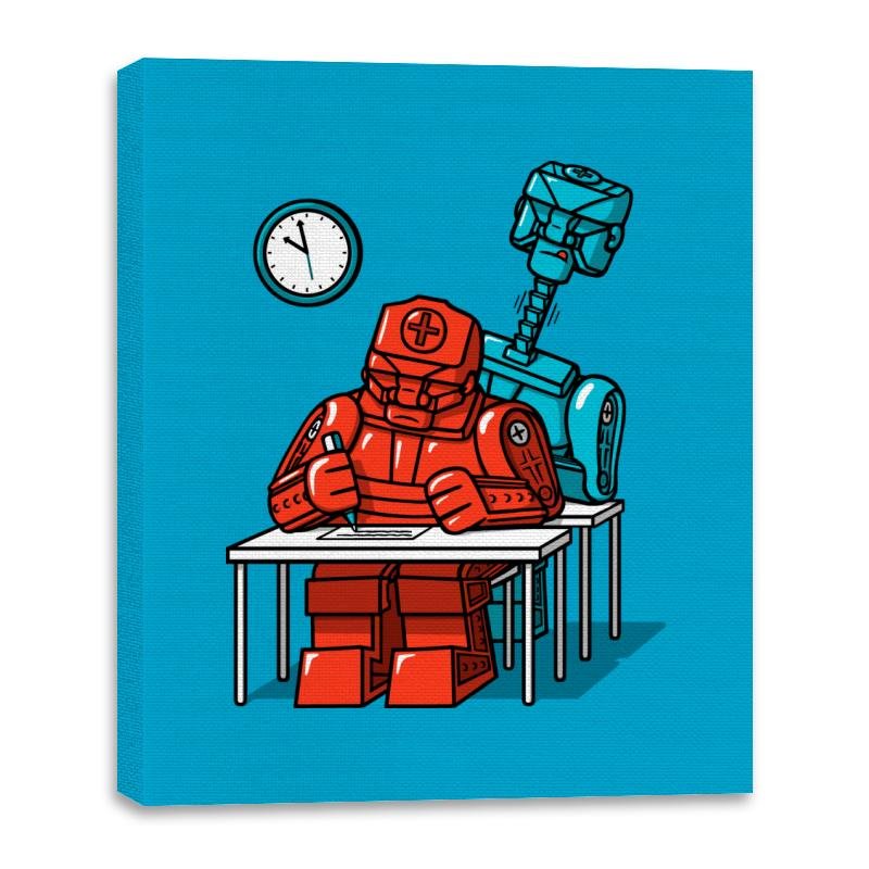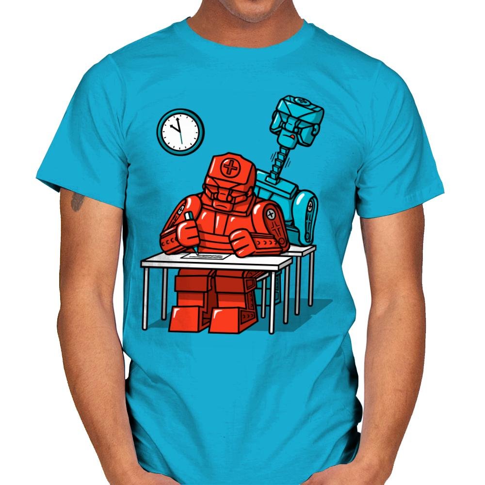 This design captures a tense classroom moment rendered entirely in clean, blocky robotics. A red medical-style robot hunches over a test paper, while a taller blue machine looms behind like a watchful proctor, clock ticking on the wall. The flat colors and sharp outlines give it a toy-brick logic that contrasts nicely with the very human anxiety of exams. Fans immediately recognize the quiet joke about pressure, programming, and performance.
