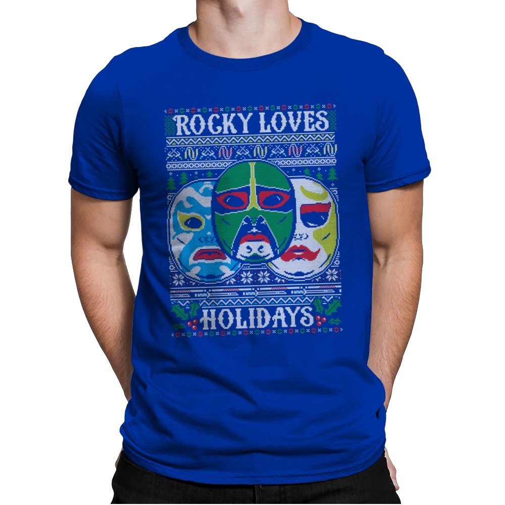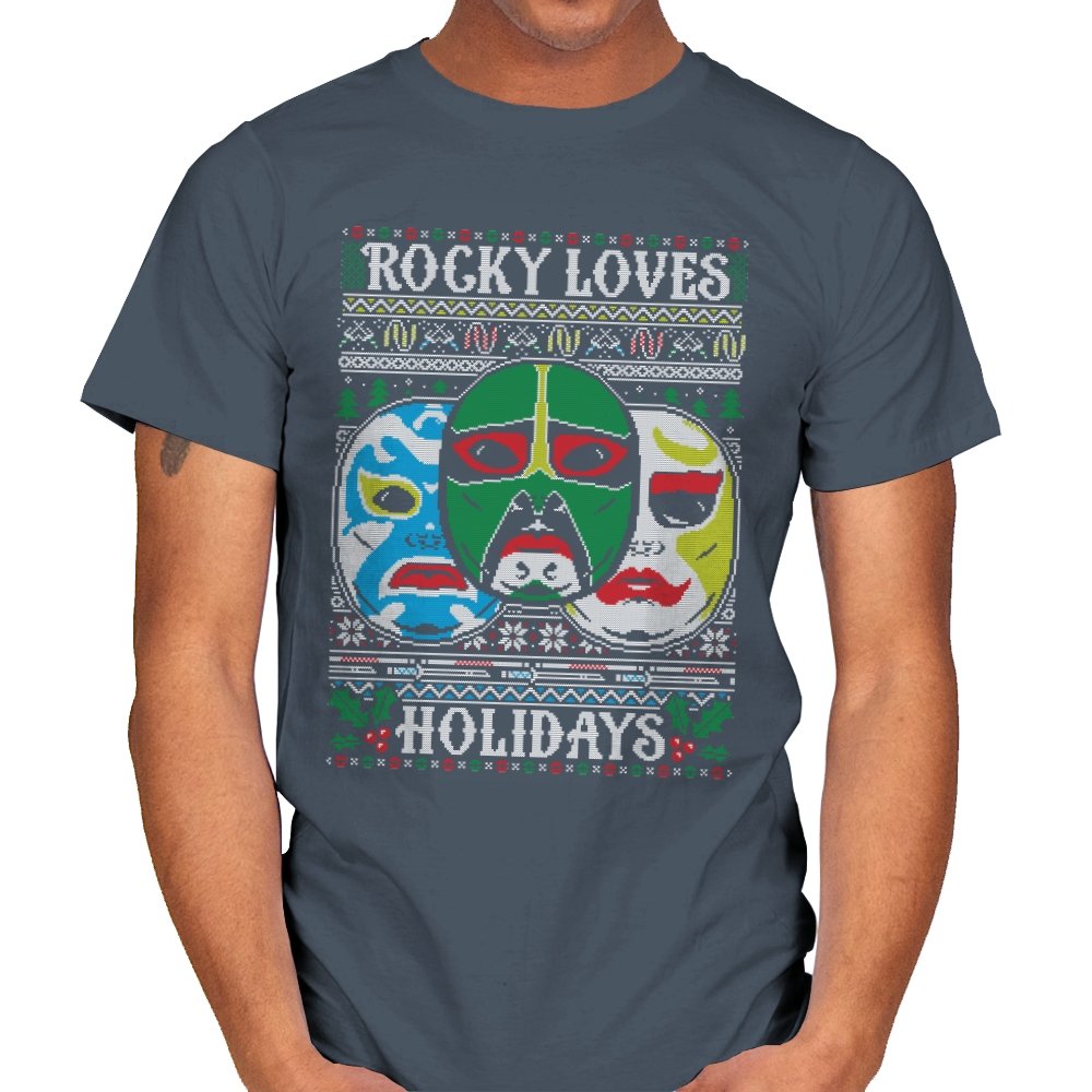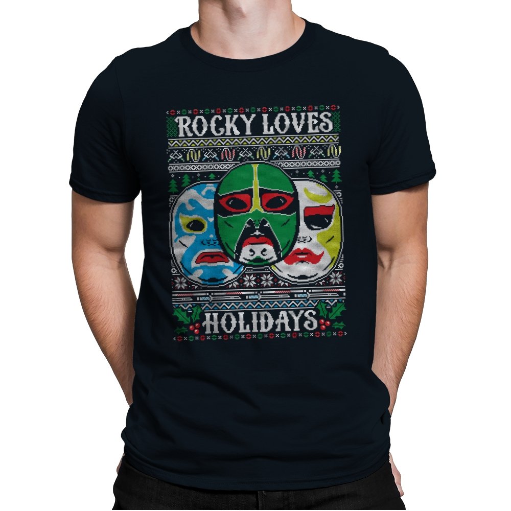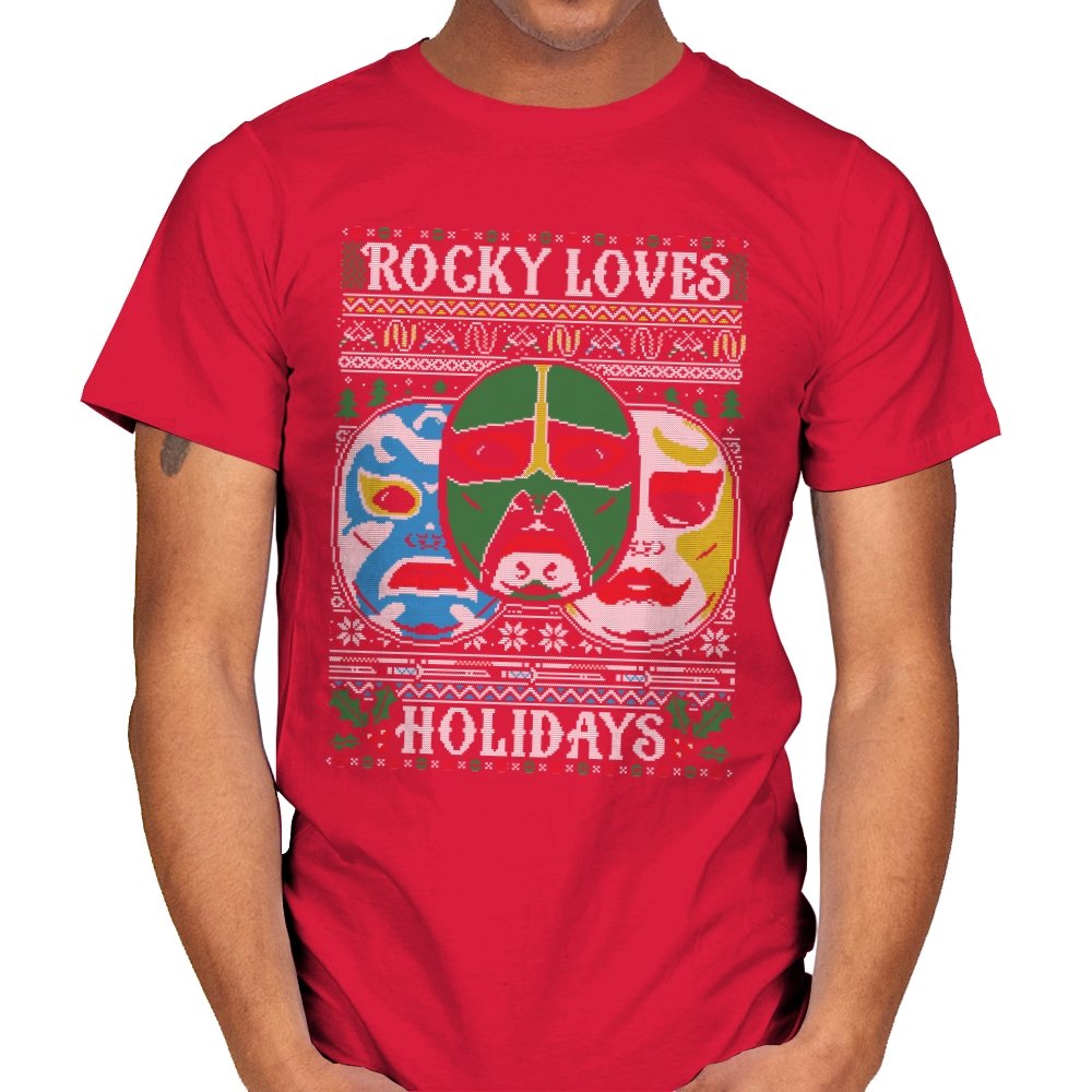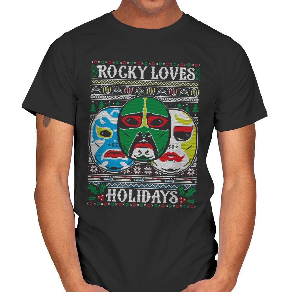 This design wraps classic lucha iconography in full ugly holiday sweater form. Three masked faces sit front and center, framed by dense knit patterns, snowflake motifs, and bold green that leans hard into festive excess. The central mask anchors the composition, flanked by contrasting expressions that feel pulled straight from vintage wrestling posters and late-night TV memories. If you grew up flipping channels or collecting figures, the reference hits instantly.