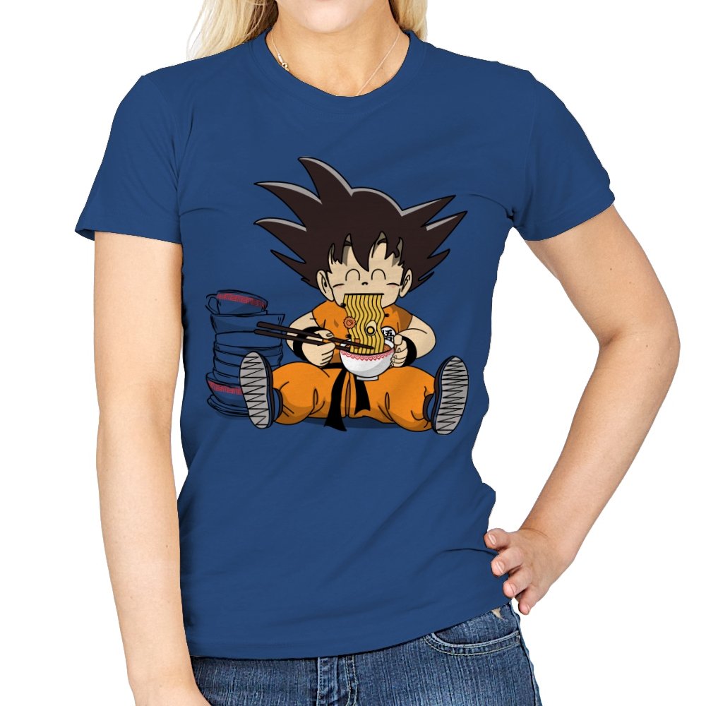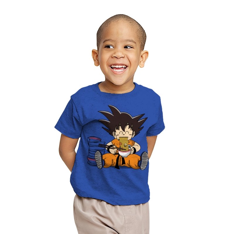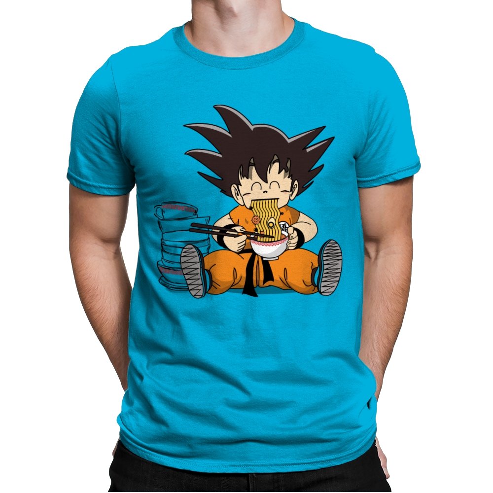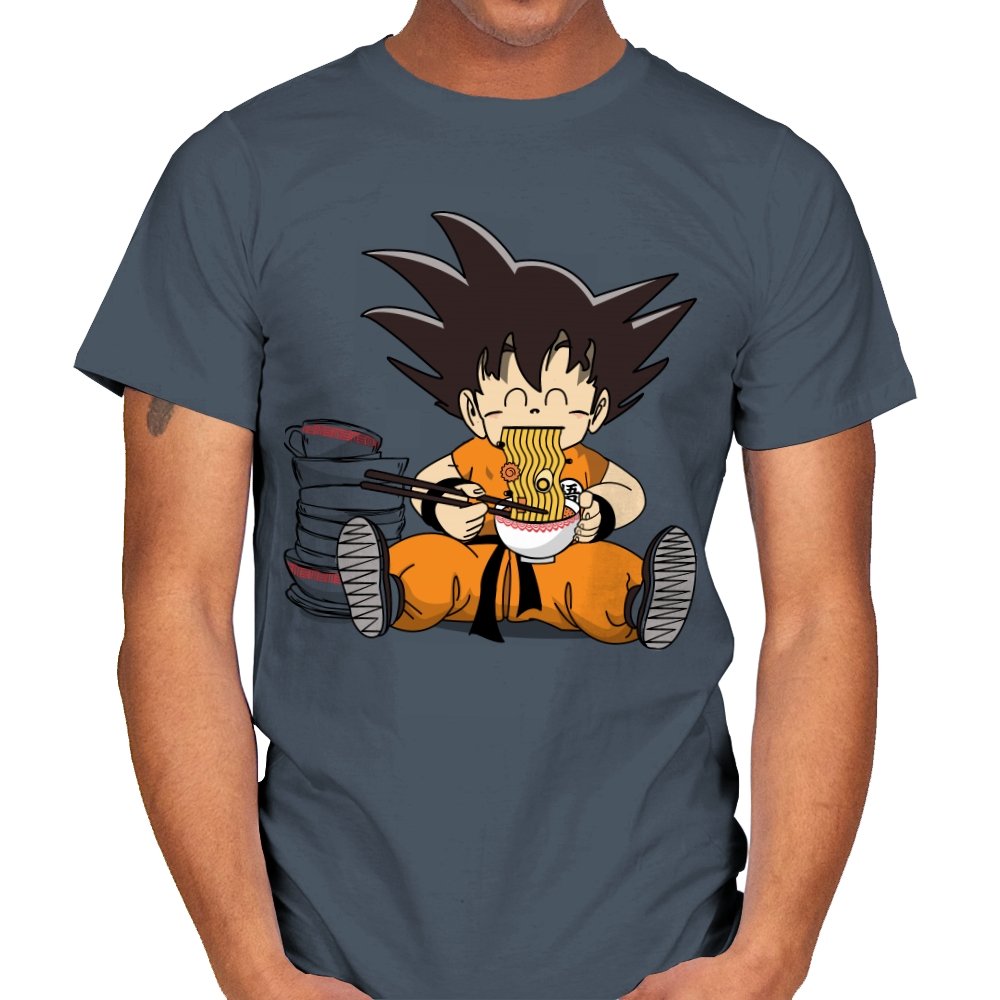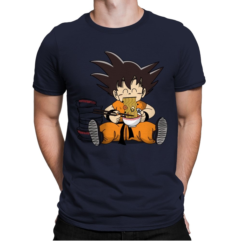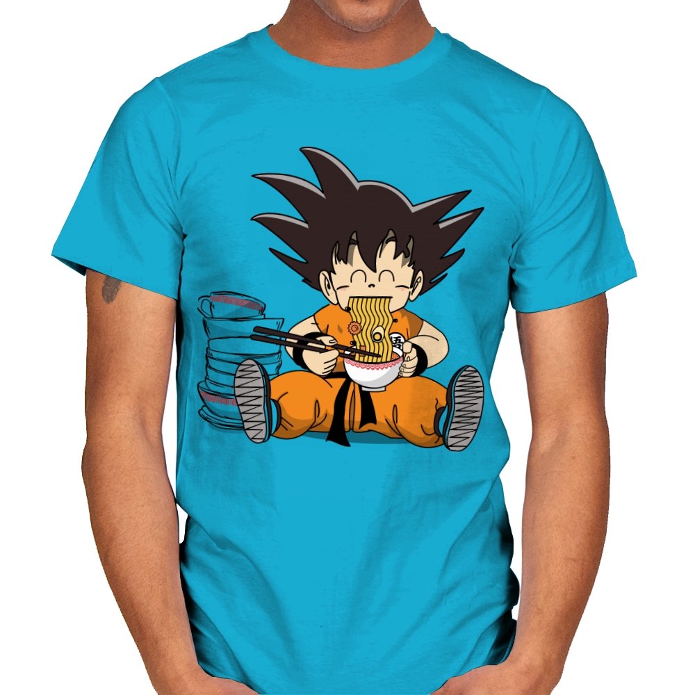 This design shows a small, wide eyed martial prodigy seated on the floor, happily slurping noodles with chopsticks and surrounded by towering stacks of empty bowls. The contrast between childlike calm and legendary appetite is the entire joke, rendered in clean lines and soft colors that echo classic animation styles. Nothing is in motion except the meal itself, which feels endless by design. It captures a quiet moment before power levels, training arcs, and cosmic stakes take over.
