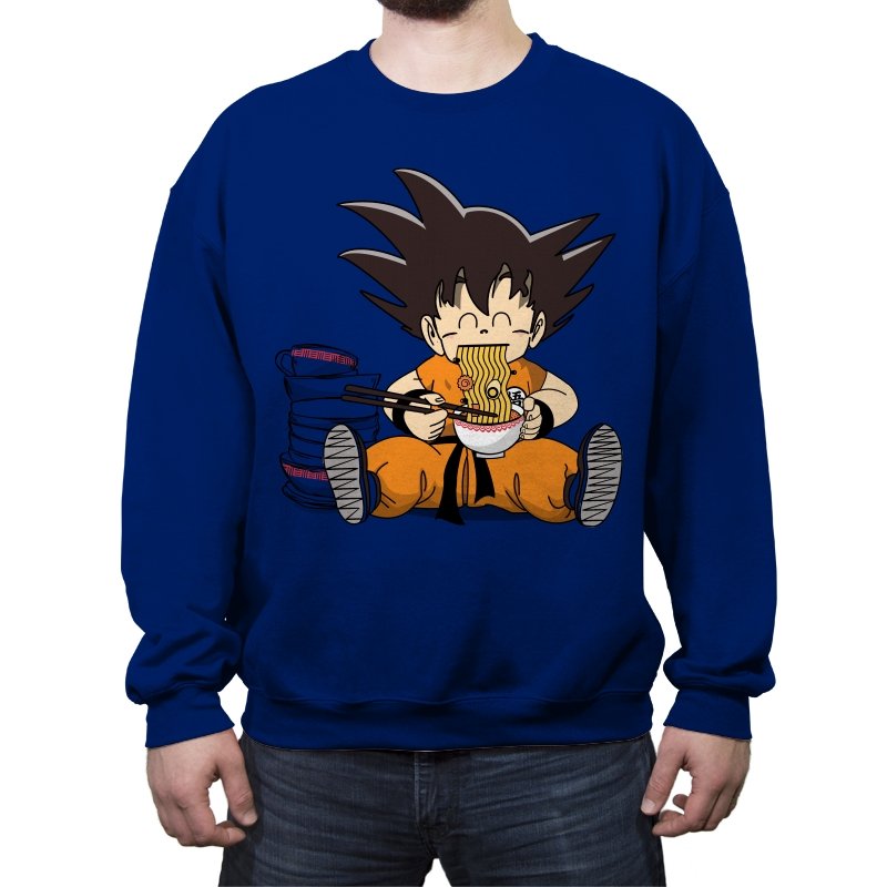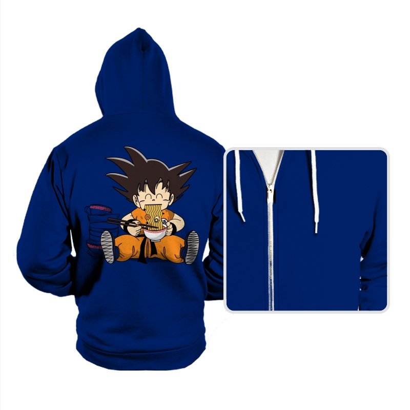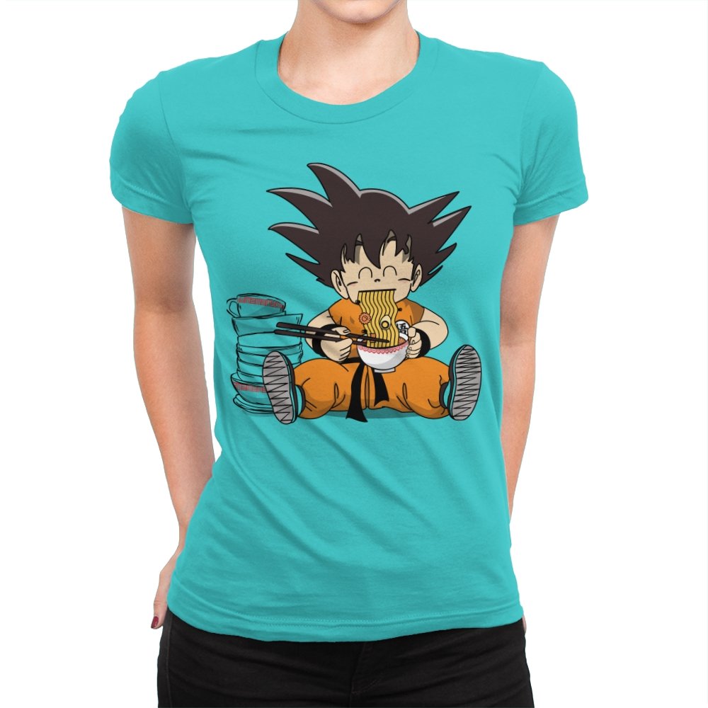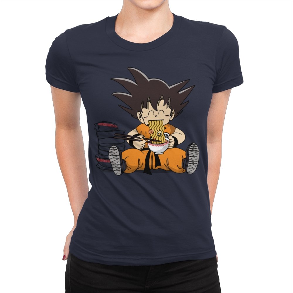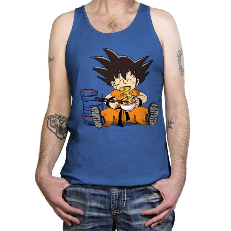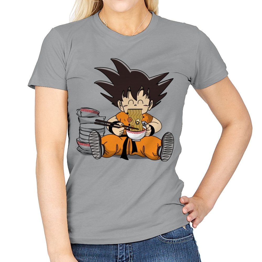 This design shows a small, wide eyed martial prodigy seated on the floor, happily slurping noodles with chopsticks and surrounded by towering stacks of empty bowls. The contrast between childlike calm and legendary appetite is the entire joke, rendered in clean lines and soft colors that echo classic animation styles. Nothing is in motion except the meal itself, which feels endless by design. It captures a quiet moment before power levels, training arcs, and cosmic stakes take over.