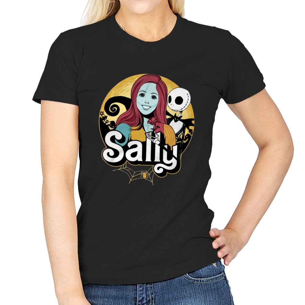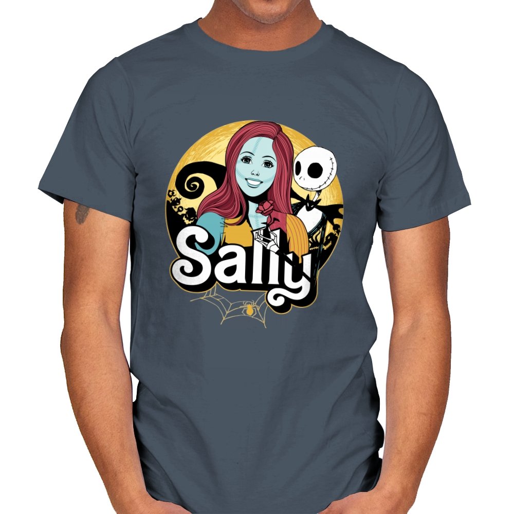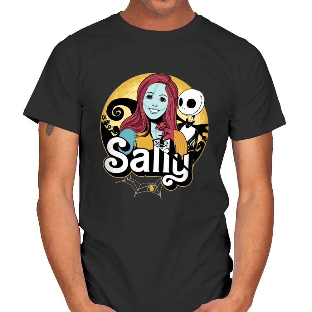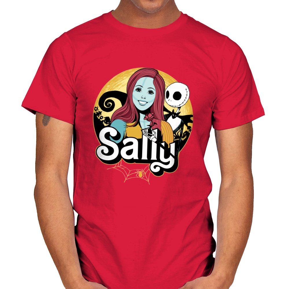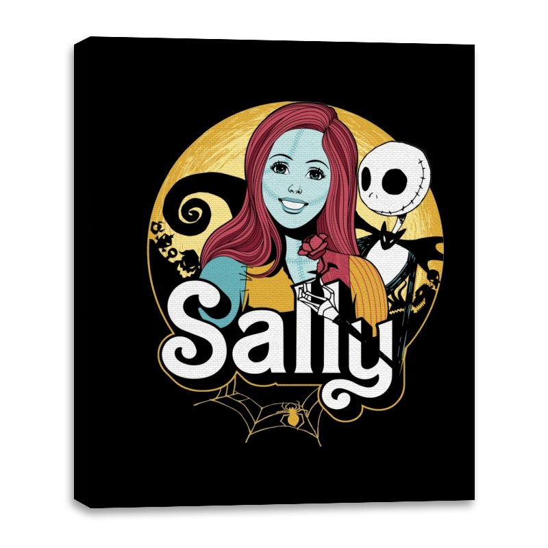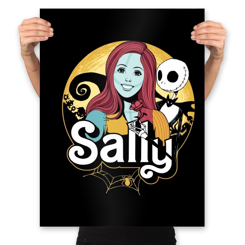 Sally centers a stitched romantic heroine against a round harvest moon. Her blue skin, red hair, and patchwork dress are rendered with a softer realism than usual, as if filtered through a vintage illustrated portrait. Behind her, a lanky skeleton figure lurks in silhouette, framed by curling hills and tiny pumpkins that instantly signal the town where Halloween never ends. Spiders and webs hide at the bottom, tying the whole layout together without stealing focus.