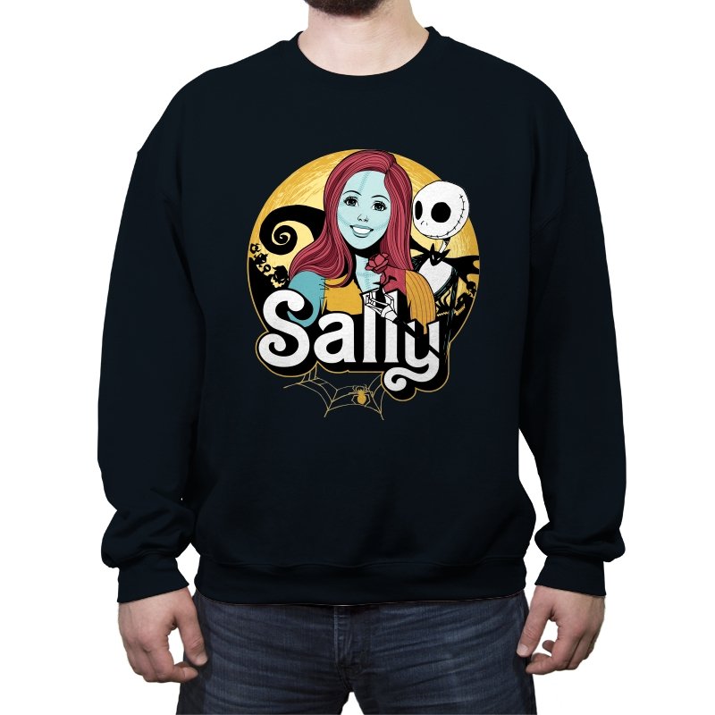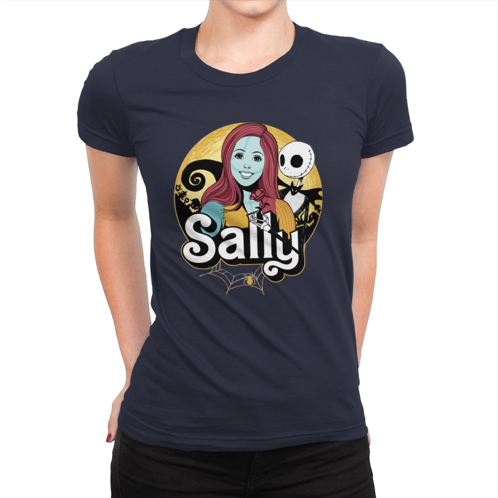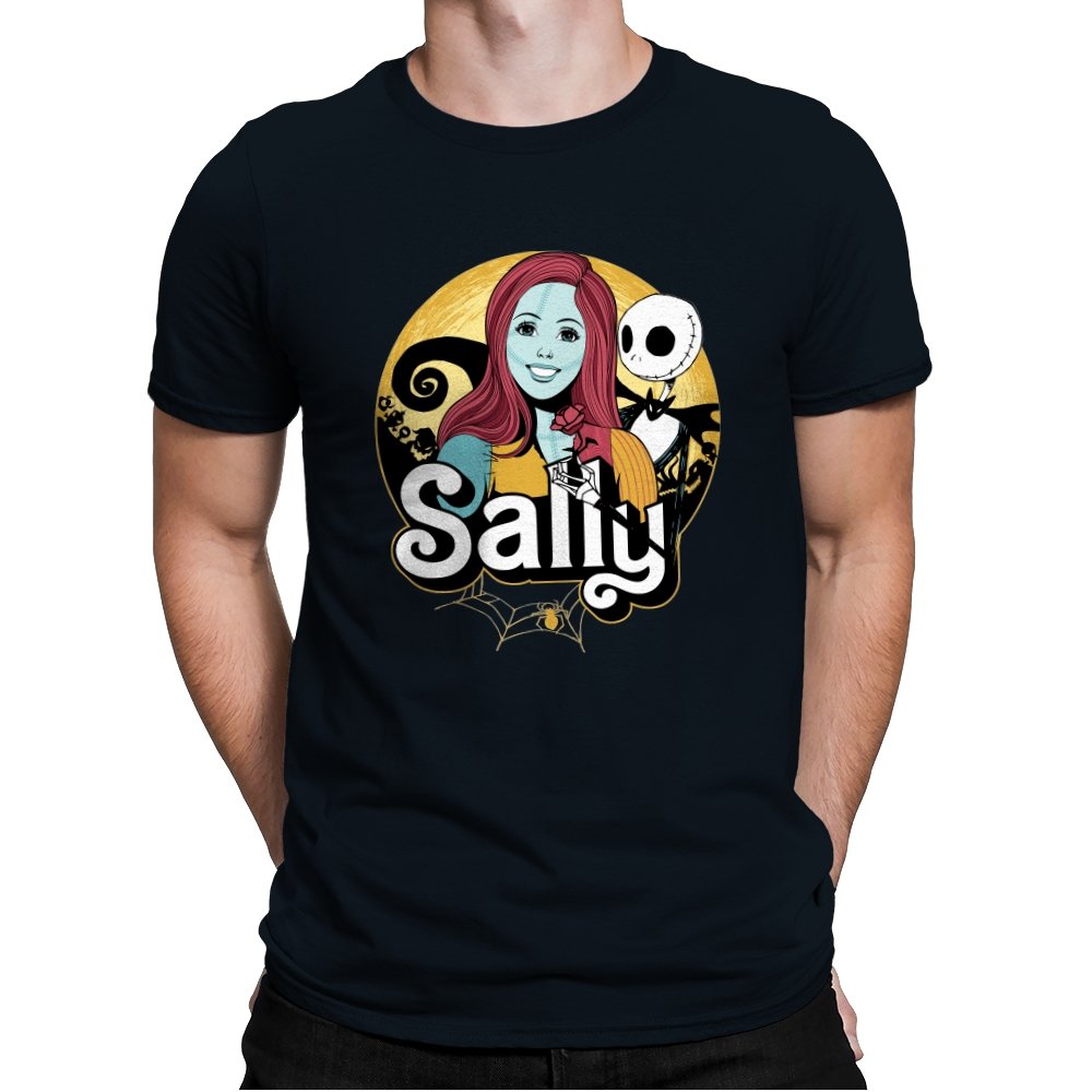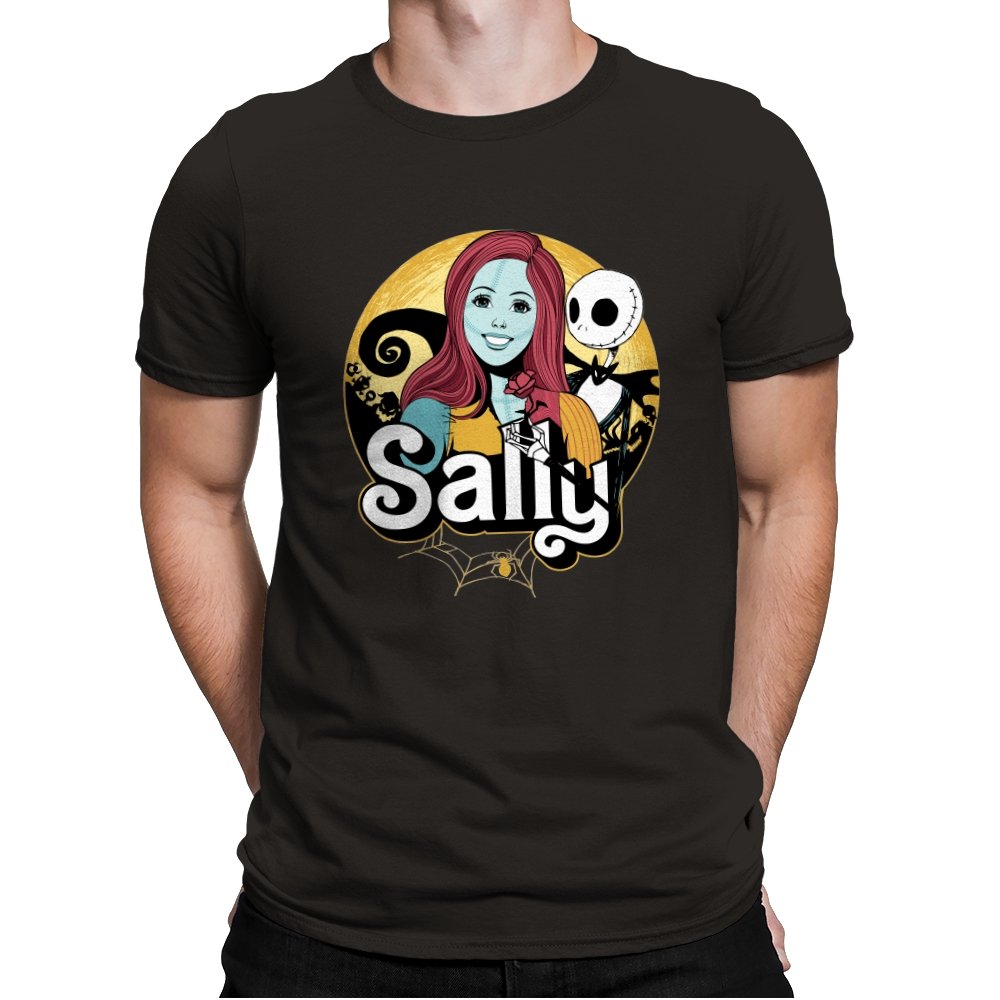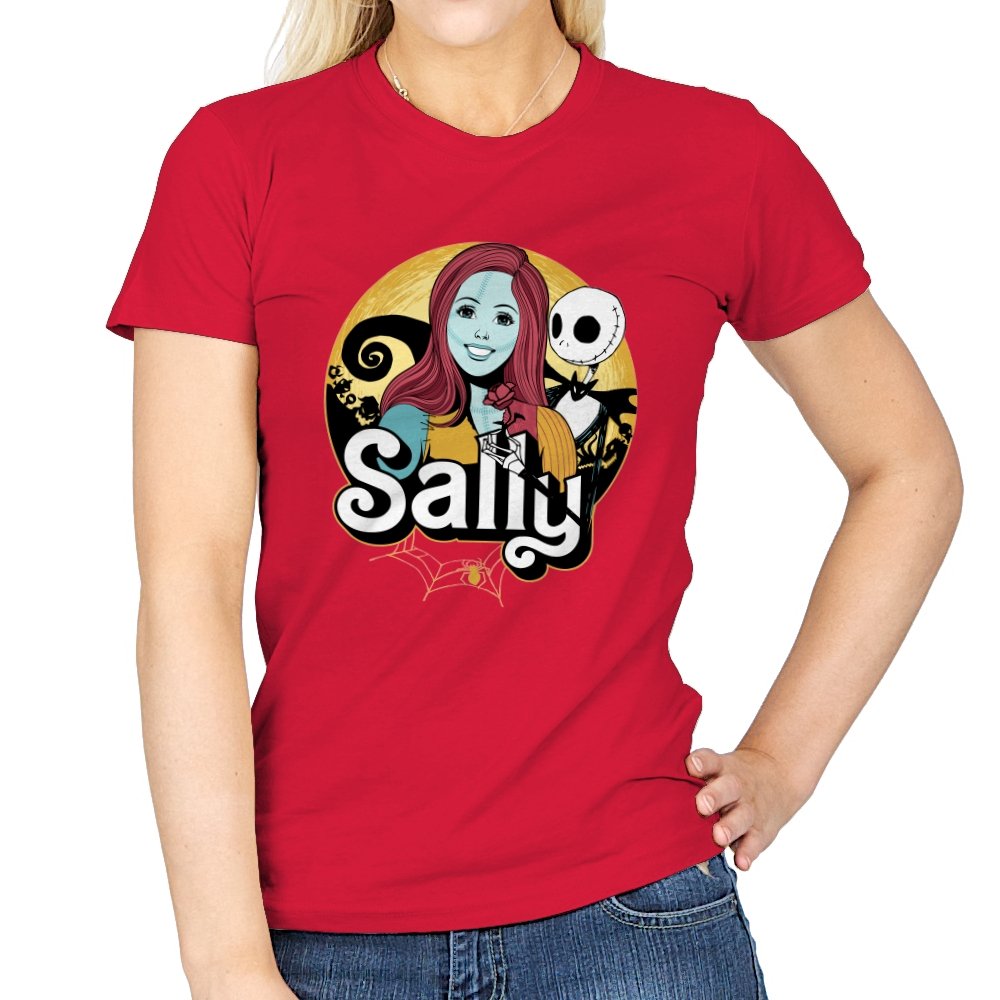 Sally centers a stitched romantic heroine against a round harvest moon. Her blue skin, red hair, and patchwork dress are rendered with a softer realism than usual, as if filtered through a vintage illustrated portrait. Behind her, a lanky skeleton figure lurks in silhouette, framed by curling hills and tiny pumpkins that instantly signal the town where Halloween never ends. Spiders and webs hide at the bottom, tying the whole layout together without stealing focus.