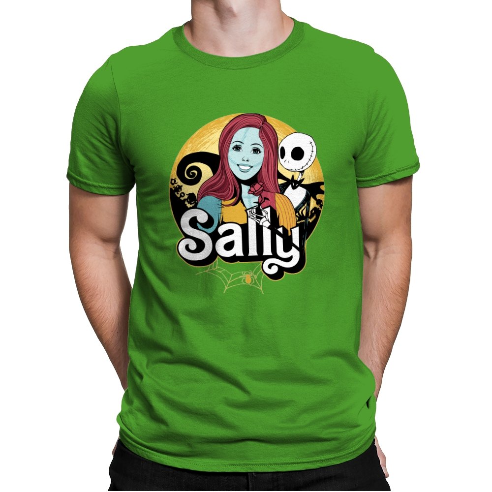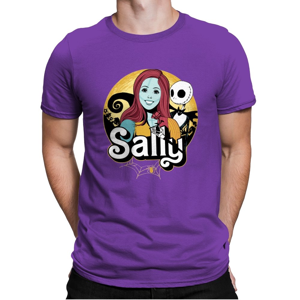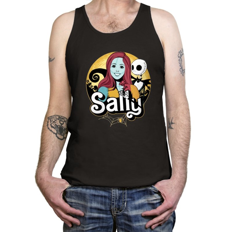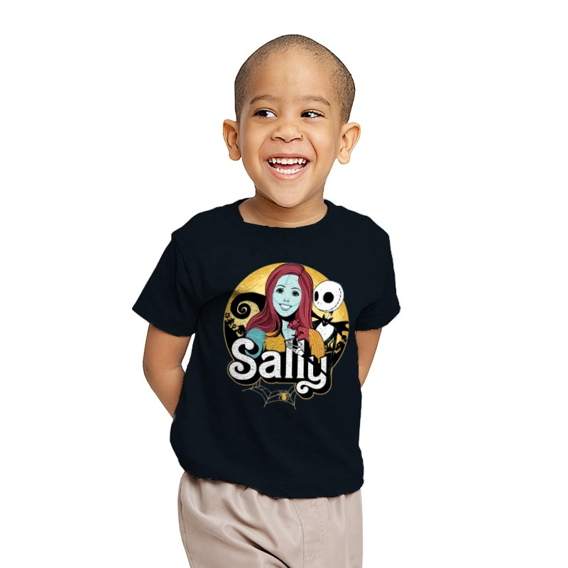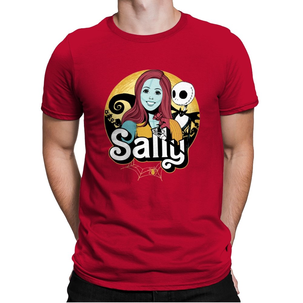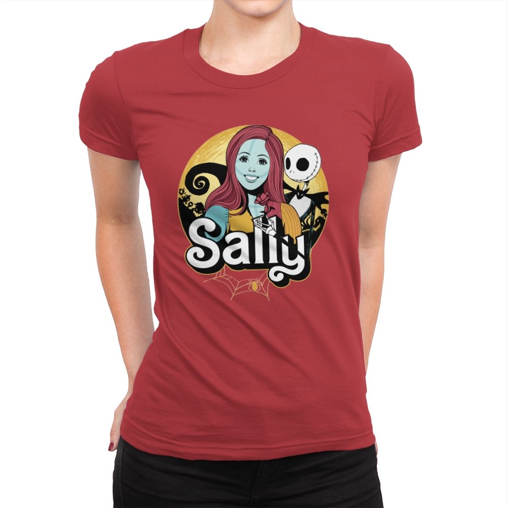 Sally centers a stitched romantic heroine against a round harvest moon. Her blue skin, red hair, and patchwork dress are rendered with a softer realism than usual, as if filtered through a vintage illustrated portrait. Behind her, a lanky skeleton figure lurks in silhouette, framed by curling hills and tiny pumpkins that instantly signal the town where Halloween never ends. Spiders and webs hide at the bottom, tying the whole layout together without stealing focus.