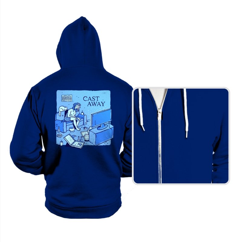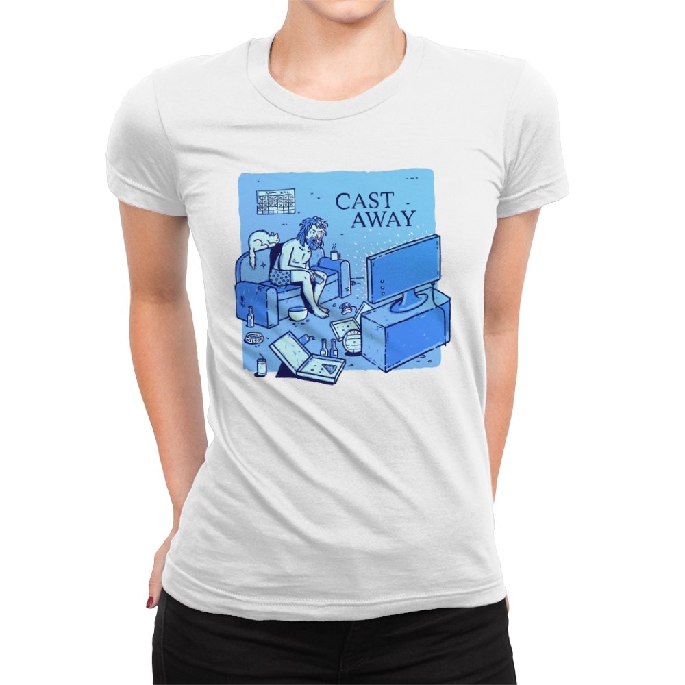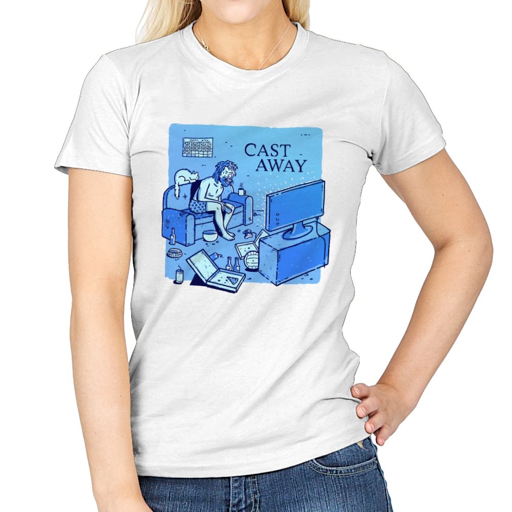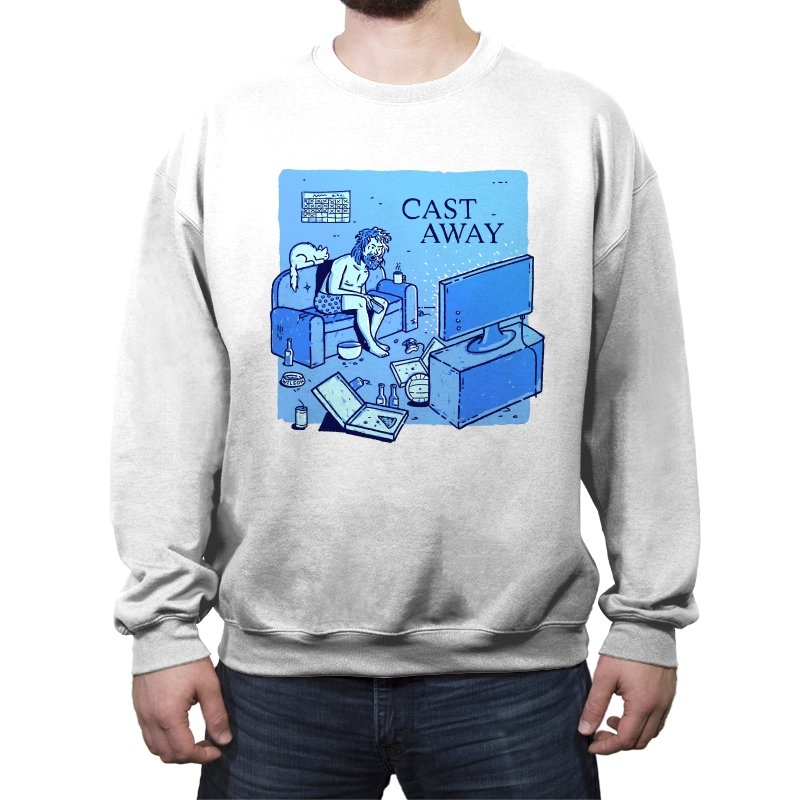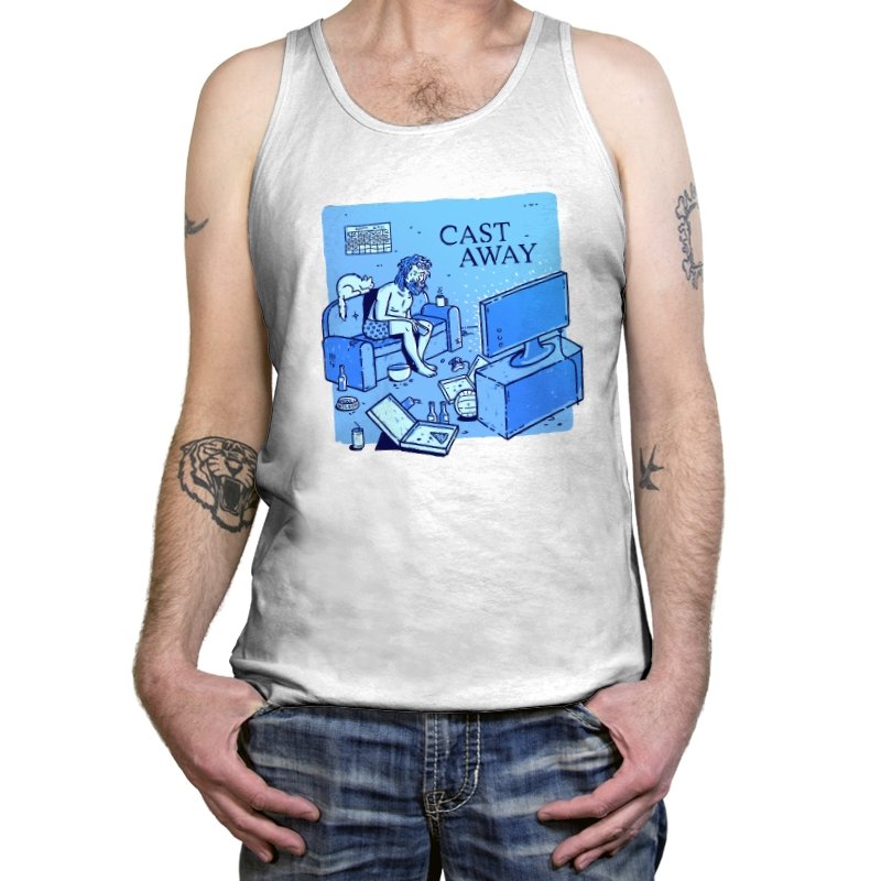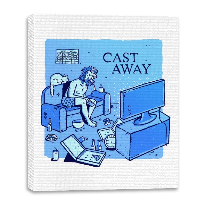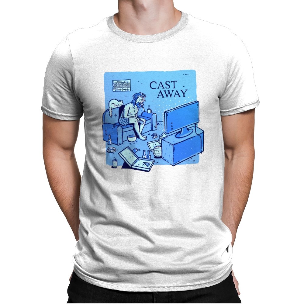 This design reworks a survival story into a familiar indoor scene. A bearded figure sits marooned on a couch, surrounded by empty bottles, takeout boxes, and glowing screens. The title overhead flips isolation from an island to a living room, letting boredom replace the ocean. If you remember the original struggle, the update feels painfully accurate.