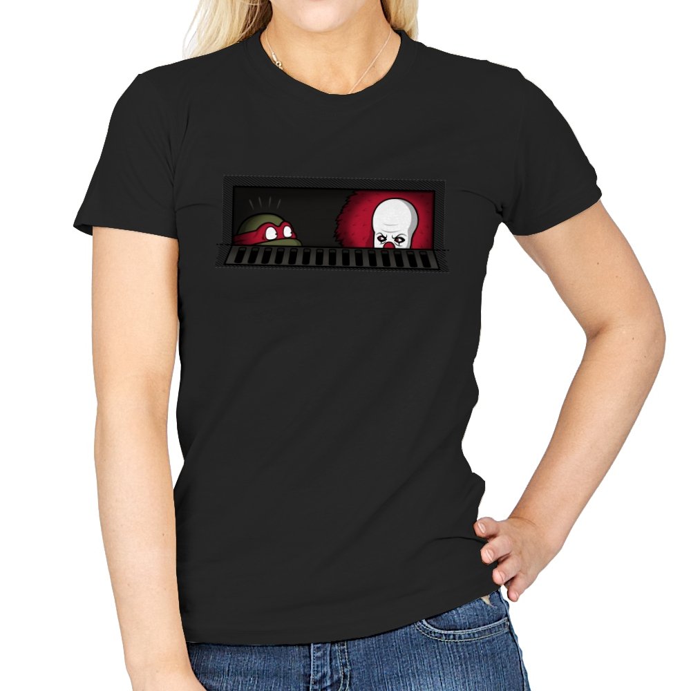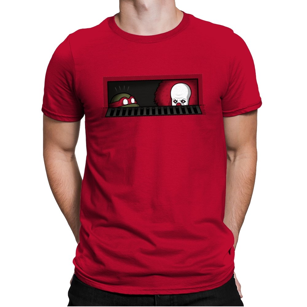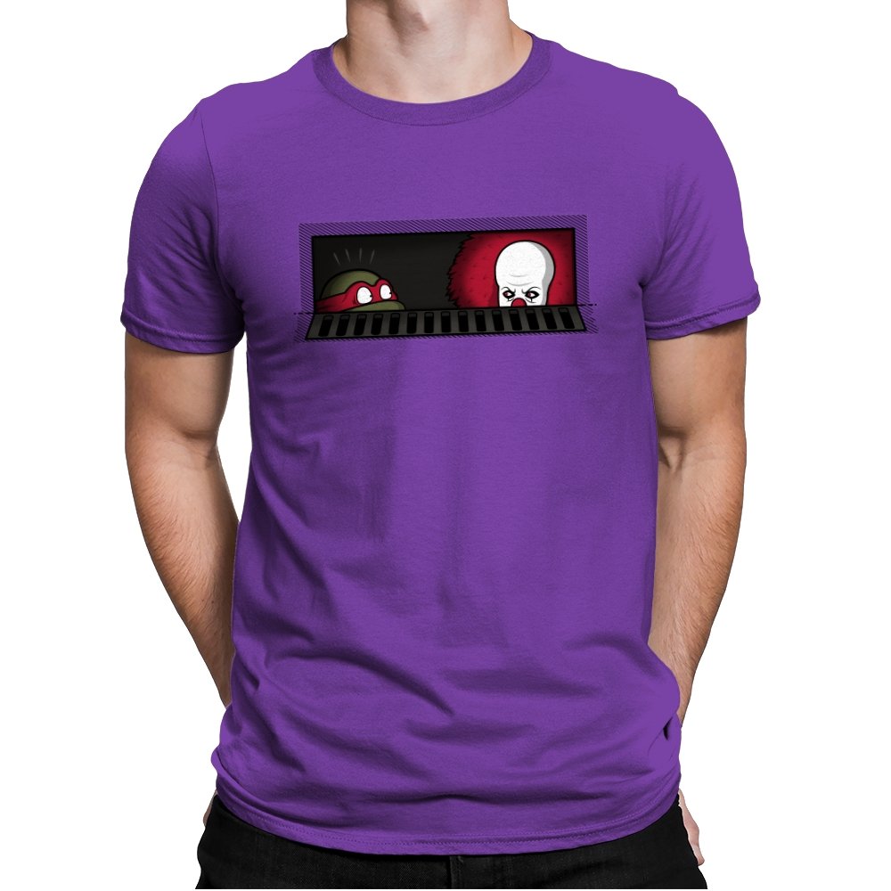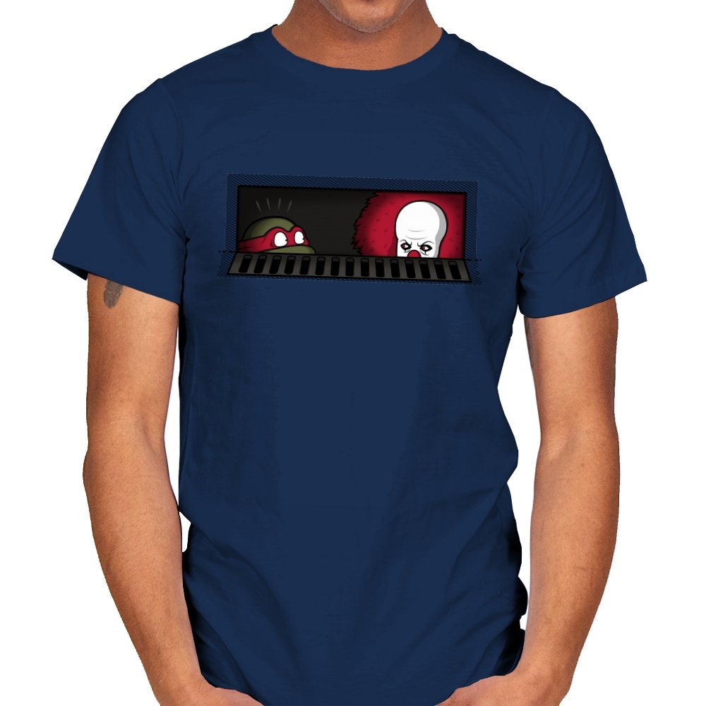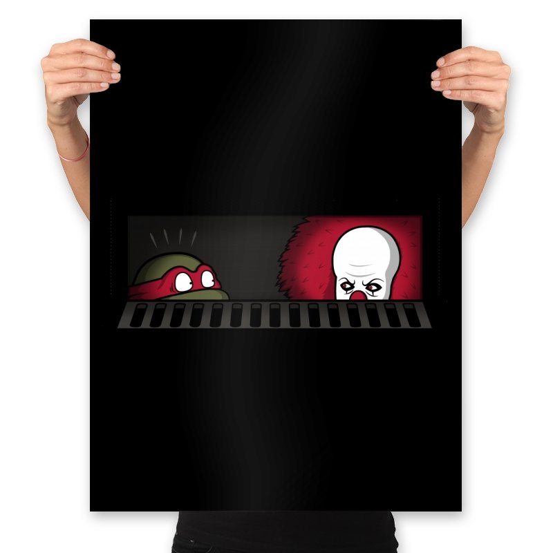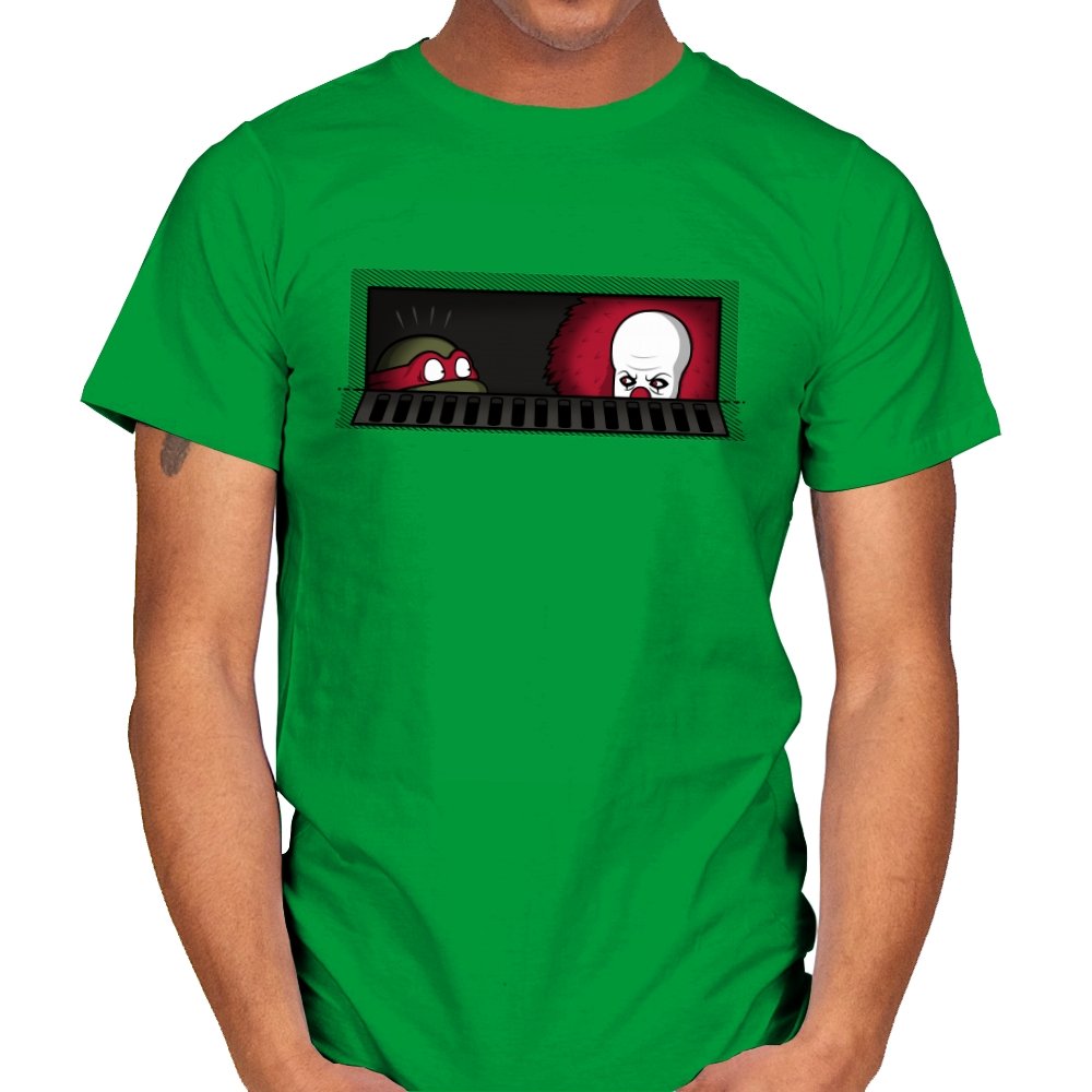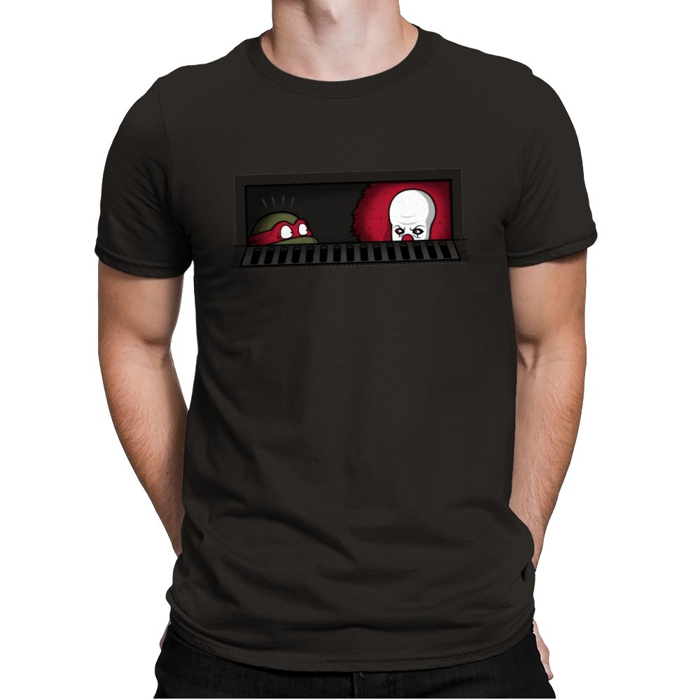When pizza-loving reptiles share underground real estate with a balloon-wielding nightmare, you get the most uncomfortable roommate situation in horror comedy history. This design frames both sewer dwellers peeking out from the same storm drain, separated by bars that probably aren’t doing much to ease the tension. On one side, wide eyes emerge from the darkness. On the other, that pale face and signature red balloon suggest someone’s definitely not getting their security deposit back. It’s the mashup nobody asked for but everyone needed, because both franchises built their mythology around the same dank infrastructure.