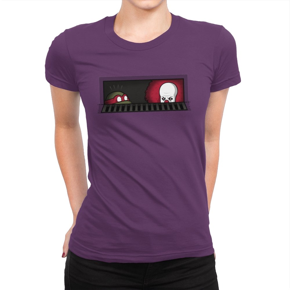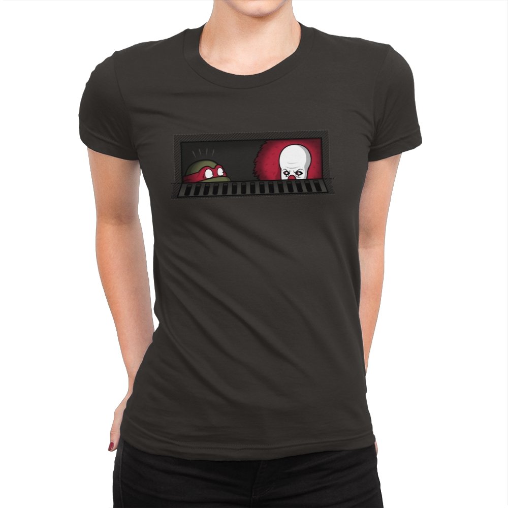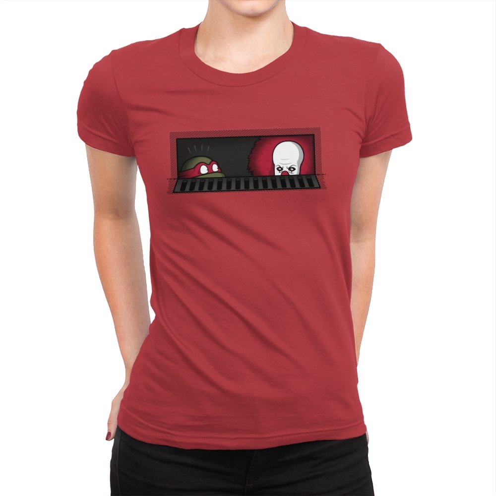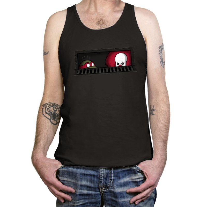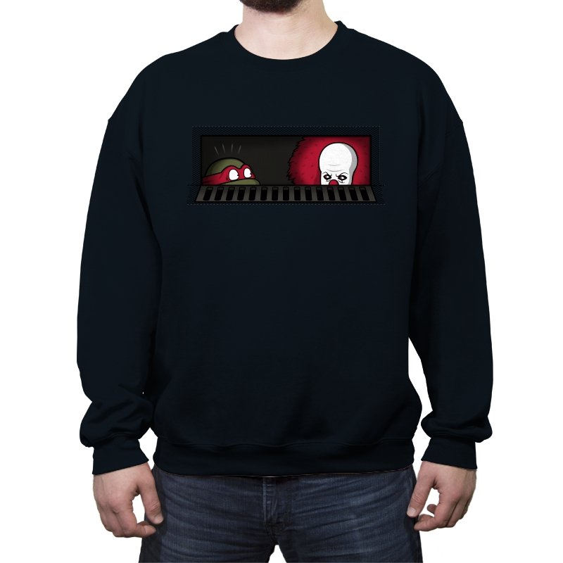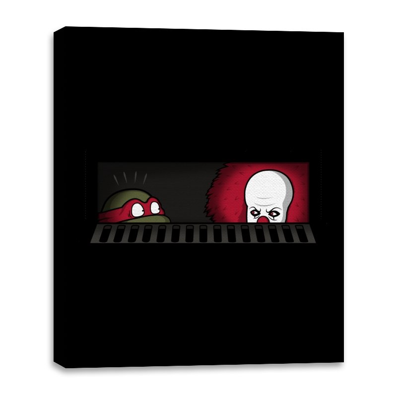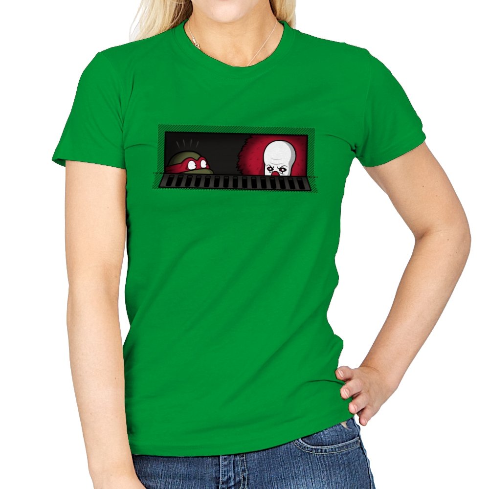 When pizza-loving reptiles share underground real estate with a balloon-wielding nightmare, you get the most uncomfortable roommate situation in horror comedy history. This design frames both sewer dwellers peeking out from the same storm drain, separated by bars that probably aren’t doing much to ease the tension. On one side, wide eyes emerge from the darkness. On the other, that pale face and signature red balloon suggest someone’s definitely not getting their security deposit back. It’s the mashup nobody asked for but everyone needed, because both franchises built their mythology around the same dank infrastructure.