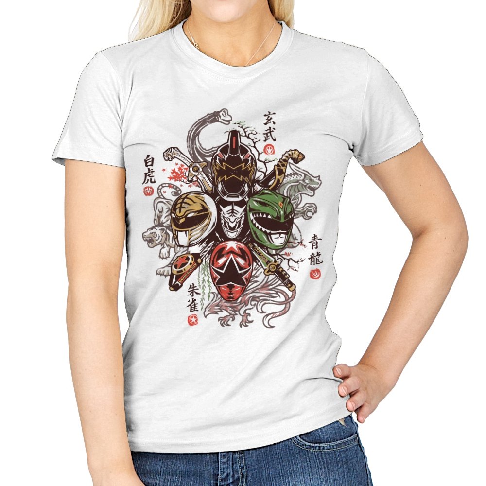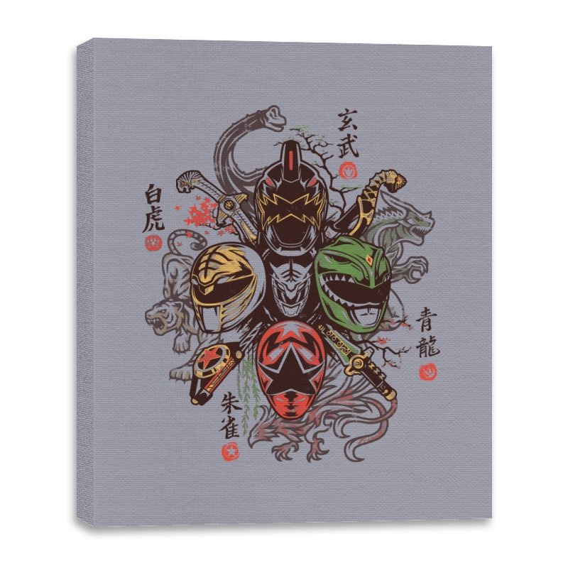 This design mixes color coded tokusatsu heroes with the mythic animals of the Four Symbols. Each helmet aligns with a celestial beast, circling the center like a shrine mural. Tigers, dragons, birds, and tortoises coil around the armor, while kanji frame the composition with a traditional martial arts poster vibe. Fans know exactly what eras and storylines are being blended and get to enjoy both on the same canvas.
