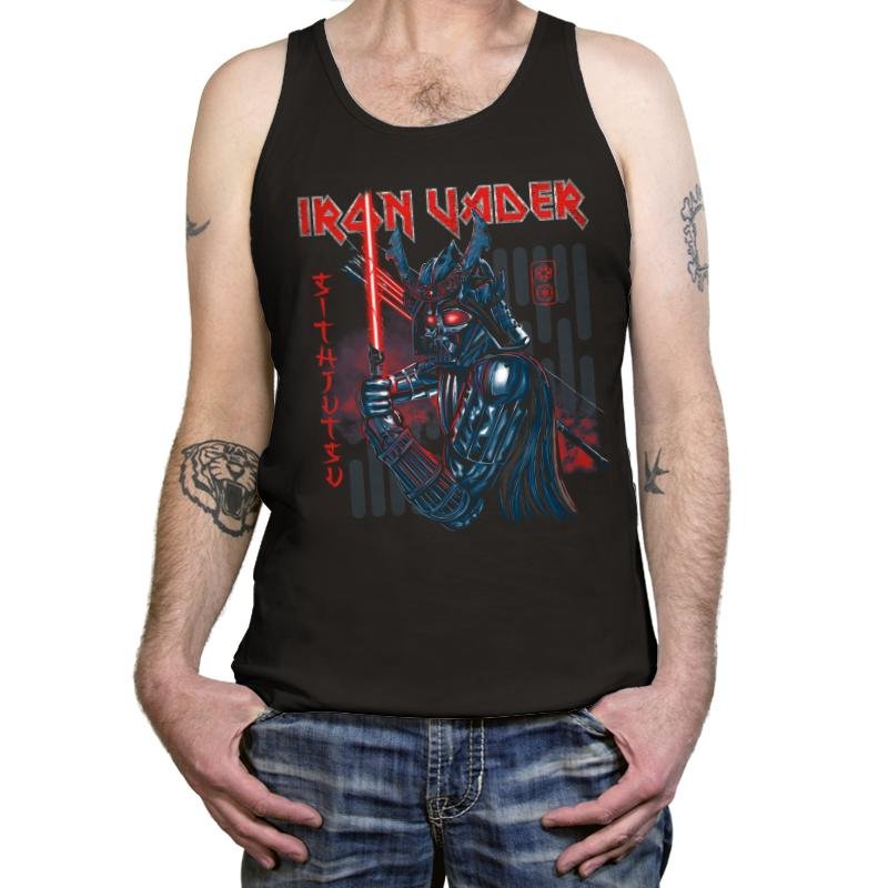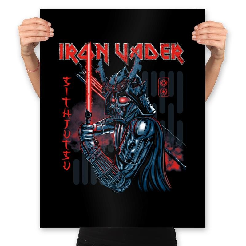 This design remixes a famous armored space villain through the lens of classic metal album art and samurai warrior imagery. The helmet gains horned accents and layered plating like a kabuto, while red eyes burn beneath. In one hand he grips a glowing blade and in the other a second weapon rests against stylized tech panels. The title typography screams heavy metal, and the vertical red script to the side reads like dojo signage for a martial art you are not meant to survive.