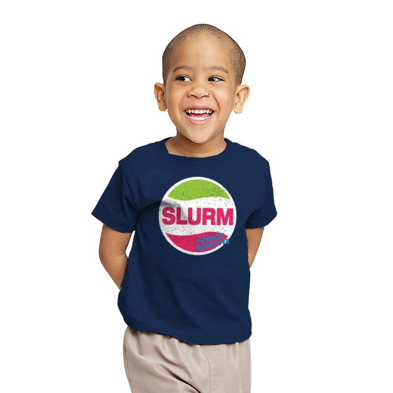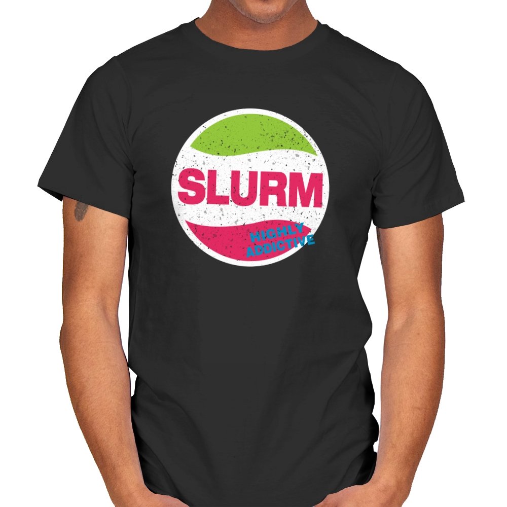 This design features a playful and nostalgic take on the iconic “Slurm” drink from the futuristic world of the animated series. With its vibrant green and pink colors, the logo boldly states “SLURM” with the tagline “Highly Addictive” underneath, capturing the humorous, over-the-top nature of the show. The design mimics the look of a classic soda logo, giving it an instantly recognizable and retro vibe that will resonate with fans.