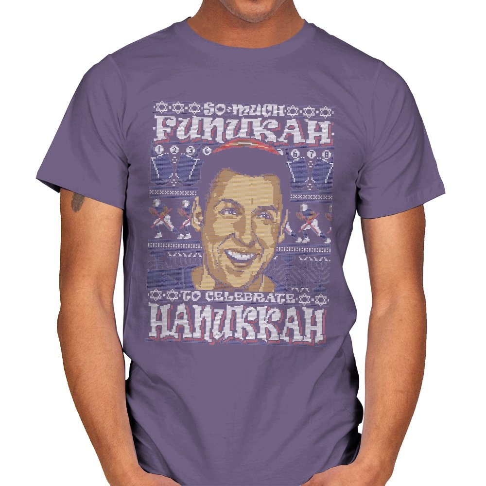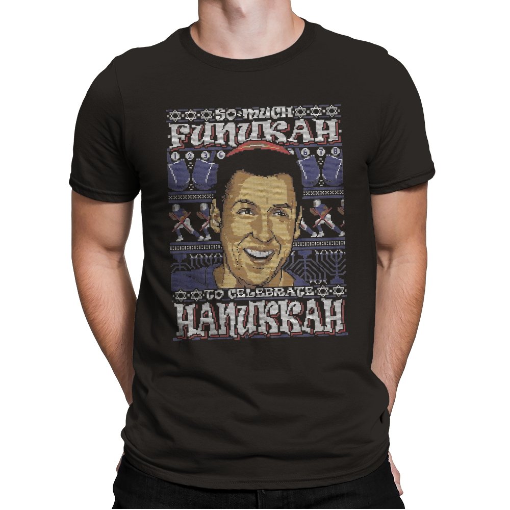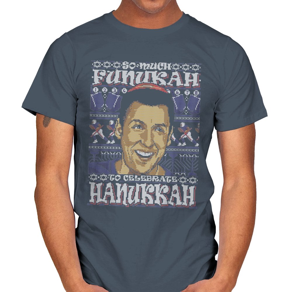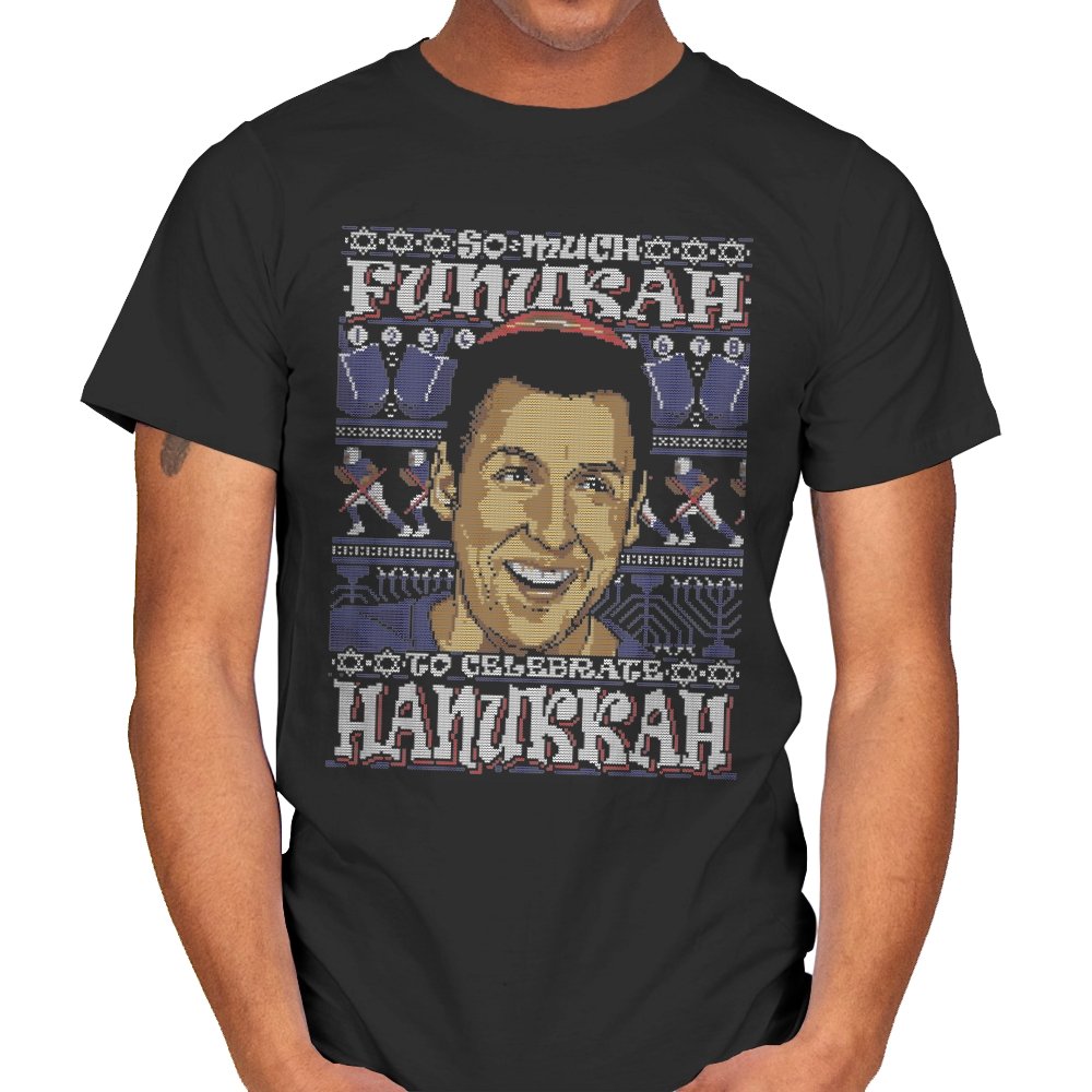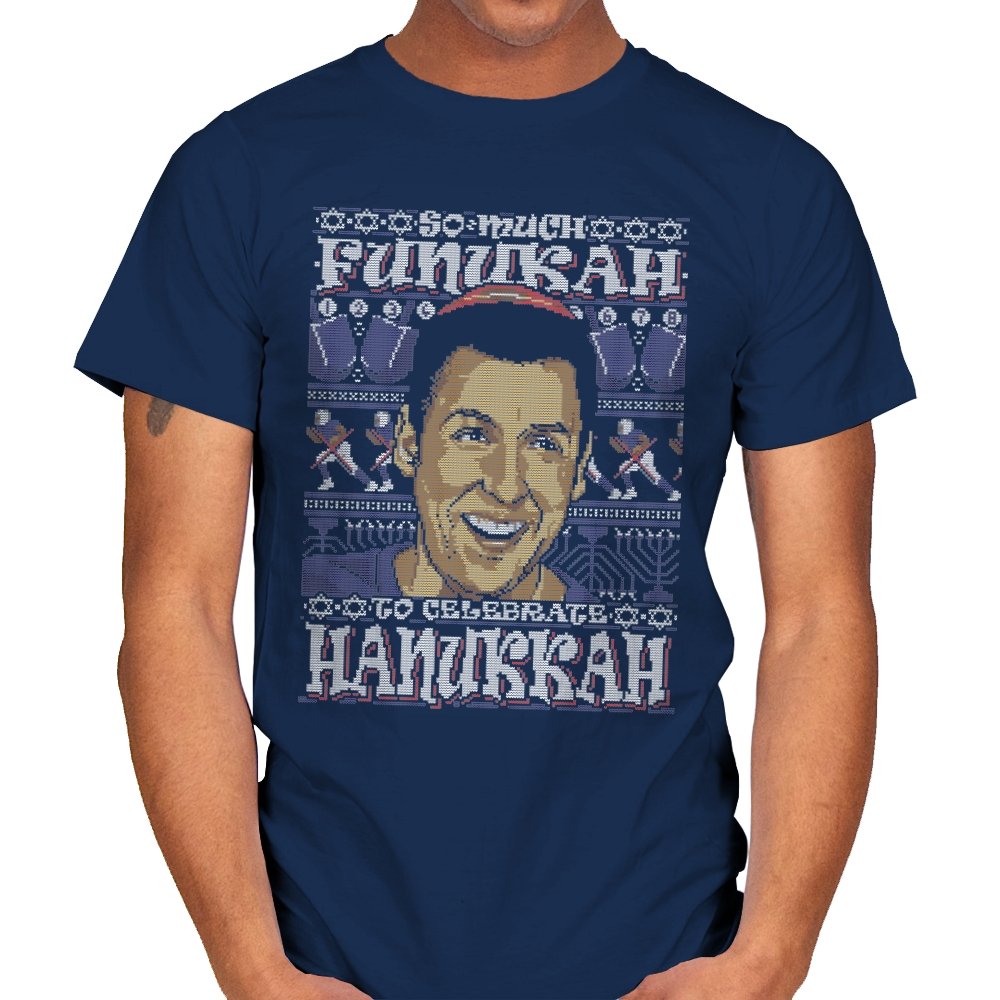 This design leans hard into the ugly holiday sweater tradition, rendered in pixel-knit style with a very recognizable grin at the center. The menorahs, dreidels, and crossed sticks frame the portrait like a looping chorus you already know by heart. It reads like a frozen TV moment from the era when holiday songs felt slightly unhinged and absolutely sincere. If you get it, you get it instantly.