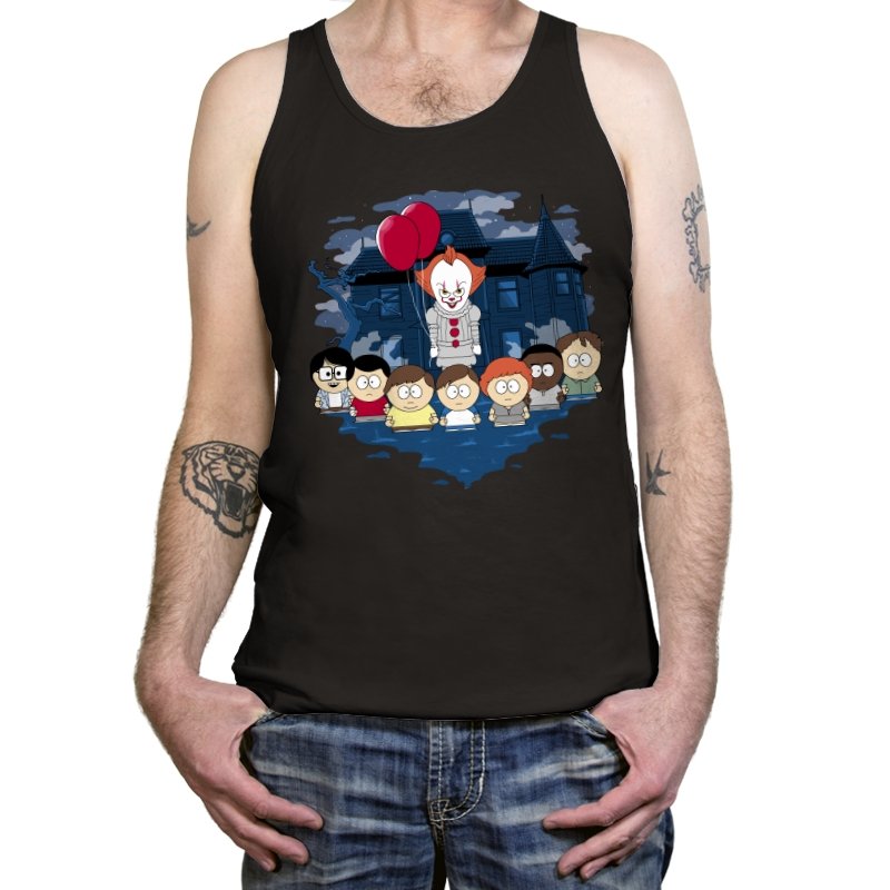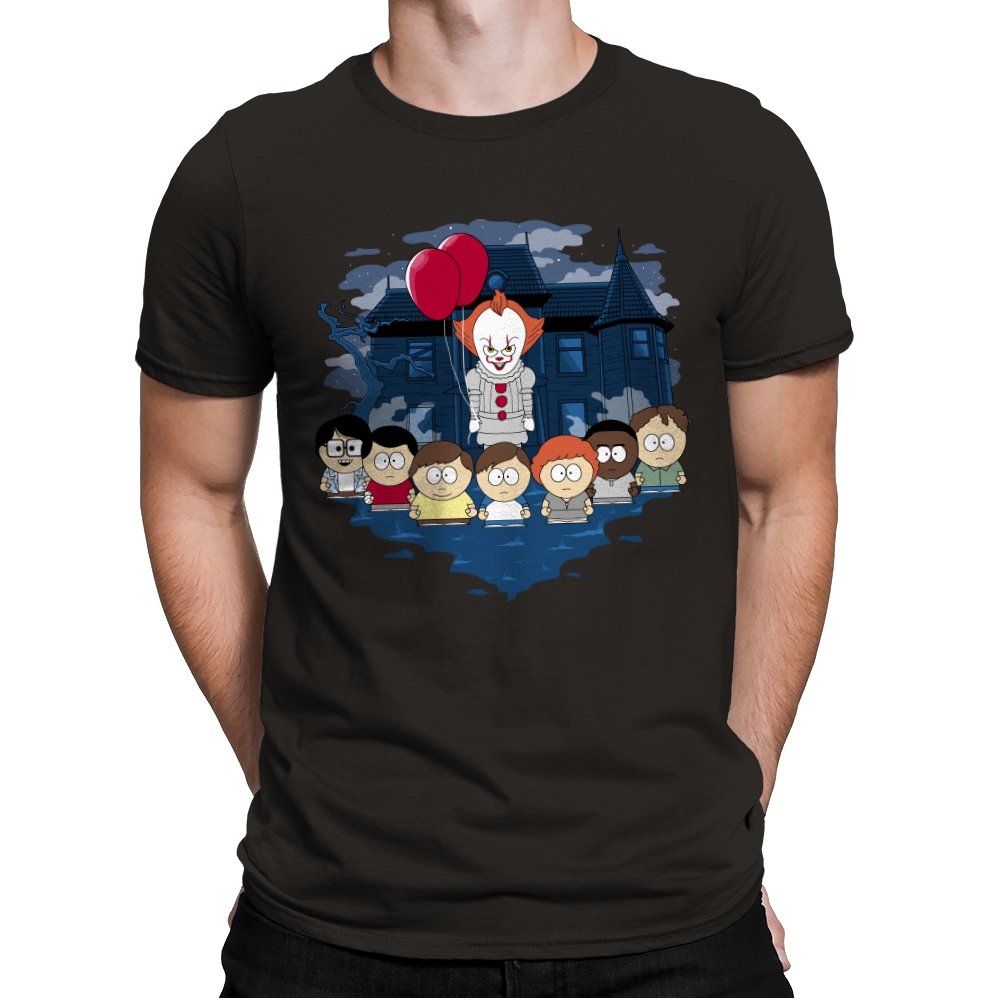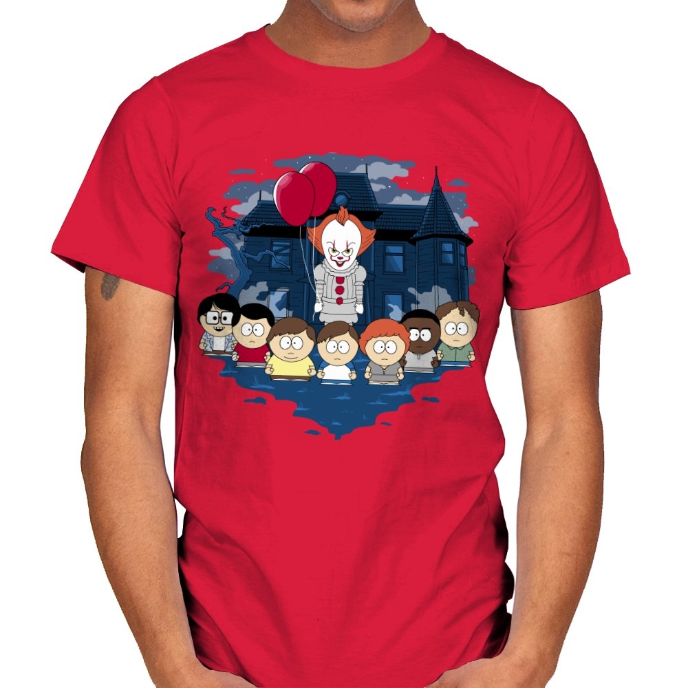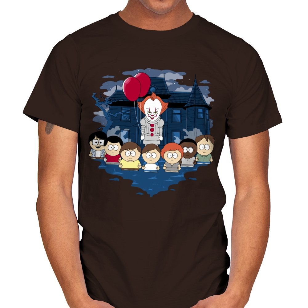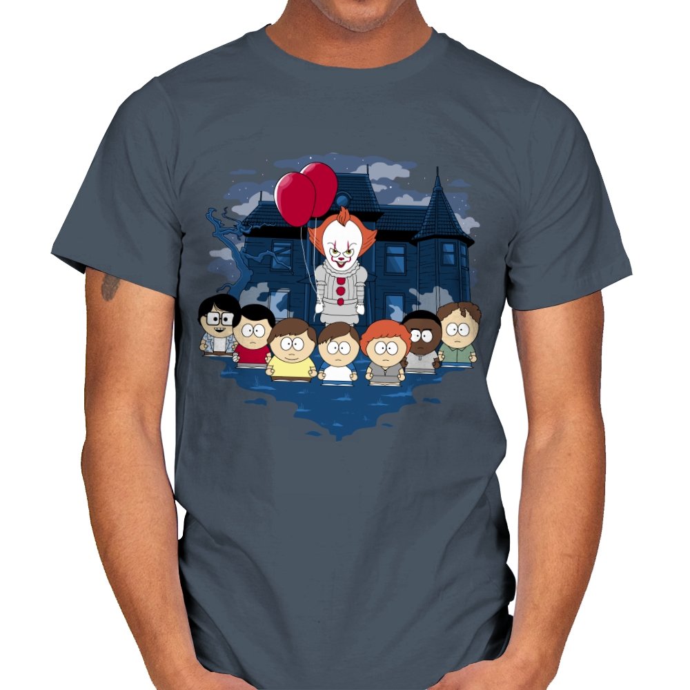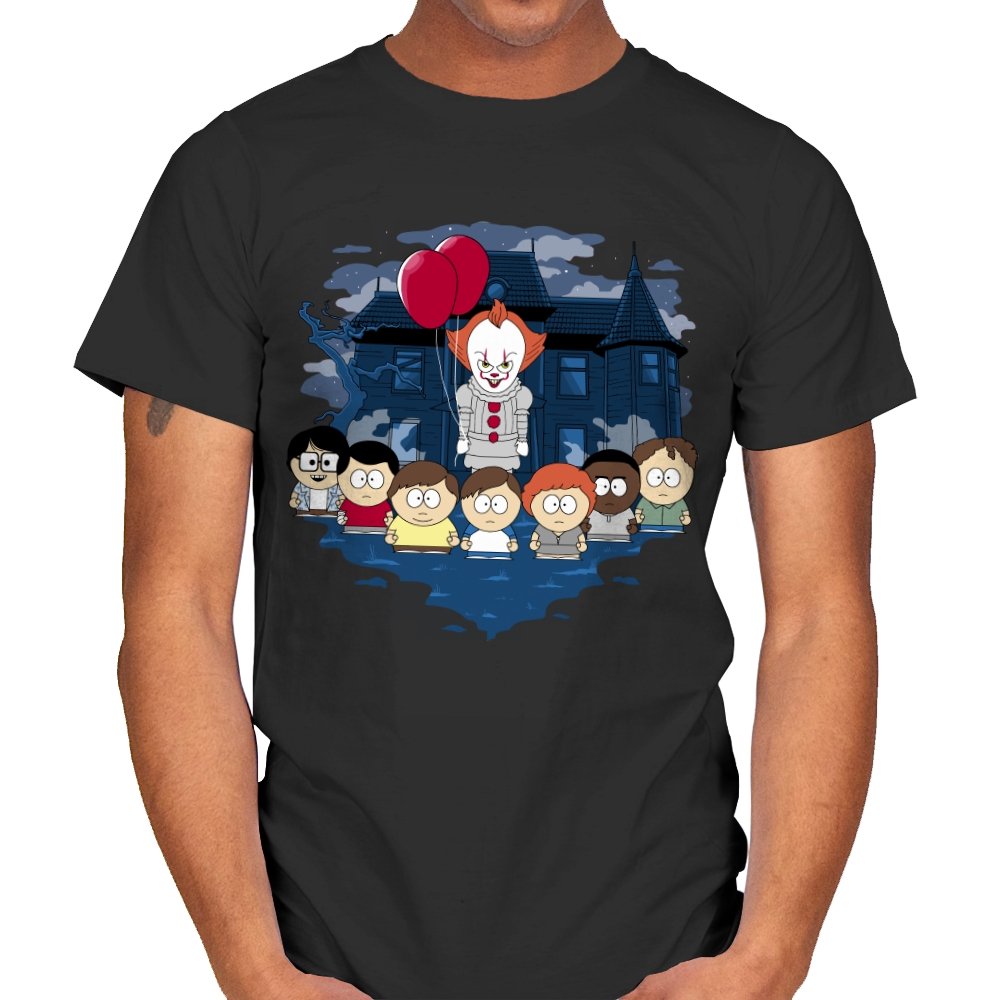 When a small Colorado town meets a cursed Maine sewer system, you get this exact aesthetic. Seven kids rendered in that distinctive crude animation style stand in reflective water, staring up at a balloon-wielding nightmare figure looming in front of a decrepit house. The mashup works because both sources understand that childhood terror hits different when filtered through absurdist humor. One show built its reputation on fearless satire, the other on fears that float, and somehow the collision feels natural.