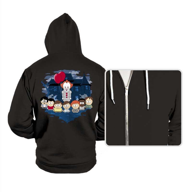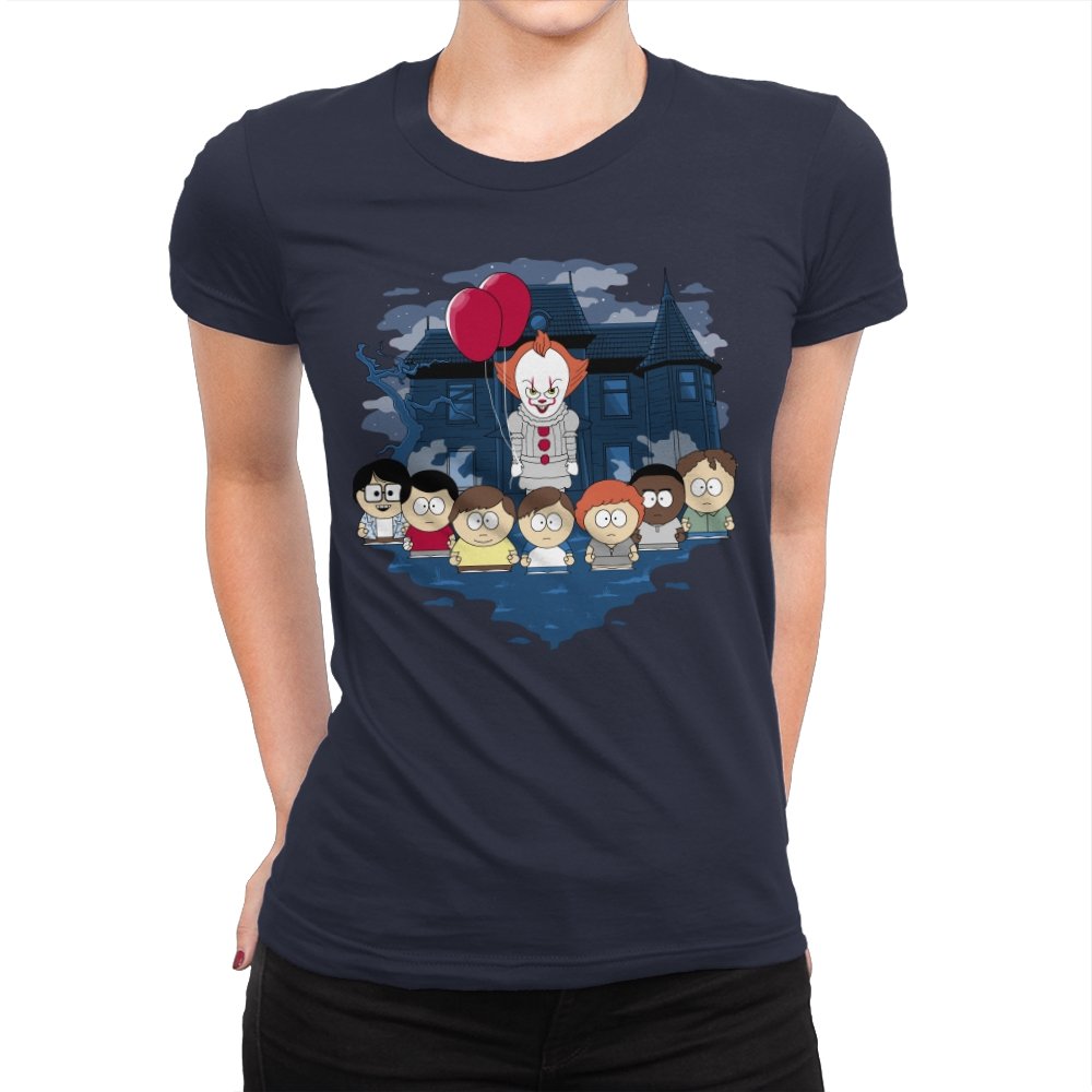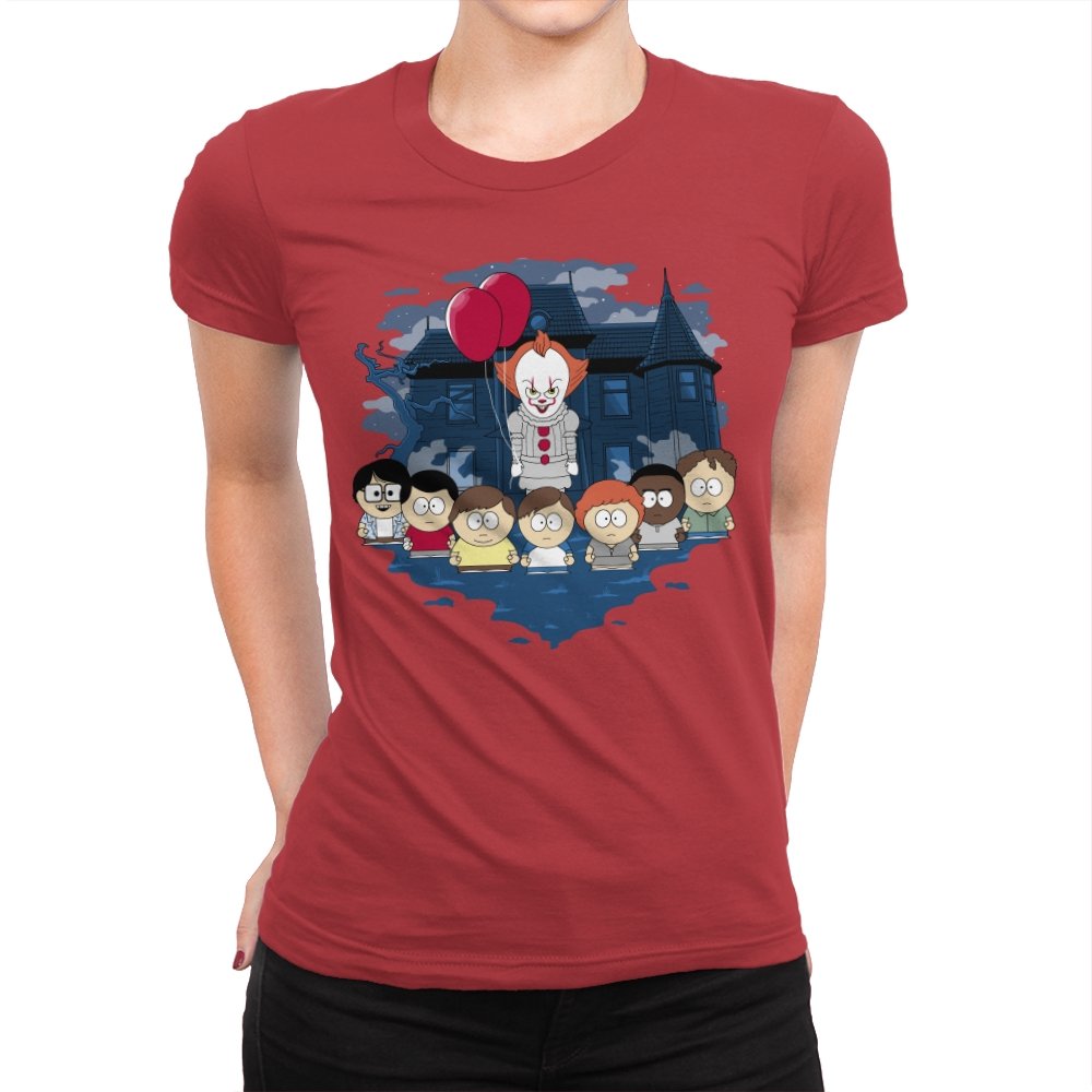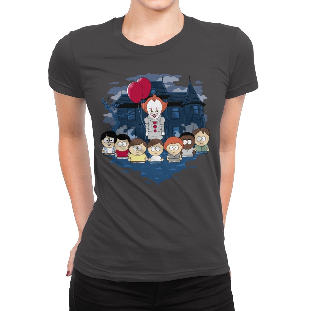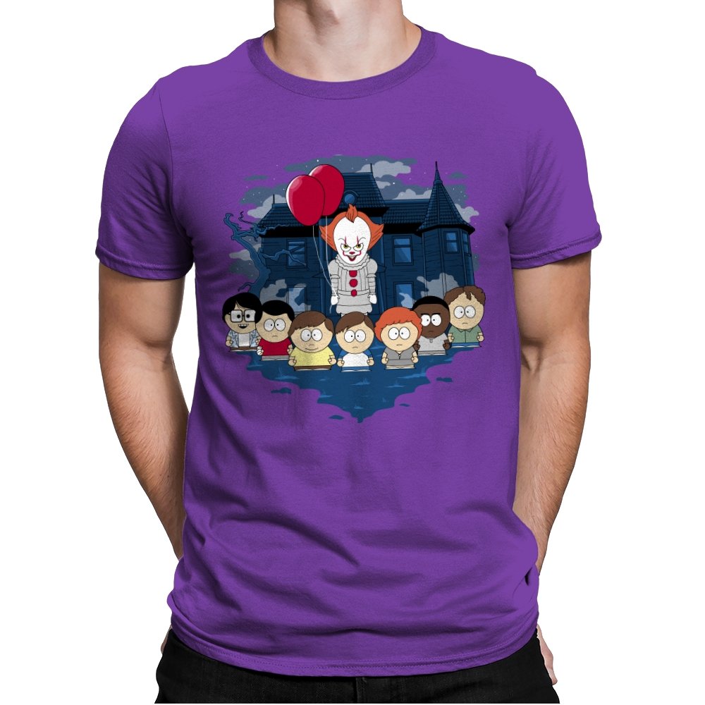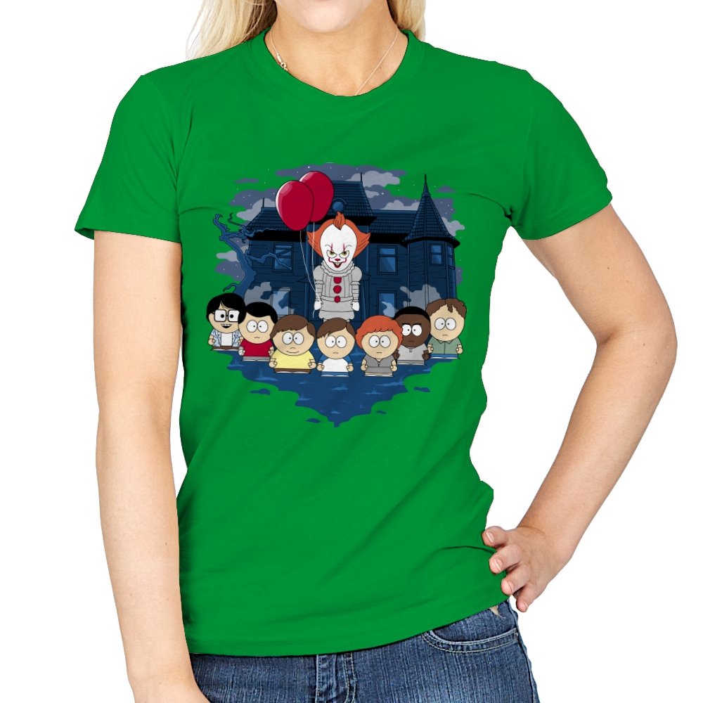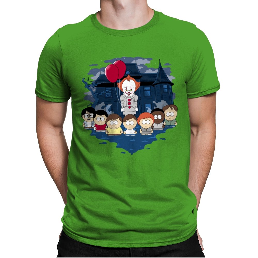 When a small Colorado town meets a cursed Maine sewer system, you get this exact aesthetic. Seven kids rendered in that distinctive crude animation style stand in reflective water, staring up at a balloon-wielding nightmare figure looming in front of a decrepit house. The mashup works because both sources understand that childhood terror hits different when filtered through absurdist humor. One show built its reputation on fearless satire, the other on fears that float, and somehow the collision feels natural.