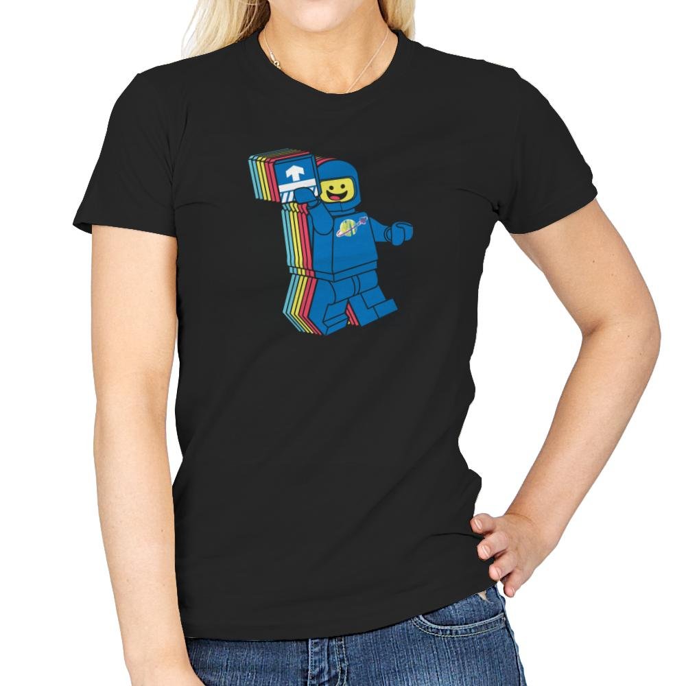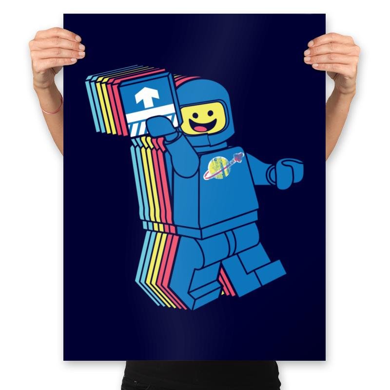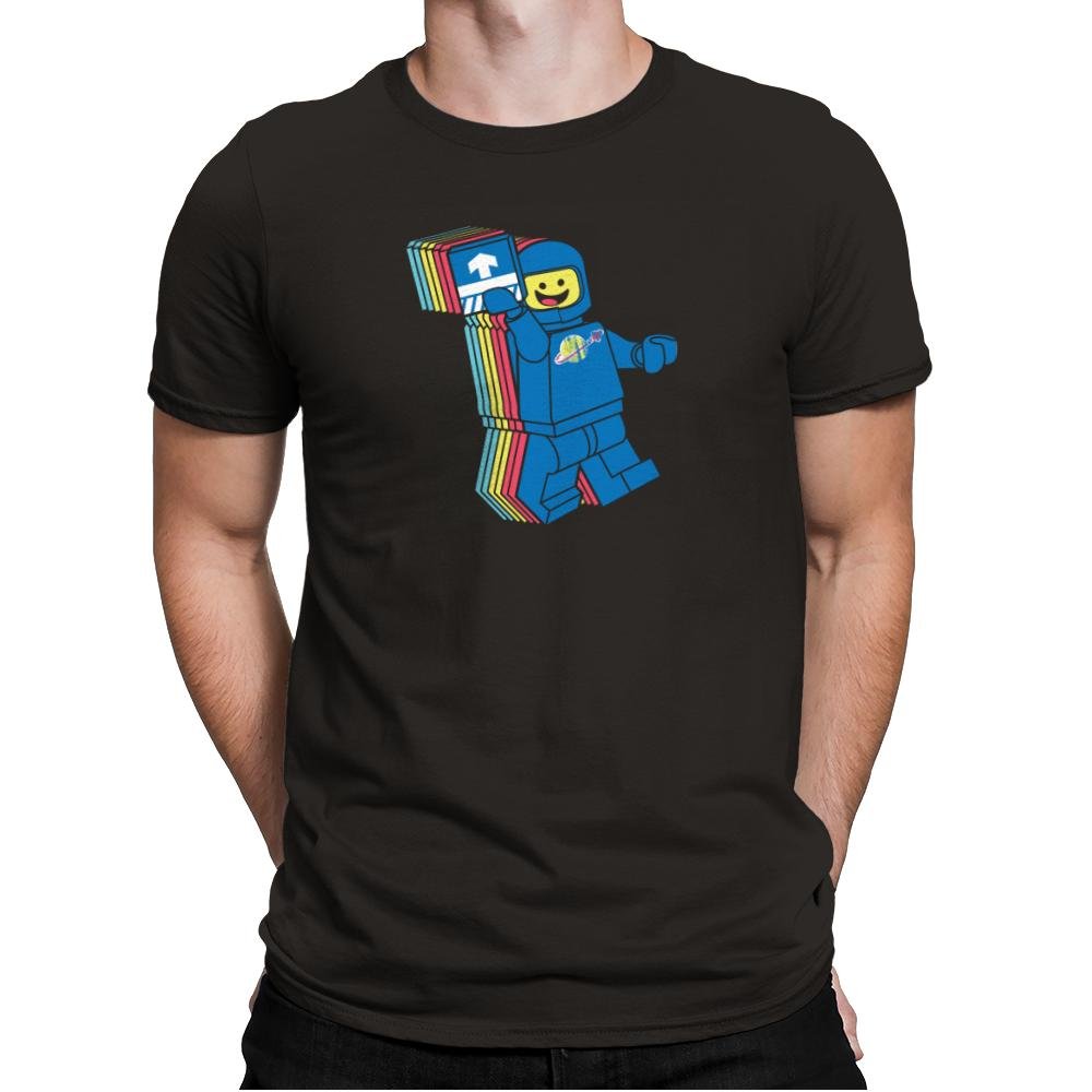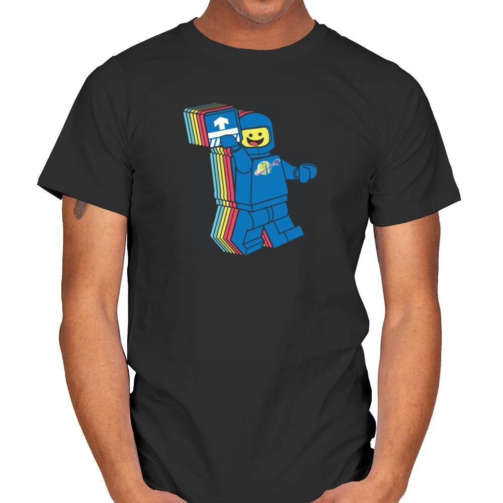 This design pulls from the brightly colored era of blocky space adventurers. The smiling pilot lifts a printed tile like it is both mission badge and ticket to adventure. The layered trail of colors behind him gives a playful sense of warp travel, as if nostalgia just broke the sound barrier. Fans will recognize the planet logo and the simple expression that defined so many childhood missions.