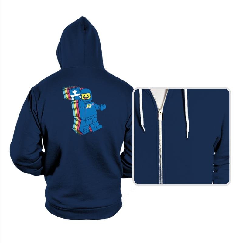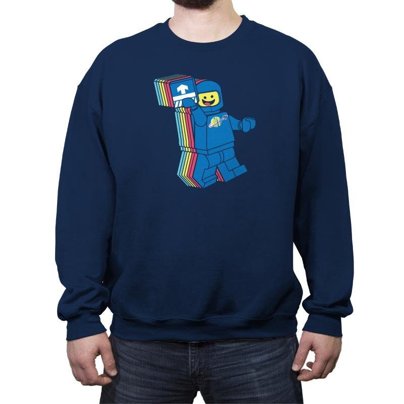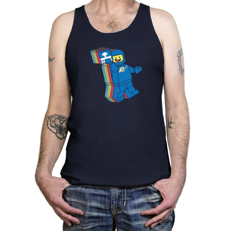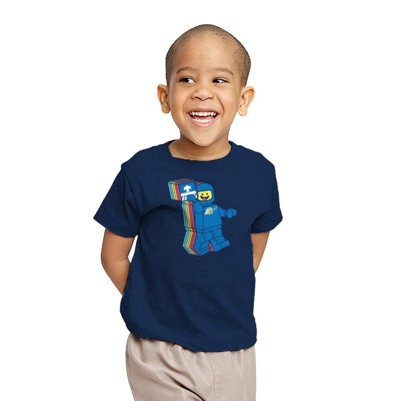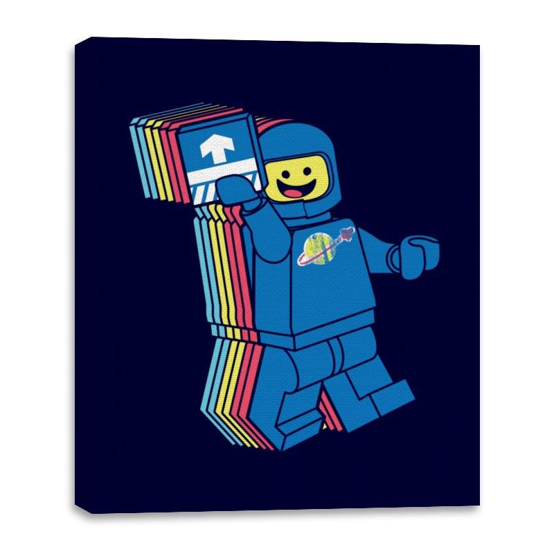 This design pulls from the brightly colored era of blocky space adventurers. The smiling pilot lifts a printed tile like it is both mission badge and ticket to adventure. The layered trail of colors behind him gives a playful sense of warp travel, as if nostalgia just broke the sound barrier. Fans will recognize the planet logo and the simple expression that defined so many childhood missions.