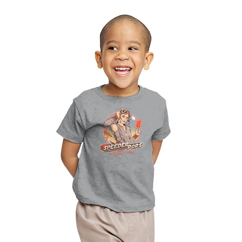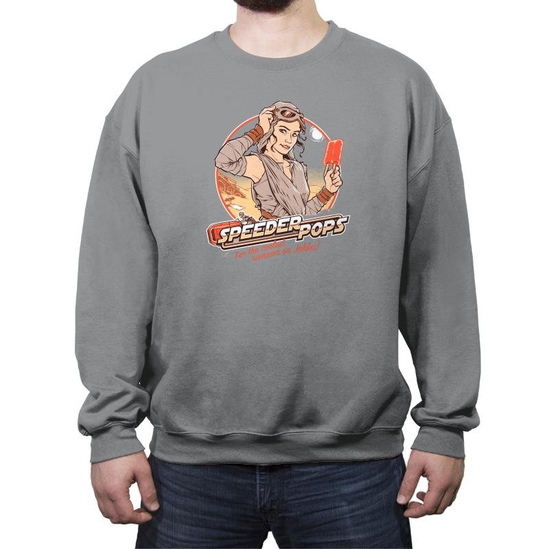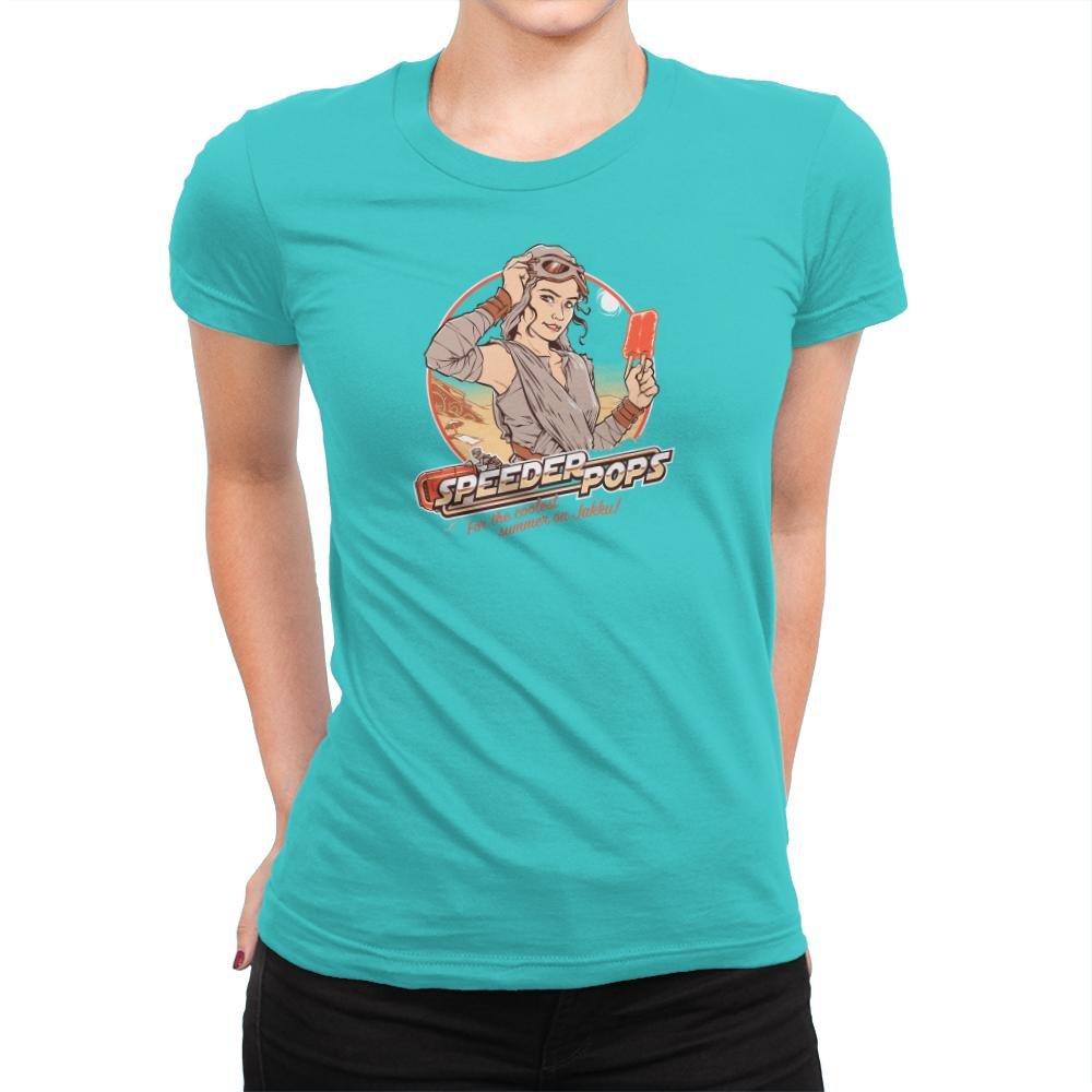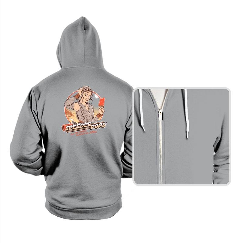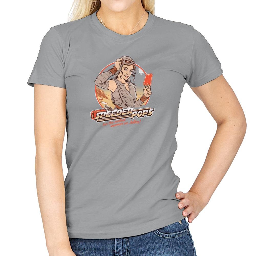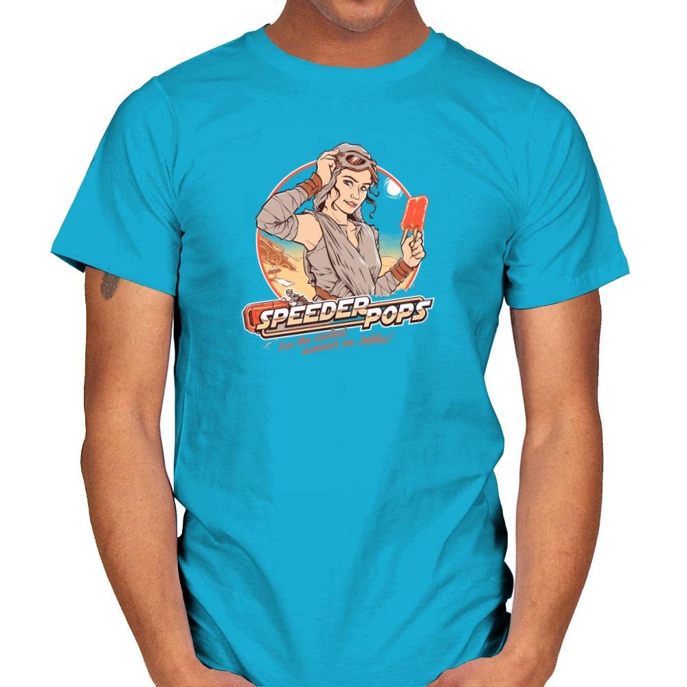This design plays like a retro ad pulled from a desert planet travel brochure. A confident scavenger type leans against a circular sun graphic, goggles pushed up, frozen treat in hand, with speed bikes cutting through the background. The colors feel sun baked and nostalgic, like a postcard from a hot summer far from anywhere civilized. It mixes pin up illustration energy with sci fi grit in a way fans instantly recognize.