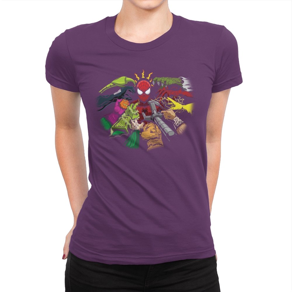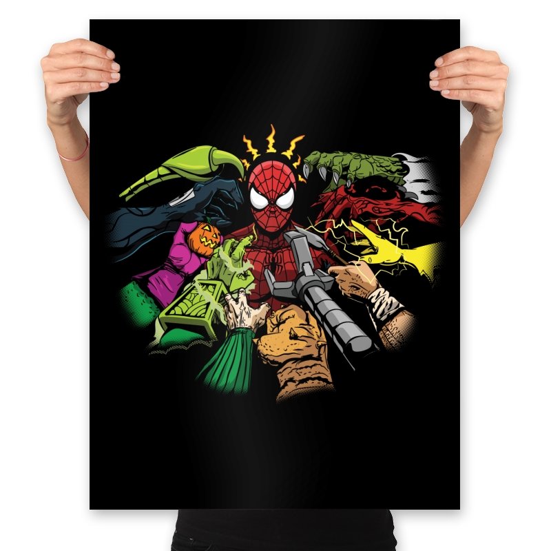 This design drops a certain wall crawling hero into a boss rush of familiar rogues. Clawed gloves, pumpkin bombs, tendrils, sand fists, and mechanical arms crowd the frame while the masked kid sits dead center trying to process the chaos. Lightning bolts around his head make it clear the danger sense is buzzing. Fans know these villains and why seeing them all at once feels like a late game gauntlet.