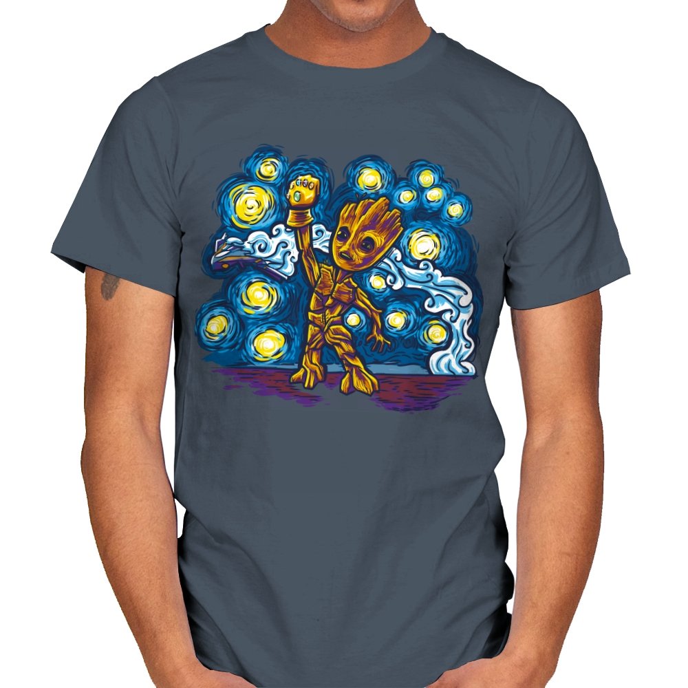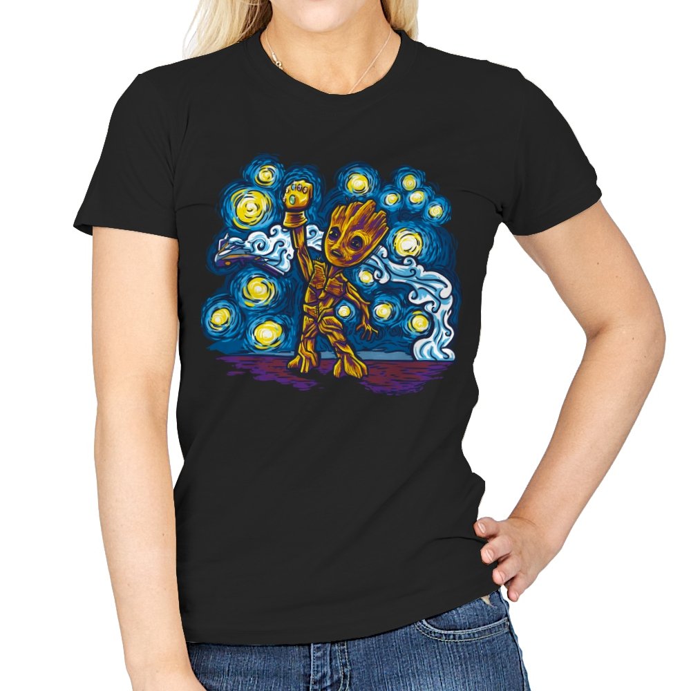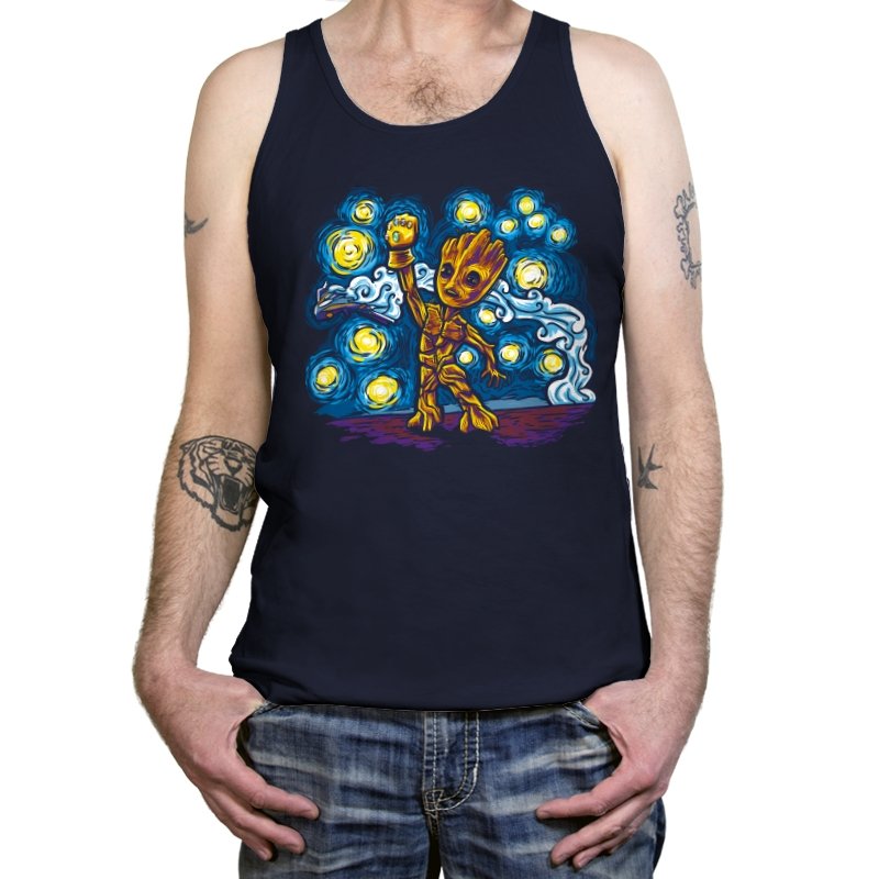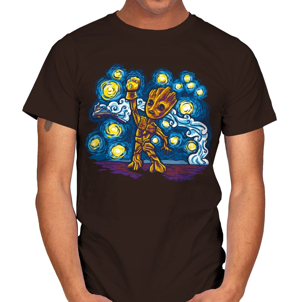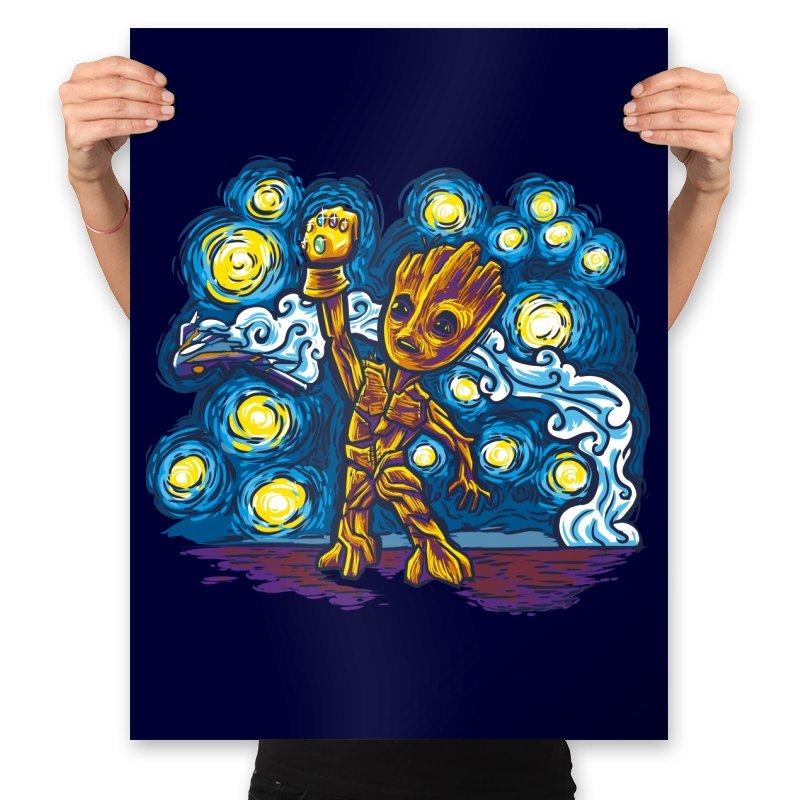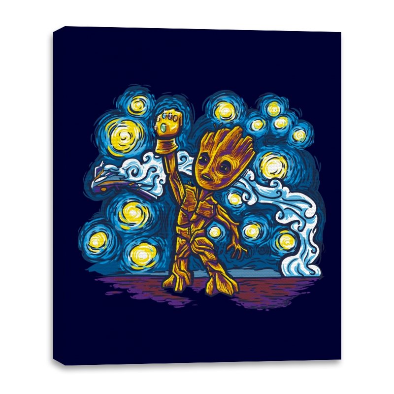 This mashup places a tiny tree hero in the middle of a swirling star filled night. Bright strokes of yellow and blue turn the sky into motion while a sleek ship cuts through the background. The character raises a fist with youthful confidence, as if greeting the cosmos with wide eyed energy. It feels playful and painterly at the same time, mixing space adventure with post impressionist flourish.