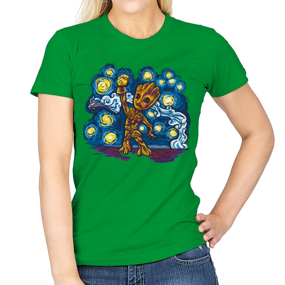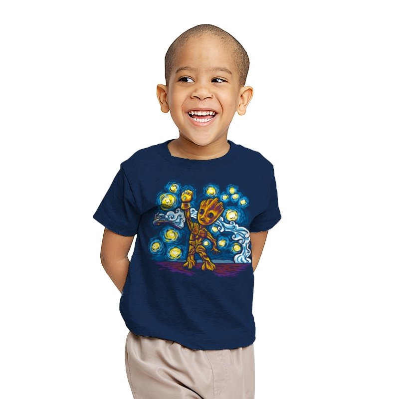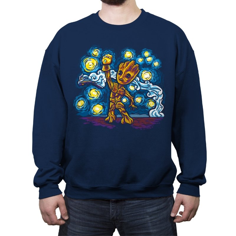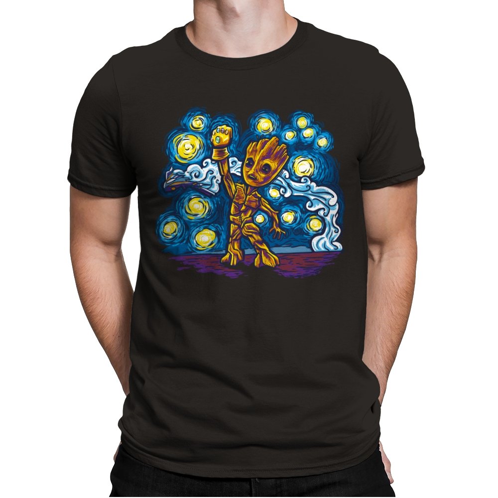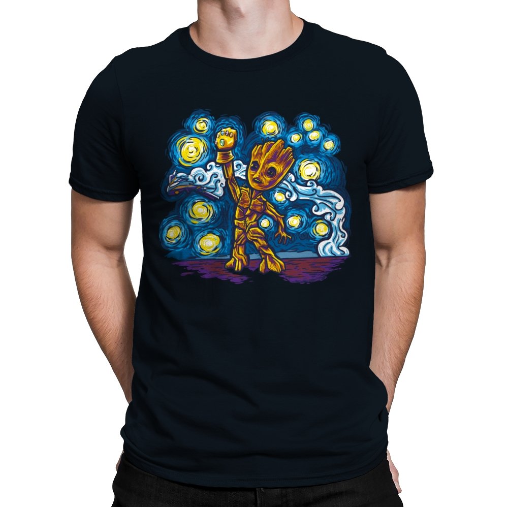 This mashup places a tiny tree hero in the middle of a swirling star filled night. Bright strokes of yellow and blue turn the sky into motion while a sleek ship cuts through the background. The character raises a fist with youthful confidence, as if greeting the cosmos with wide eyed energy. It feels playful and painterly at the same time, mixing space adventure with post impressionist flourish.