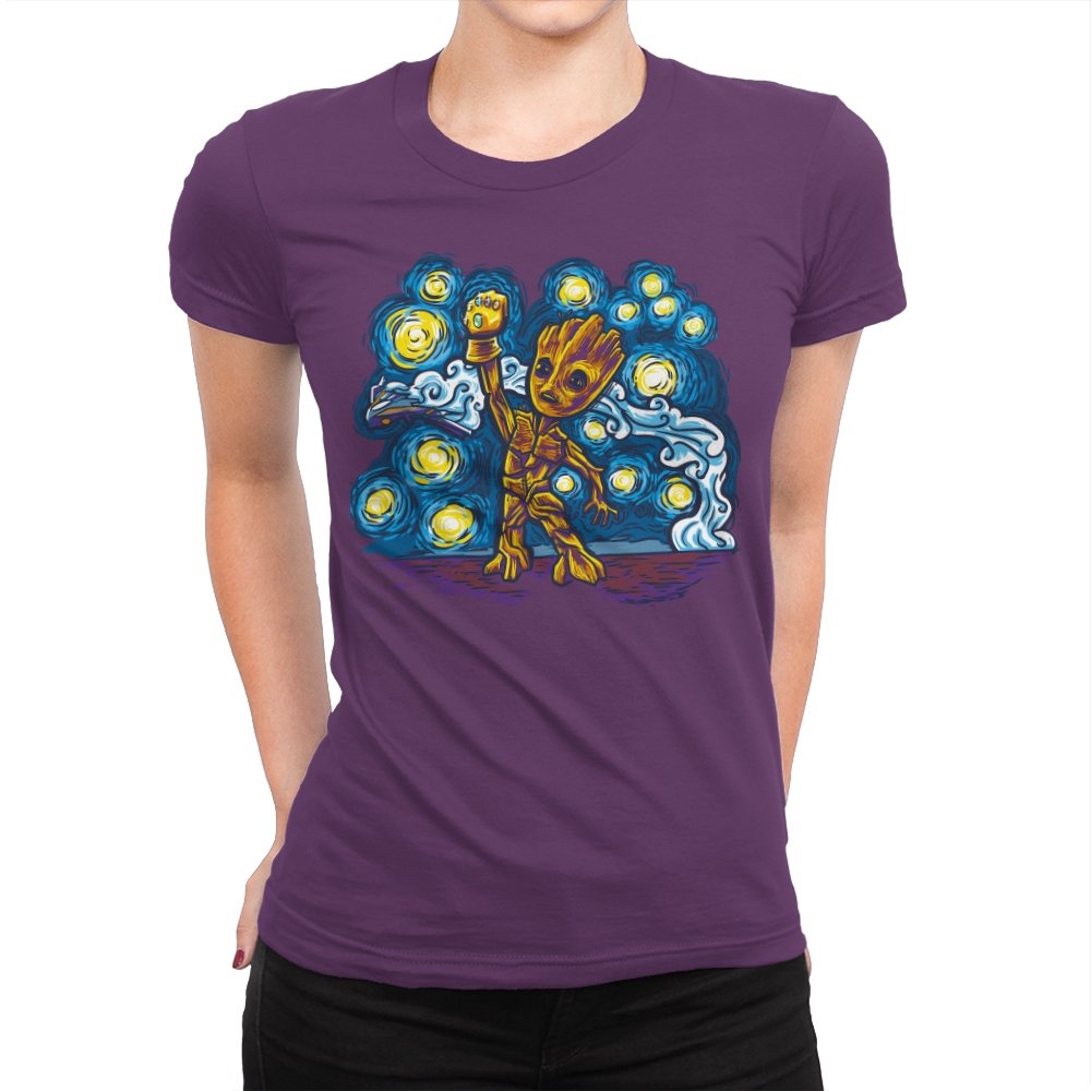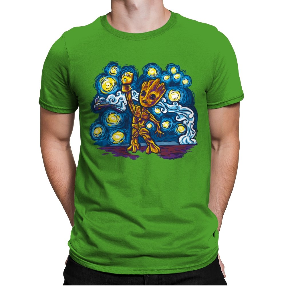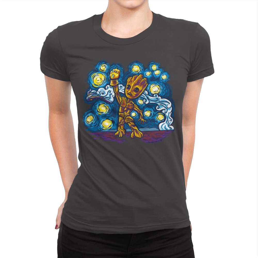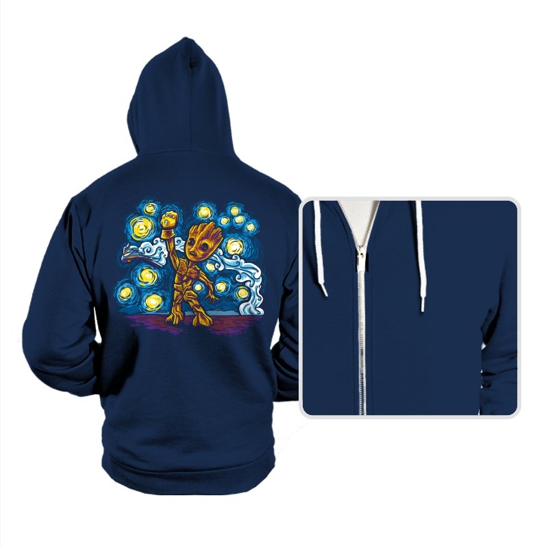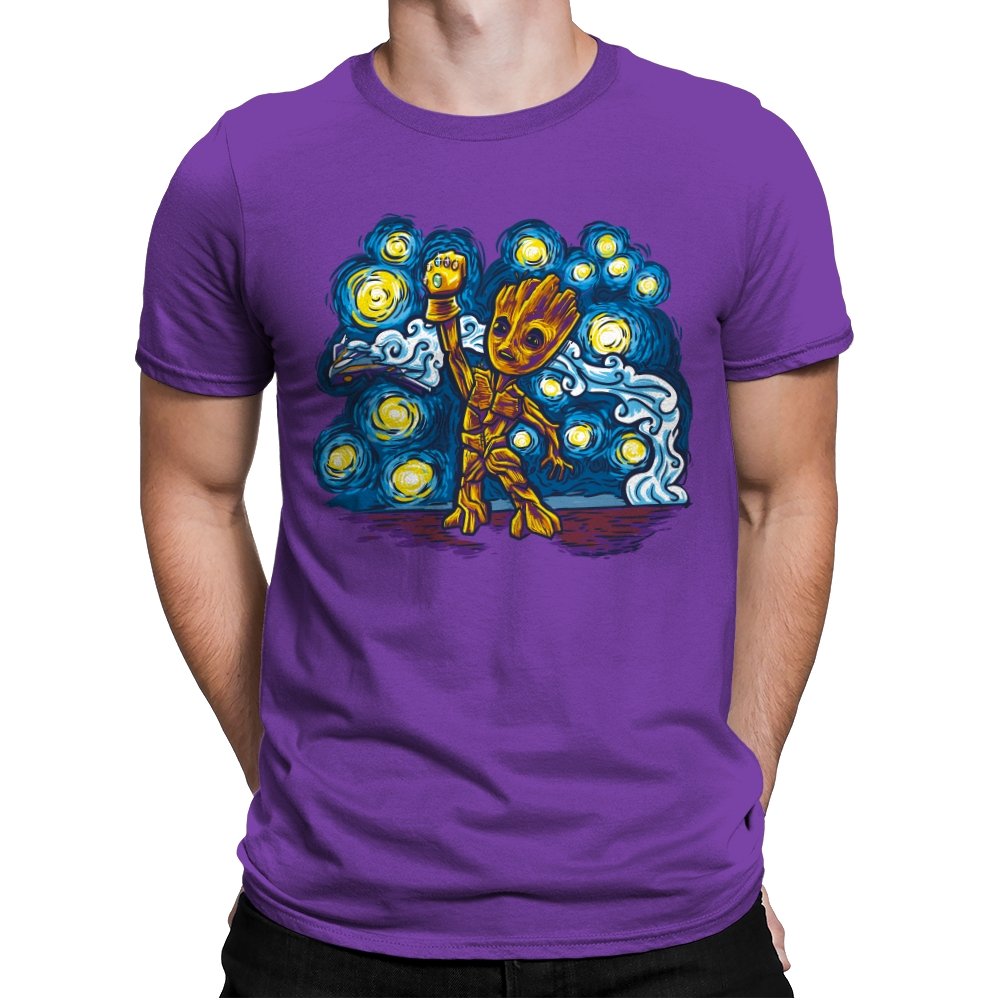 This mashup places a tiny tree hero in the middle of a swirling star filled night. Bright strokes of yellow and blue turn the sky into motion while a sleek ship cuts through the background. The character raises a fist with youthful confidence, as if greeting the cosmos with wide eyed energy. It feels playful and painterly at the same time, mixing space adventure with post impressionist flourish.
