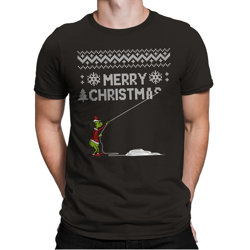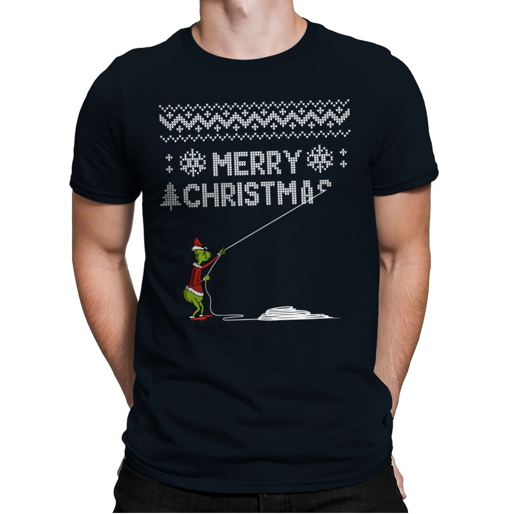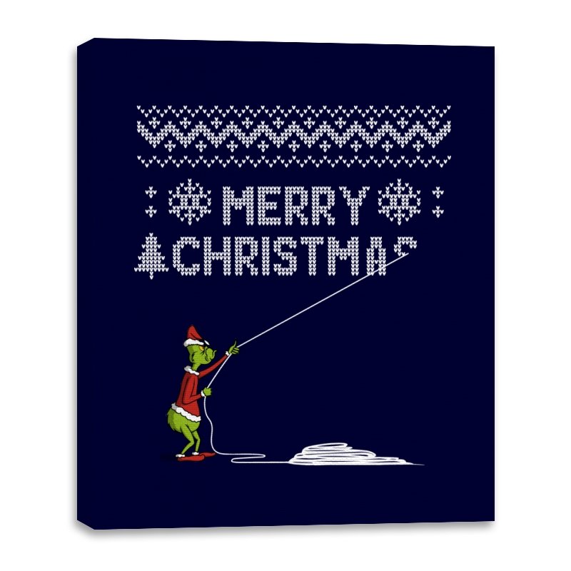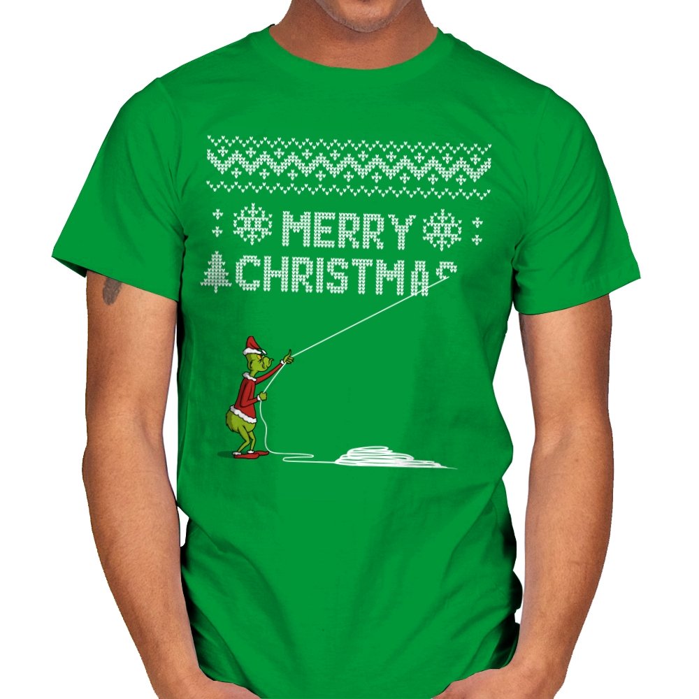 This design swaps in a certain green holiday saboteur and drops him into an ugly sweater scene. Faux knit stitches spell out “Merry Christmas” above him, but he tugs on a long thread to unravel the whole message. Snowflakes and simple sweater motifs hover overhead while a pile of yarn gathers at his feet. Fans know the reference immediately because the pose, the outfit, and the attitude all match the story.