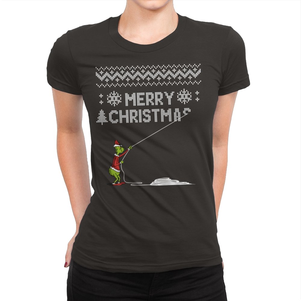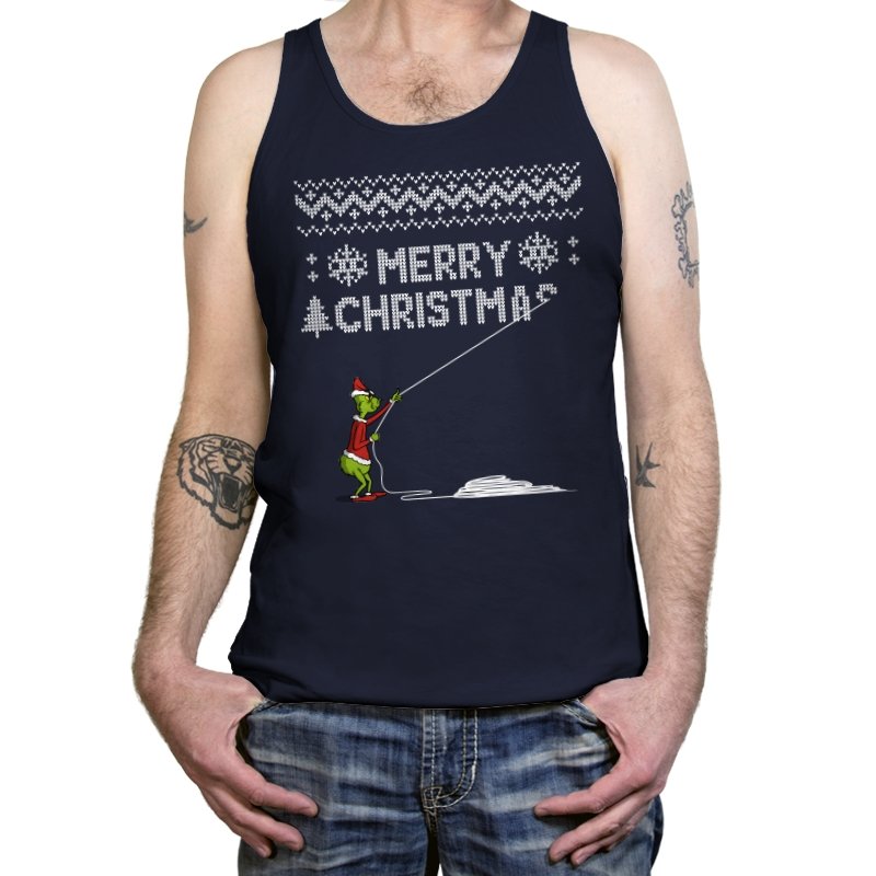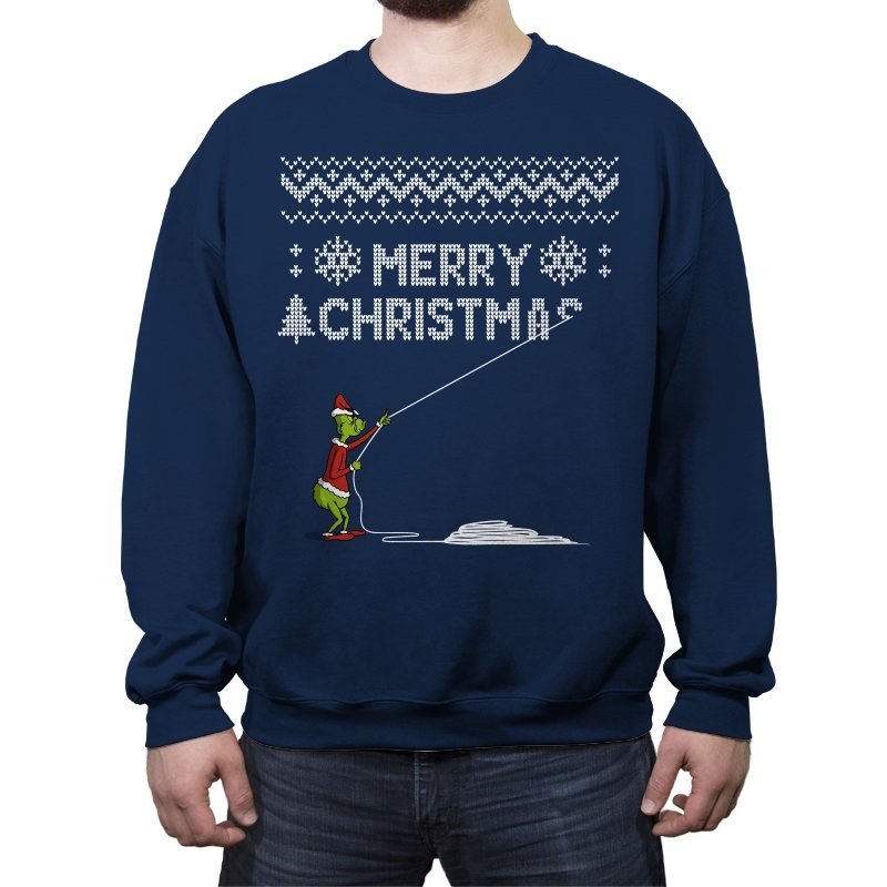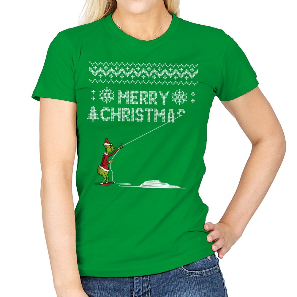 This design swaps in a certain green holiday saboteur and drops him into an ugly sweater scene. Faux knit stitches spell out “Merry Christmas” above him, but he tugs on a long thread to unravel the whole message. Snowflakes and simple sweater motifs hover overhead while a pile of yarn gathers at his feet. Fans know the reference immediately because the pose, the outfit, and the attitude all match the story.