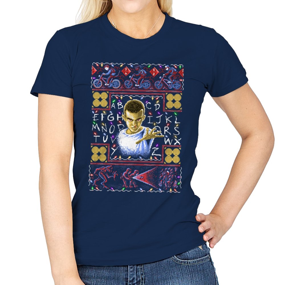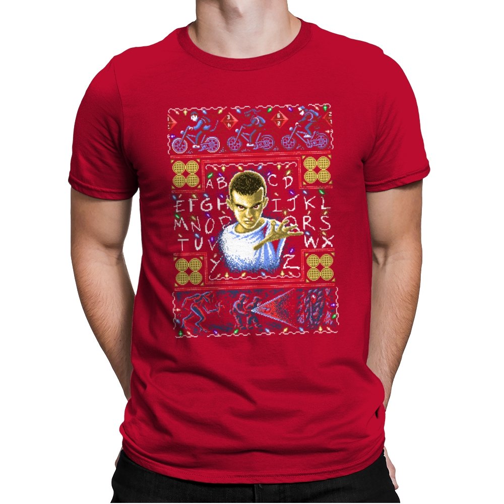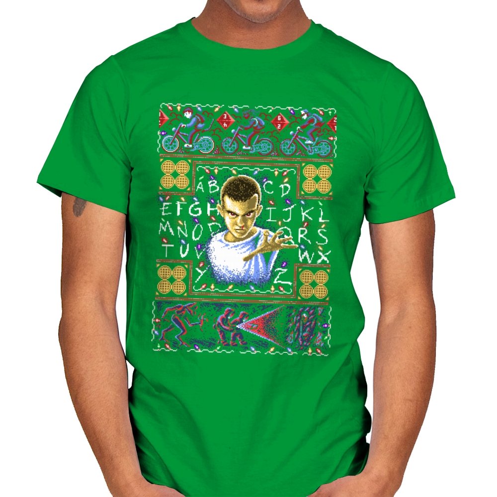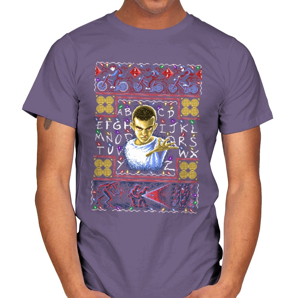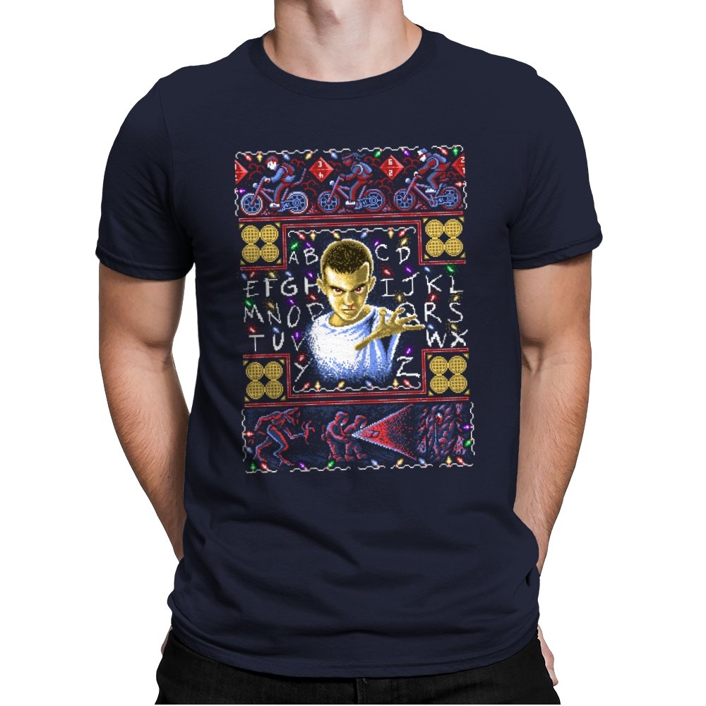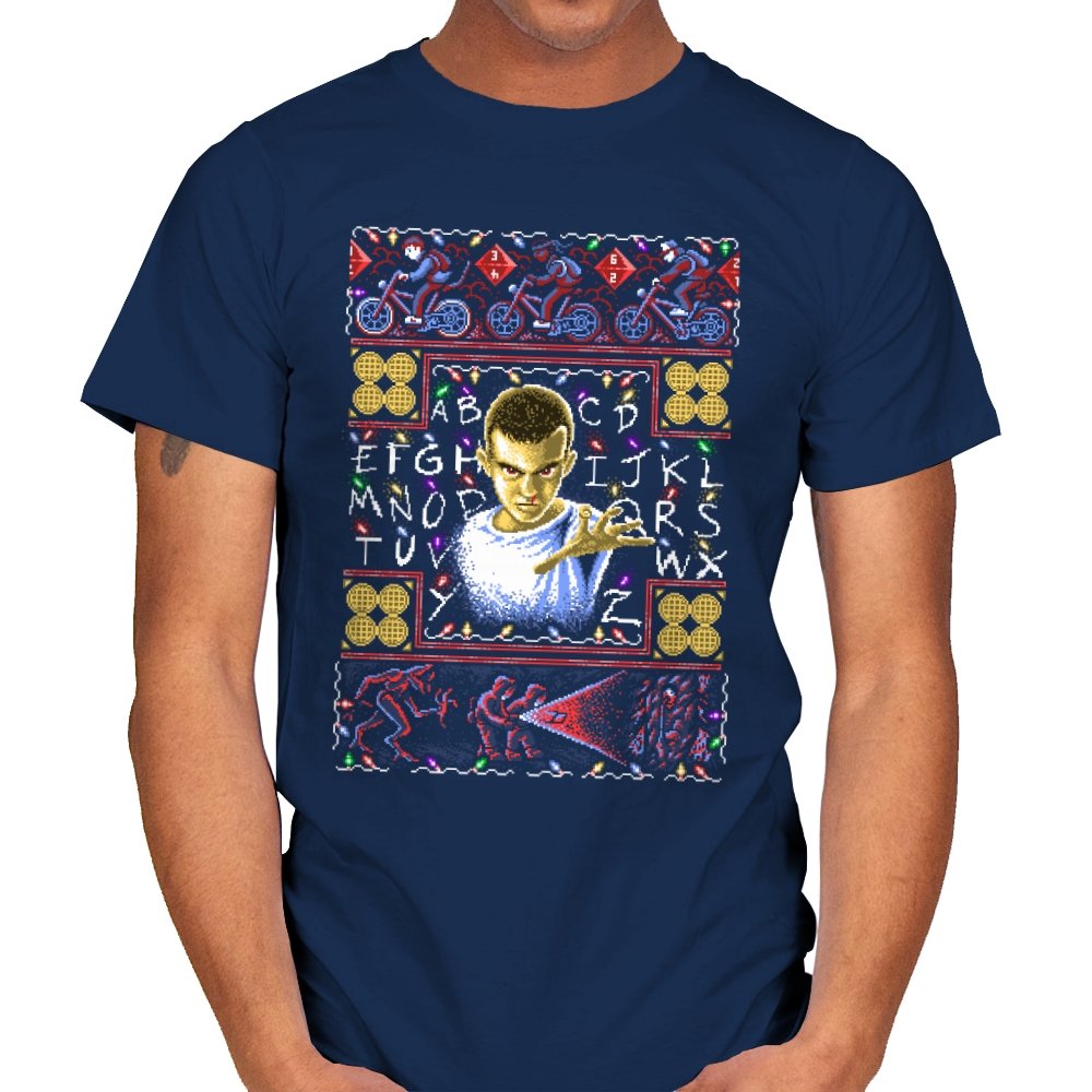 This design turns a holiday sweater into a portal between small town suburbia and something darker. At the center is a shaved head kid in a hospital gown, palm raised mid psychic push. Surrounding the portrait are neon bicycles, alphabet lights strung across a black wall, and shapes that hint at government labs and creatures from the other side. The whole piece uses faux knit textures but keeps the imagery bold, like an anomaly that refuses to stay quiet during December.