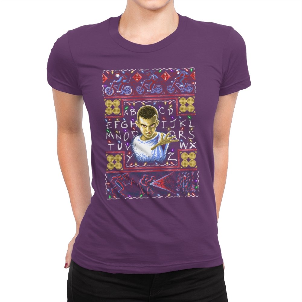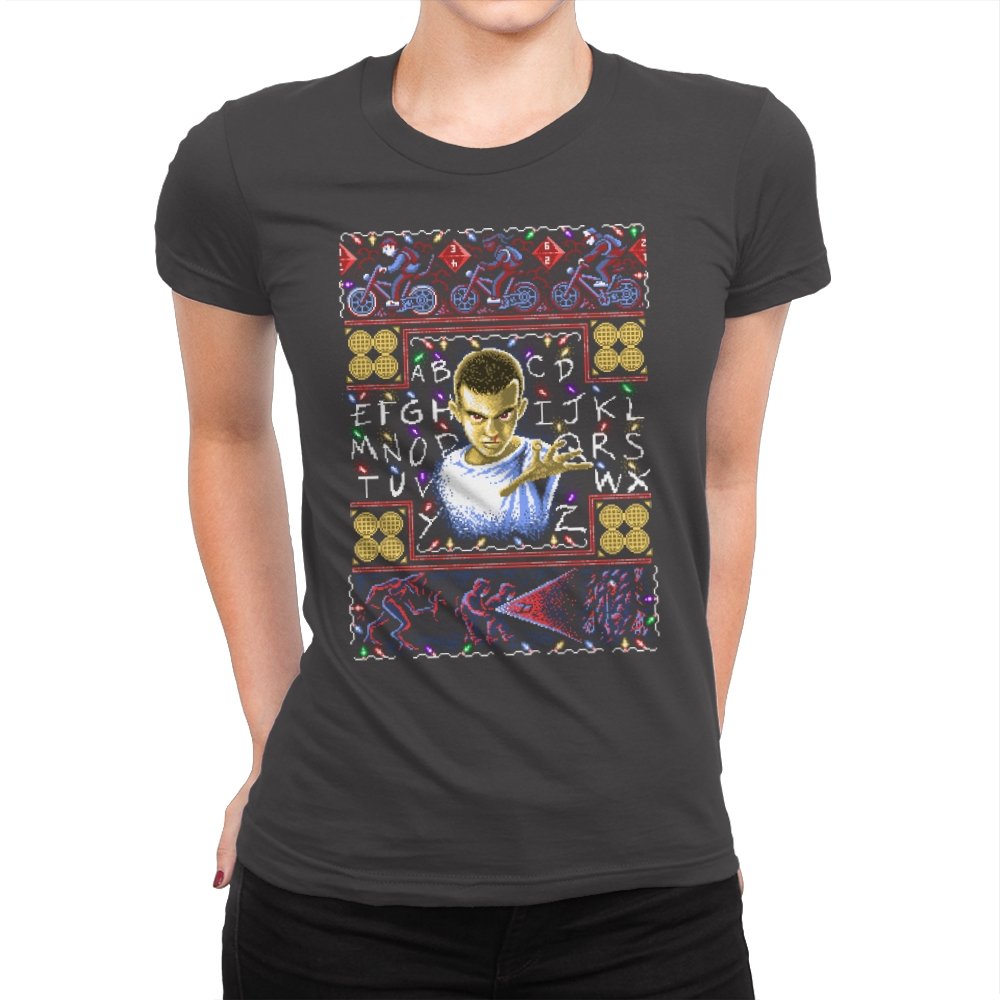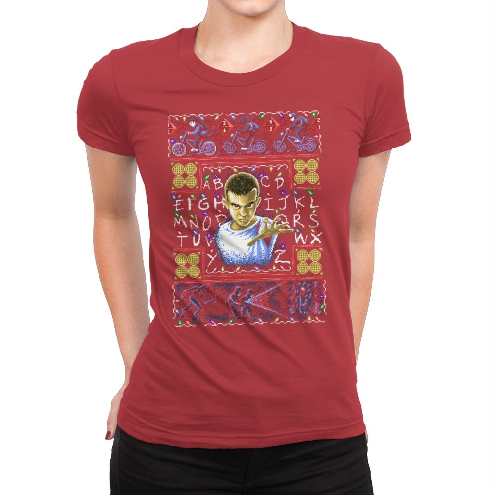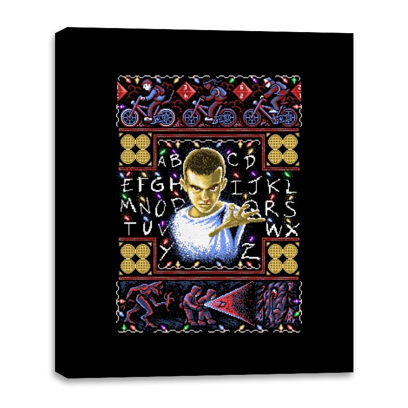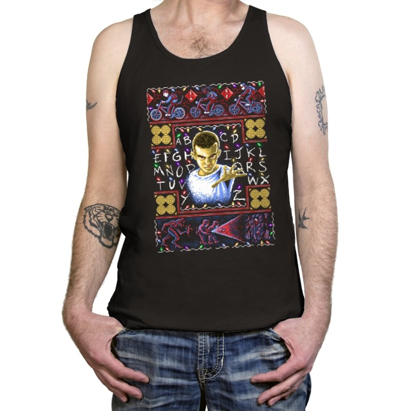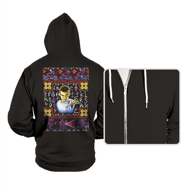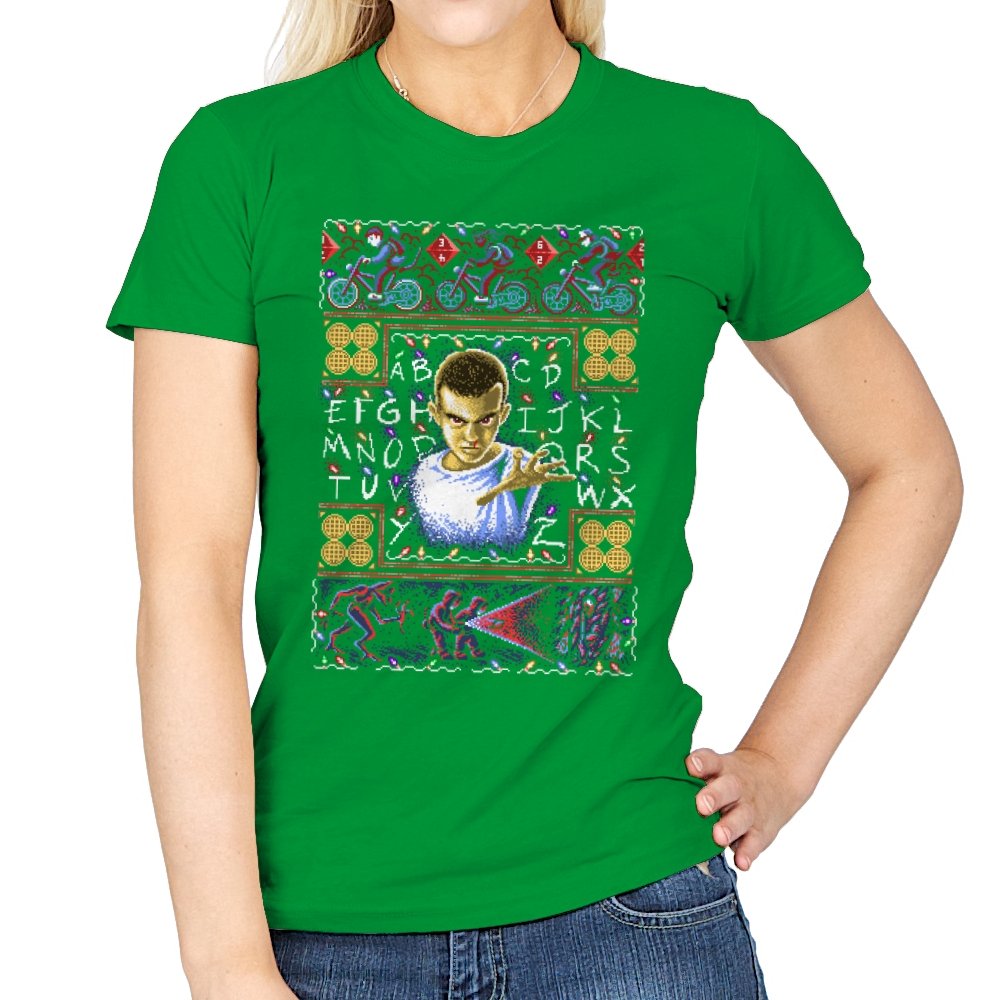 This design turns a holiday sweater into a portal between small town suburbia and something darker. At the center is a shaved head kid in a hospital gown, palm raised mid psychic push. Surrounding the portrait are neon bicycles, alphabet lights strung across a black wall, and shapes that hint at government labs and creatures from the other side. The whole piece uses faux knit textures but keeps the imagery bold, like an anomaly that refuses to stay quiet during December.