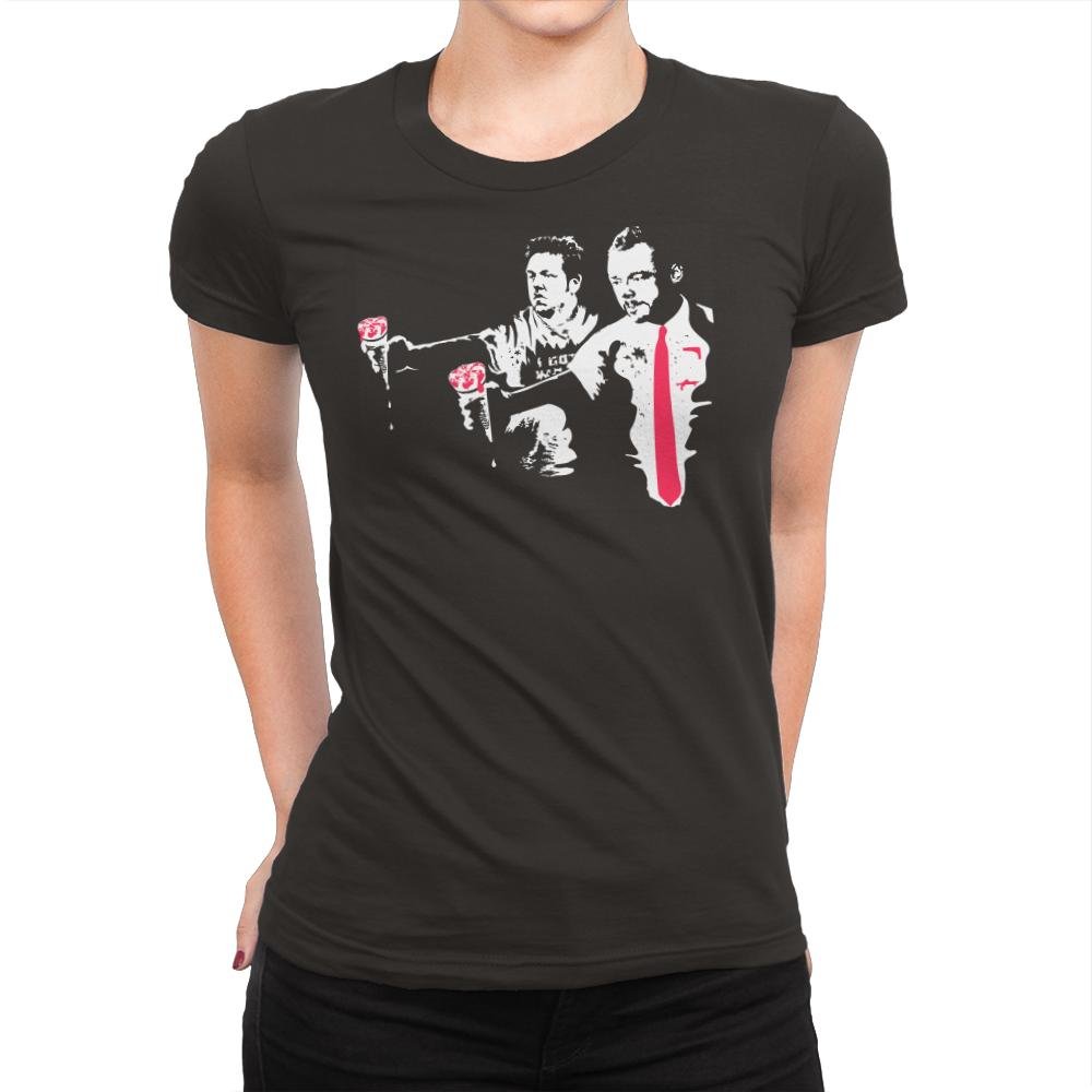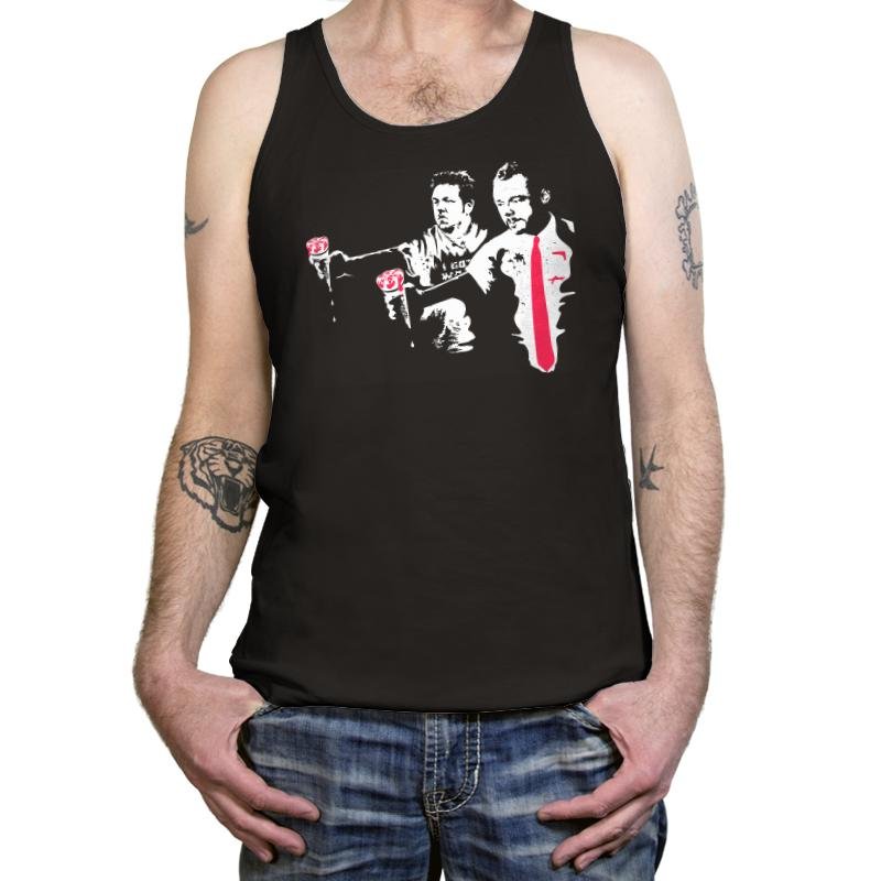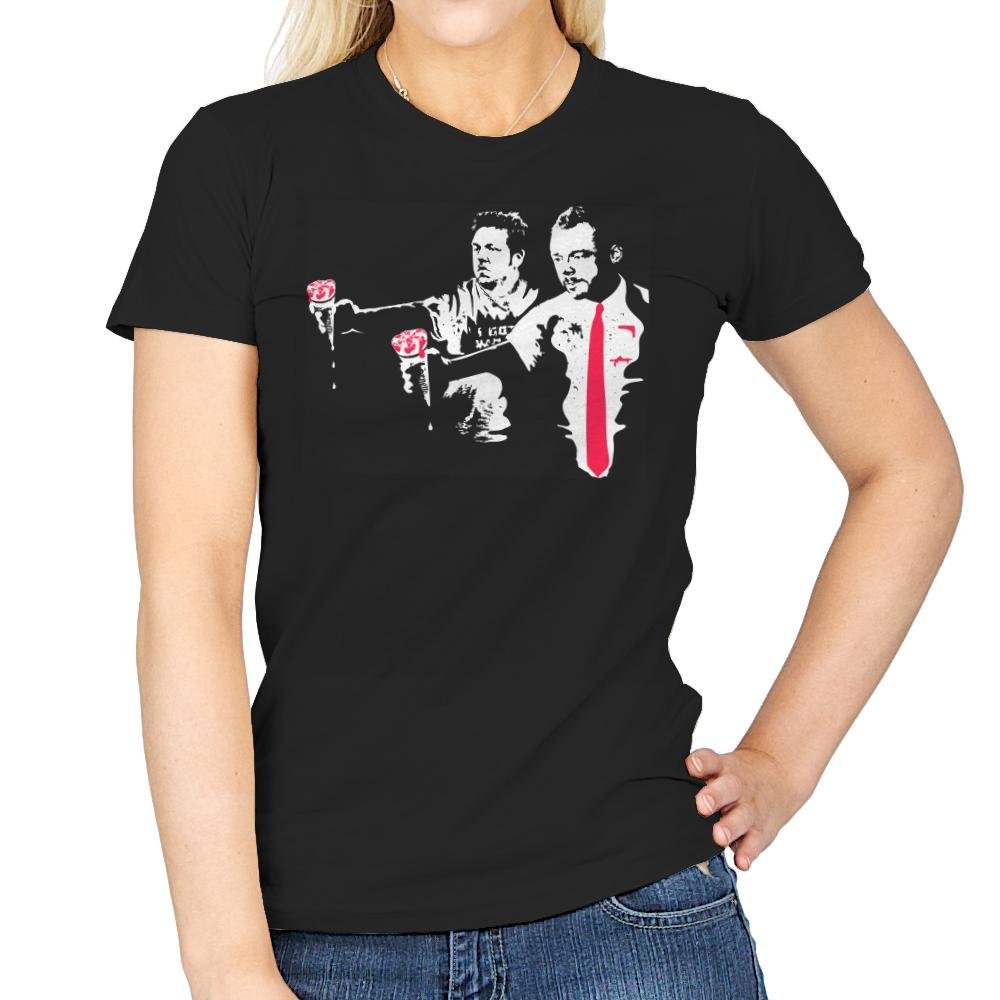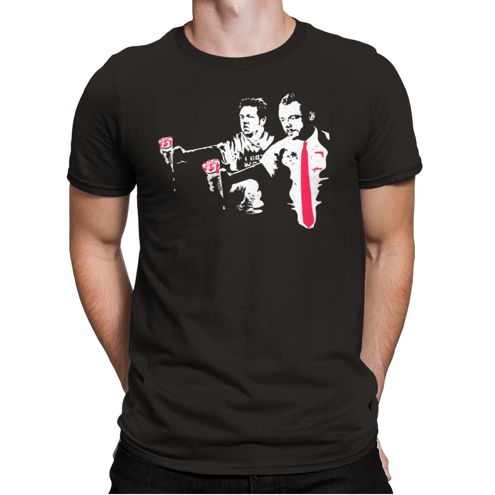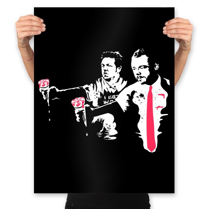This design puts a unique spin on a well-known movie reference, showcasing two characters in iconic poses with a striking pink tie and bold accents. The design highlights a retro, gritty aesthetic with splashes of color, drawing attention to the contrasting personalities and the underlying intensity of the moment. The imagery evokes a sense of stylish rebellion, offering a subtle nod to pop culture that fans of unconventional cinema will recognize instantly.