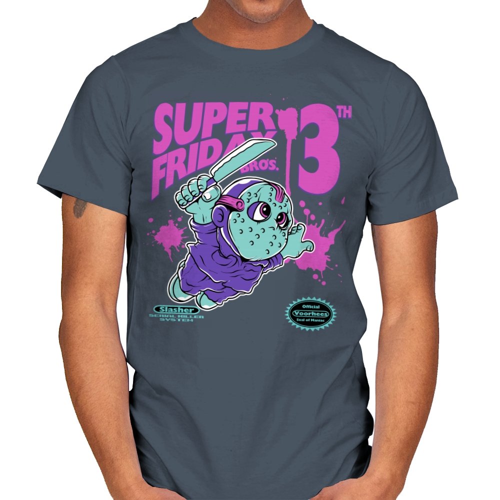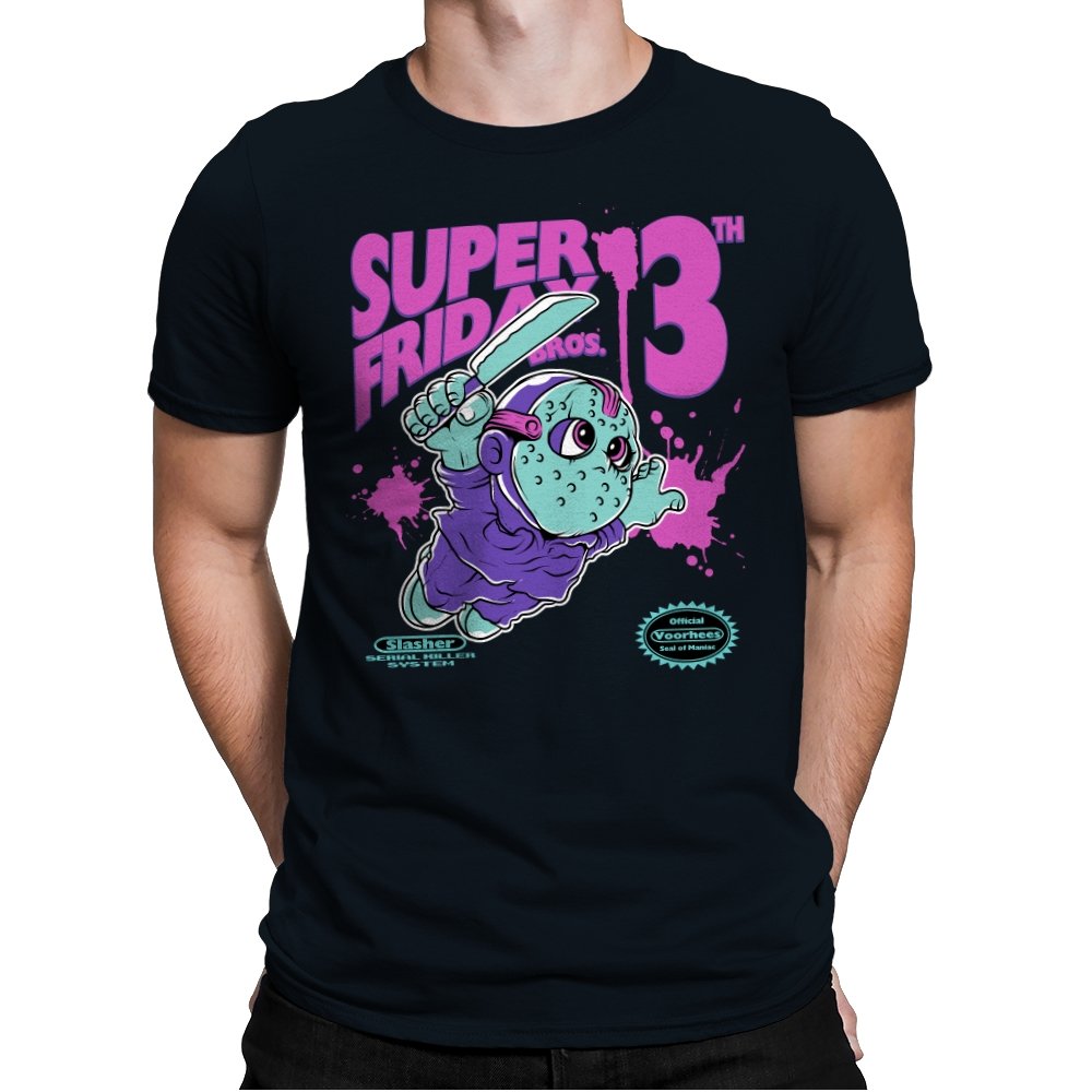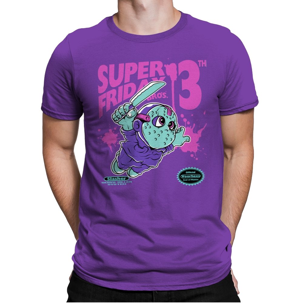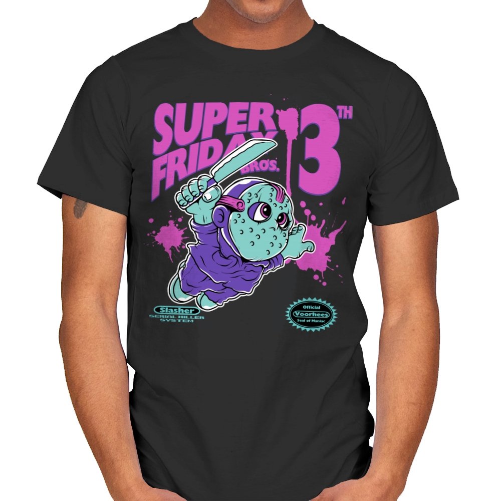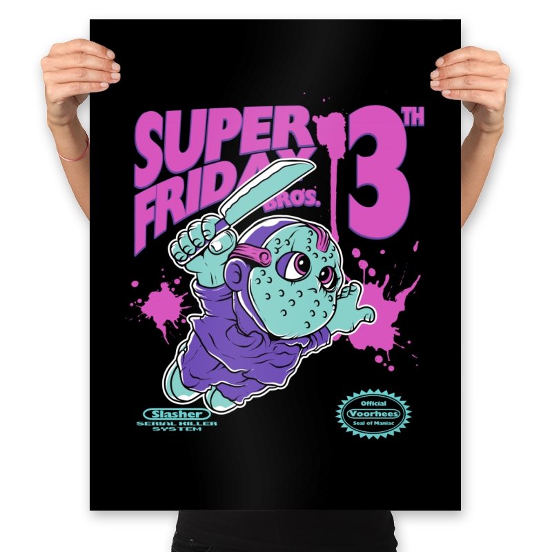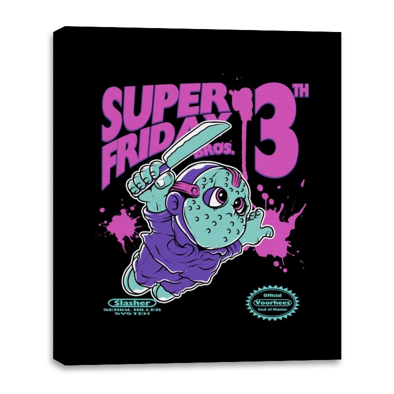 Super Friday Bros recasts a hockey-masked slasher as a retro platform hero. The tiny bruiser sprints forward with a knife raised, boots kicking up neon splatter as the giant “13th” looms behind him. Faux cartridge seals and a mock system label sell the joke, making it feel like a lost eight-bit tie-in for the world’s most unlucky camp. The purple and teal palette gives it that old rental-store glow that fans recognize instantly.
