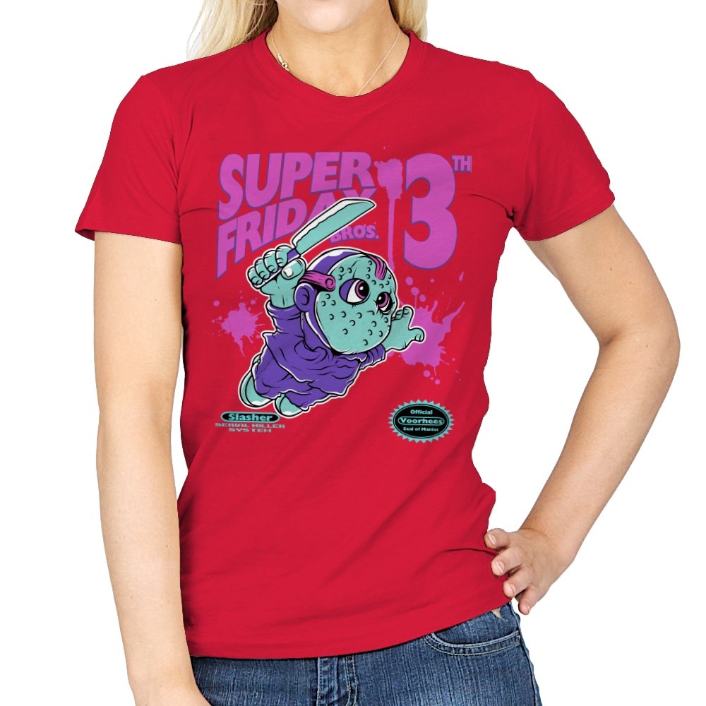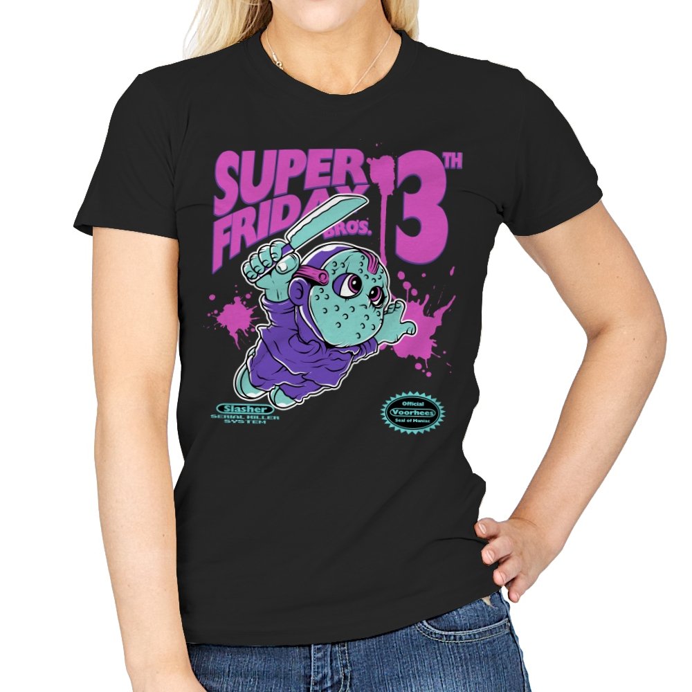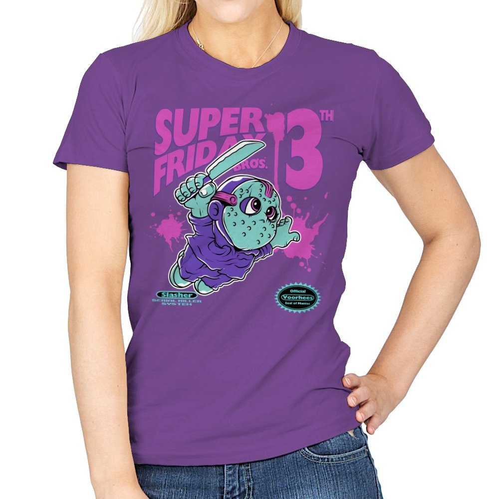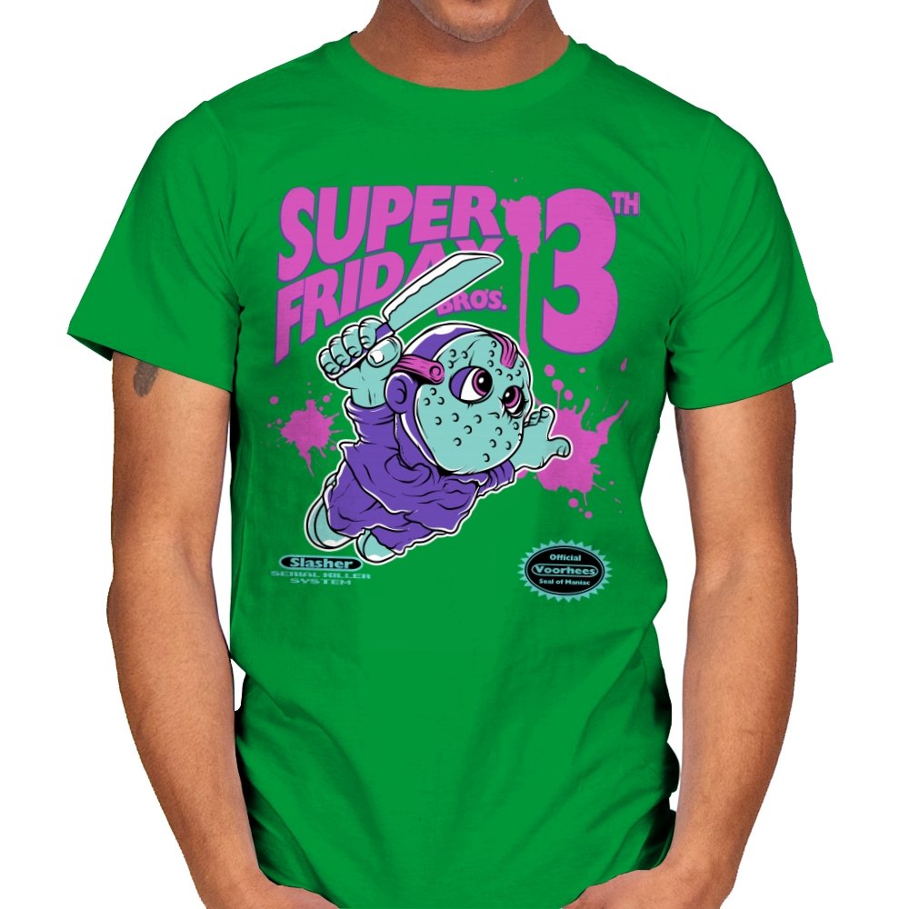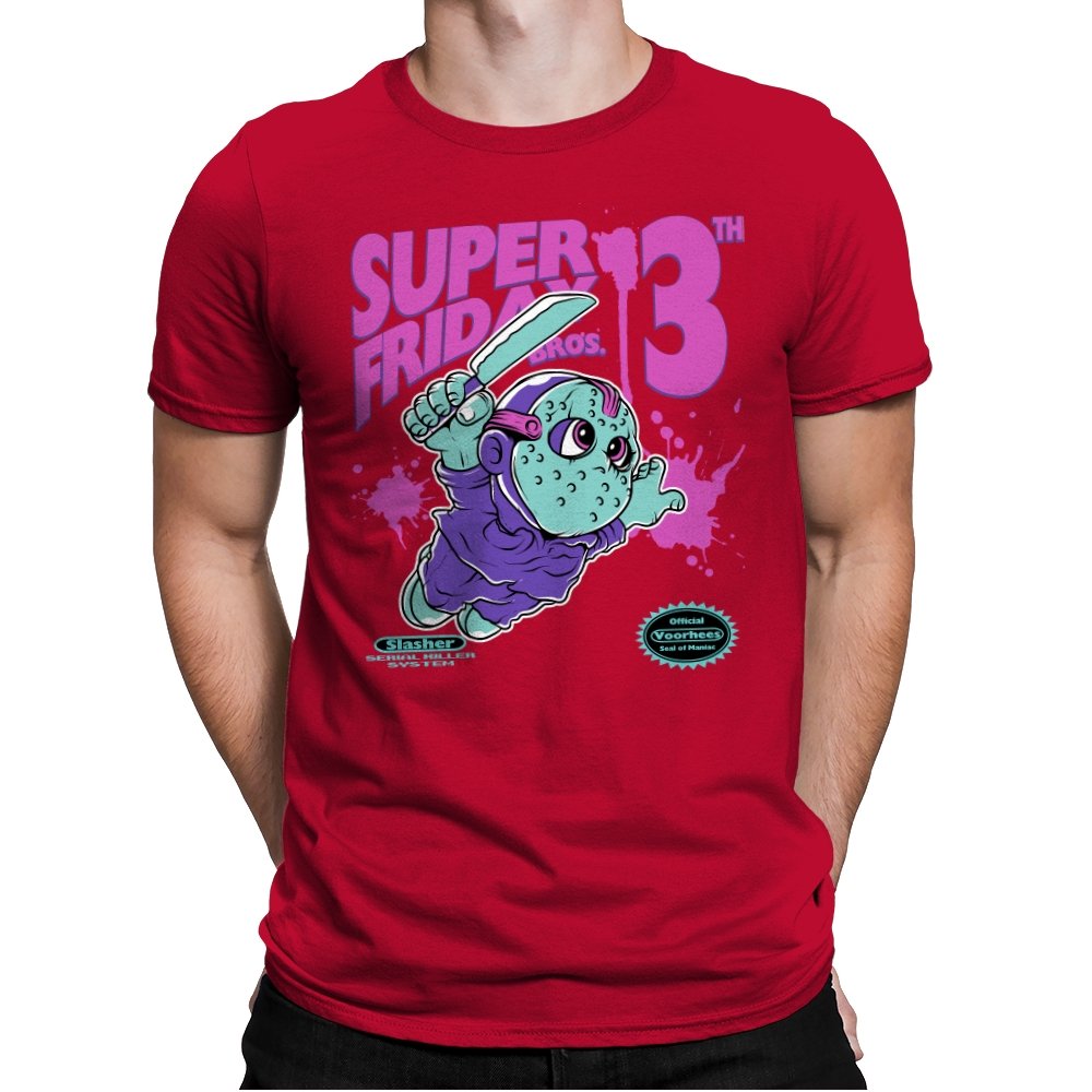 Super Friday Bros recasts a hockey-masked slasher as a retro platform hero. The tiny bruiser sprints forward with a knife raised, boots kicking up neon splatter as the giant “13th” looms behind him. Faux cartridge seals and a mock system label sell the joke, making it feel like a lost eight-bit tie-in for the world’s most unlucky camp. The purple and teal palette gives it that old rental-store glow that fans recognize instantly.