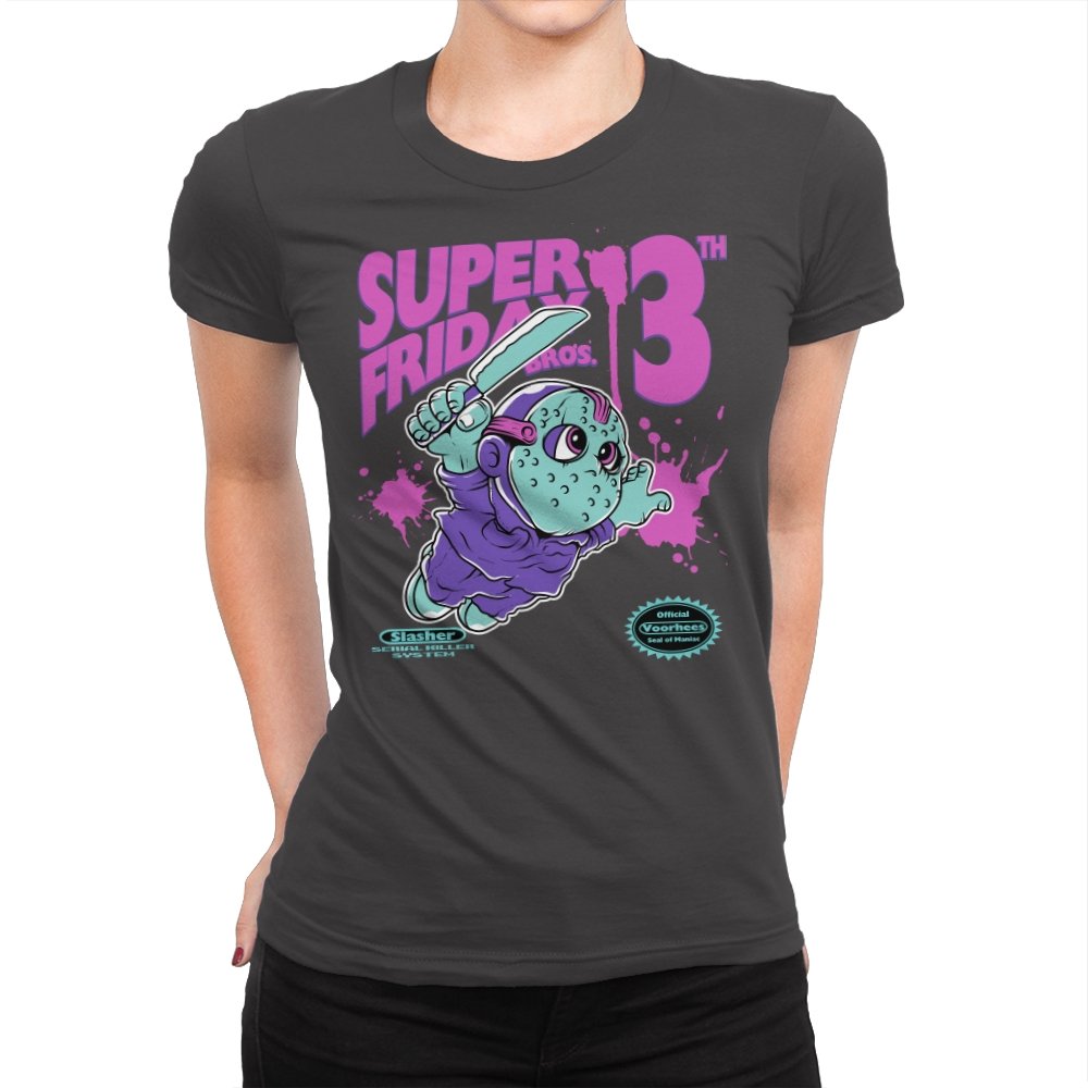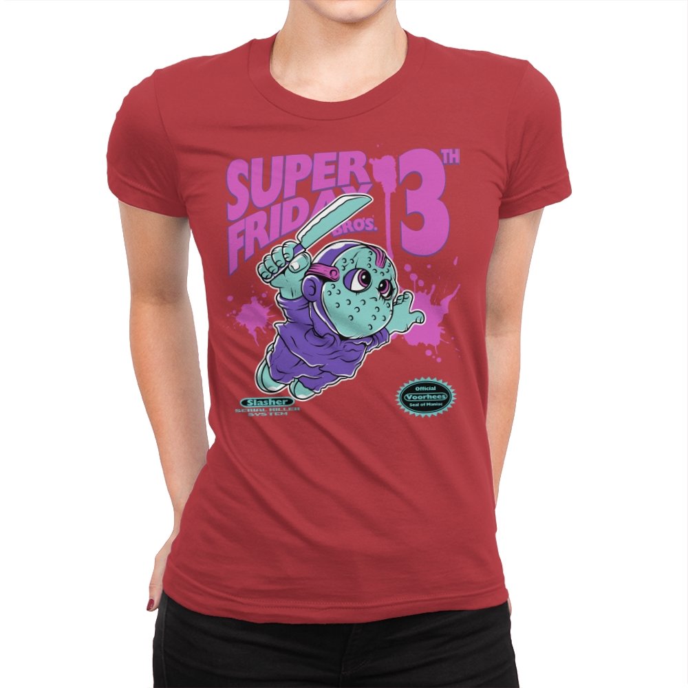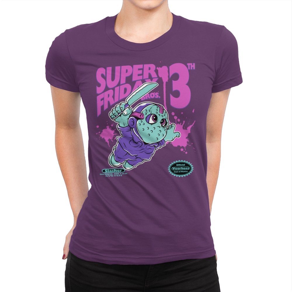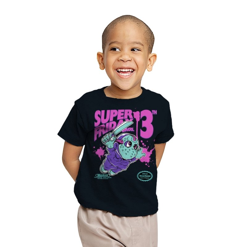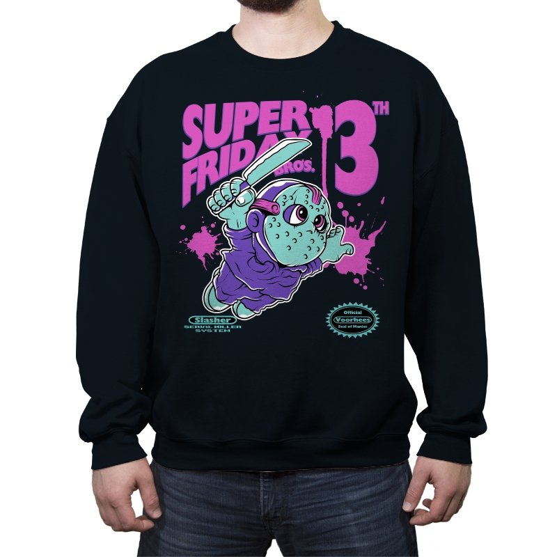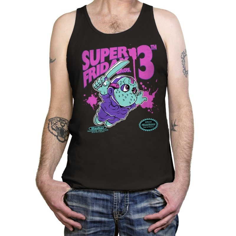 Super Friday Bros recasts a hockey-masked slasher as a retro platform hero. The tiny bruiser sprints forward with a knife raised, boots kicking up neon splatter as the giant “13th” looms behind him. Faux cartridge seals and a mock system label sell the joke, making it feel like a lost eight-bit tie-in for the world’s most unlucky camp. The purple and teal palette gives it that old rental-store glow that fans recognize instantly.