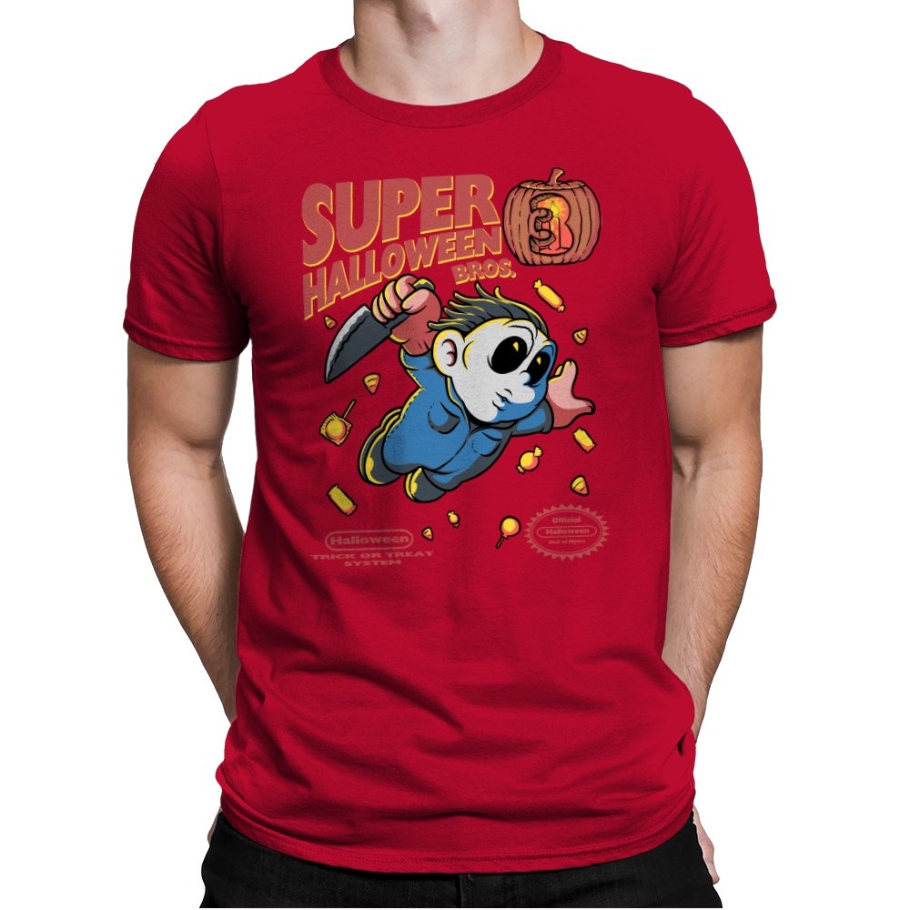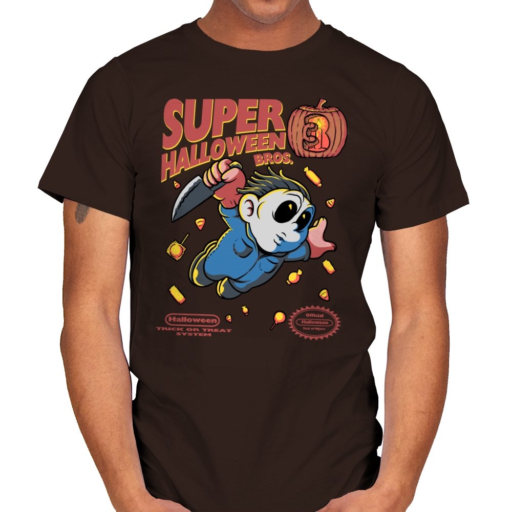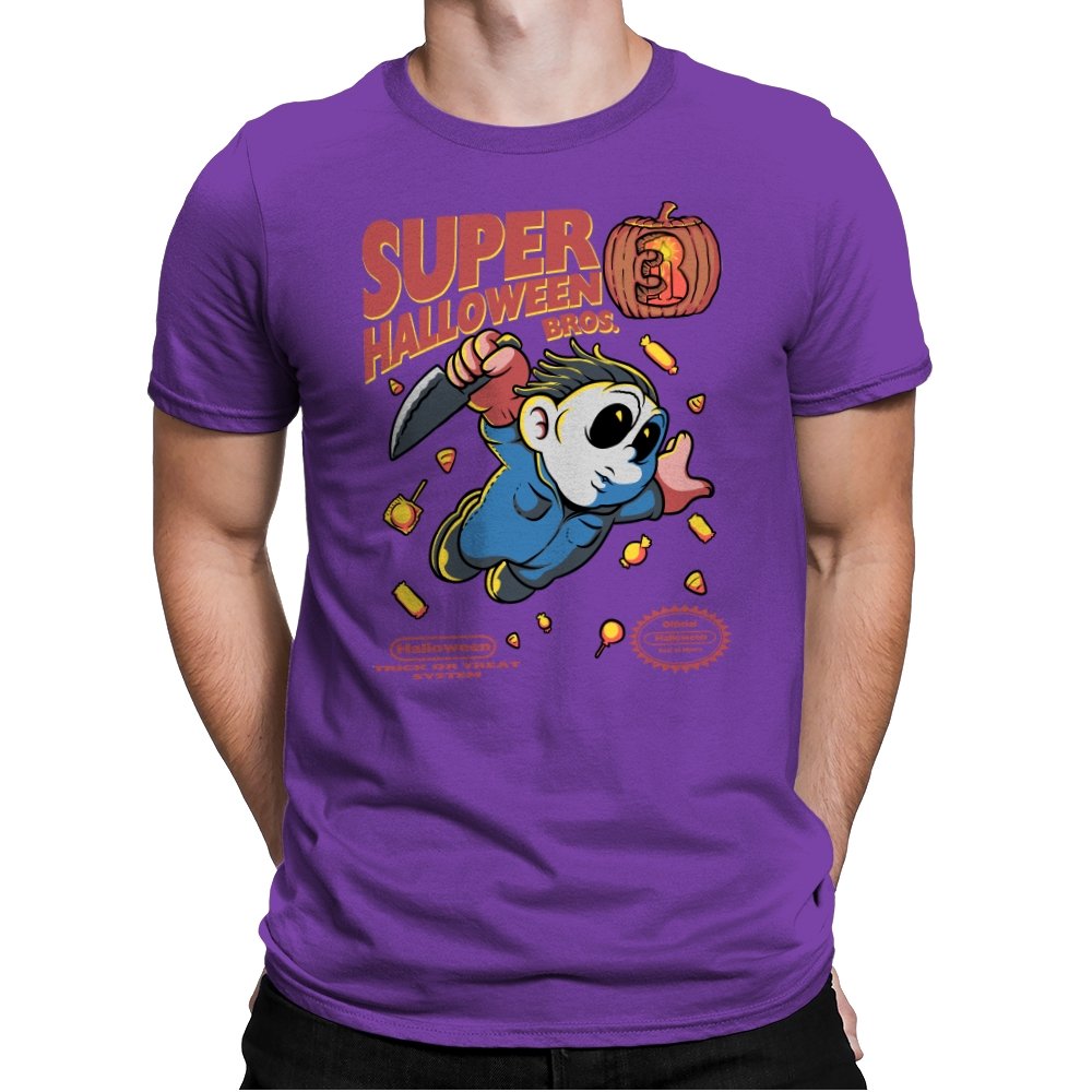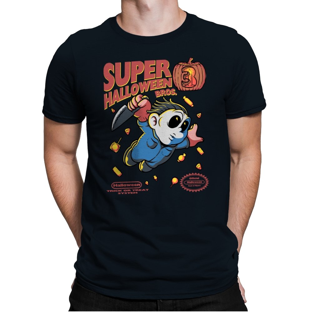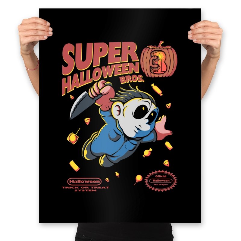 Super Halloween Bros turns a silent slasher into a platforming mascot with a sweet tooth for chaos. The chubby figure sprints forward in a jumpsuit and a mask, knife raised as candy corn scatters like bonus coins. A carved pumpkin replaces the cartridge sequel number, and faux console seals sit at the bottom to complete the illusion. It reads like a lost side-scroller where trick-or-treating goes very wrong.