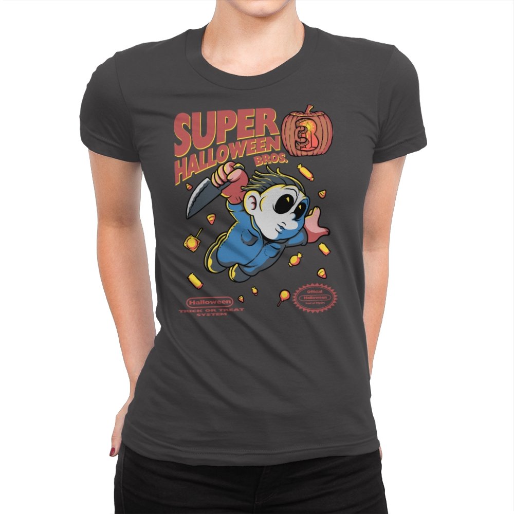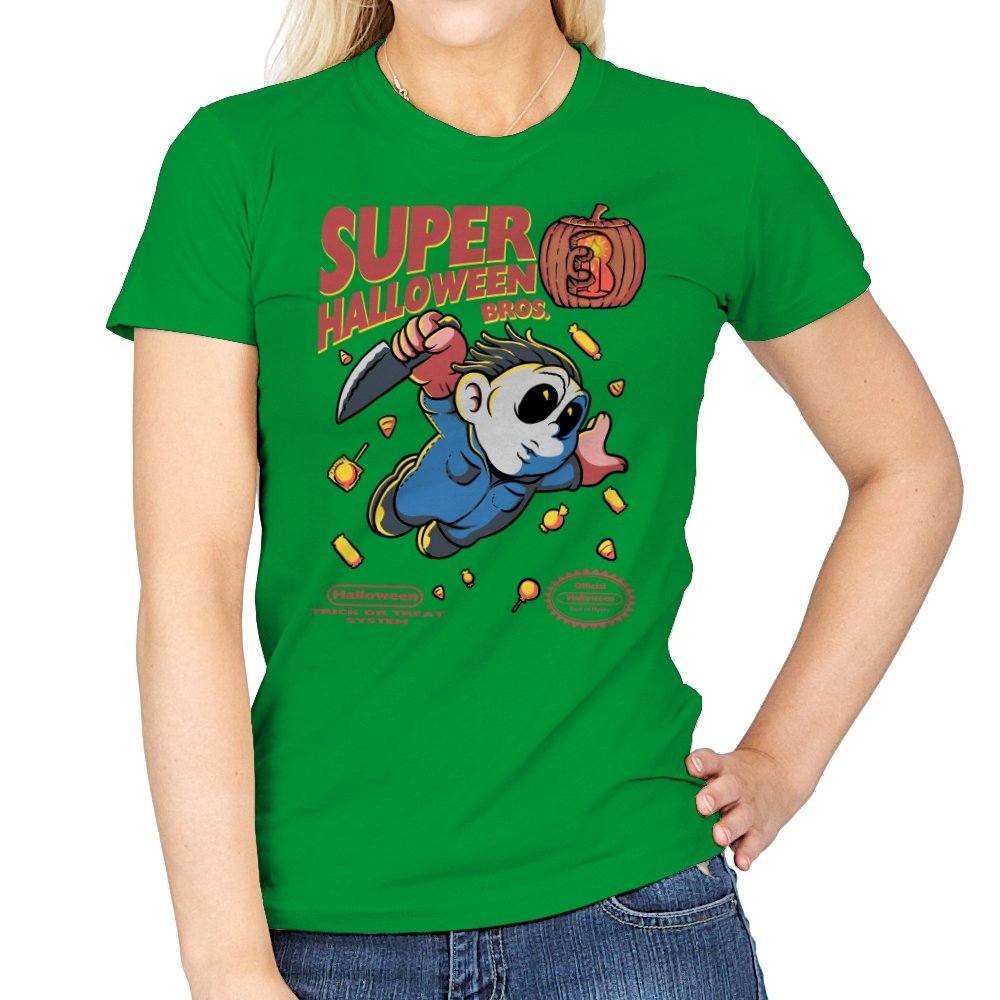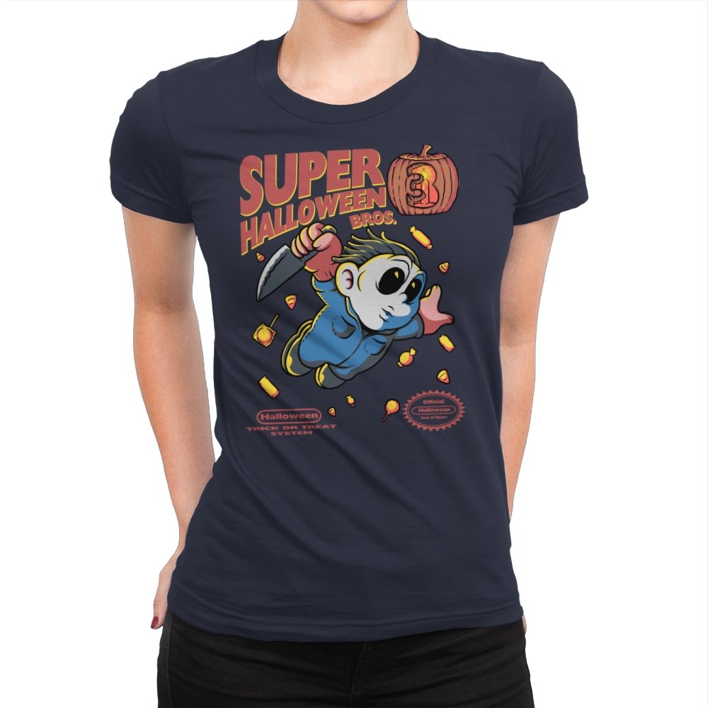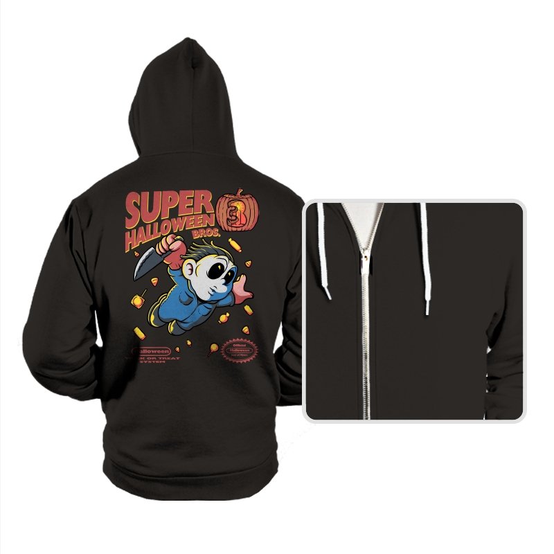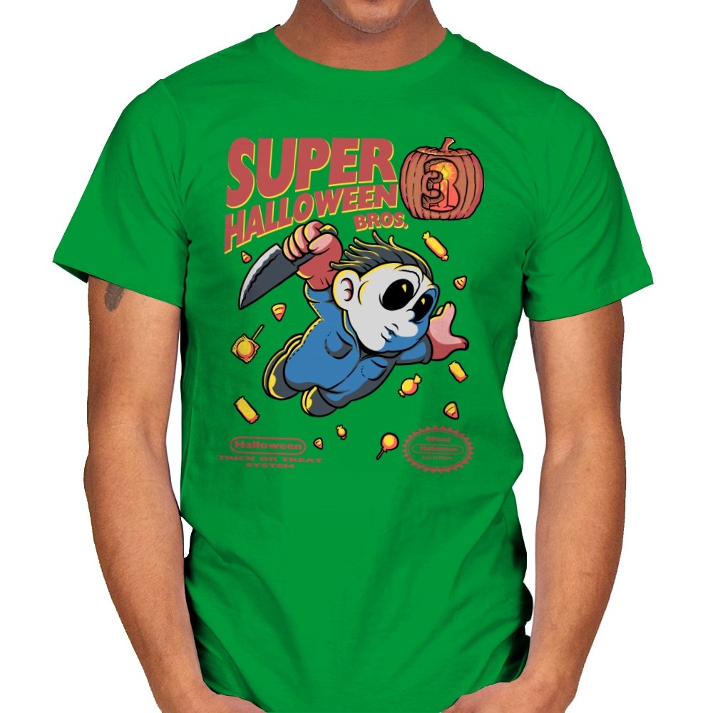 Super Halloween Bros turns a silent slasher into a platforming mascot with a sweet tooth for chaos. The chubby figure sprints forward in a jumpsuit and a mask, knife raised as candy corn scatters like bonus coins. A carved pumpkin replaces the cartridge sequel number, and faux console seals sit at the bottom to complete the illusion. It reads like a lost side-scroller where trick-or-treating goes very wrong.
