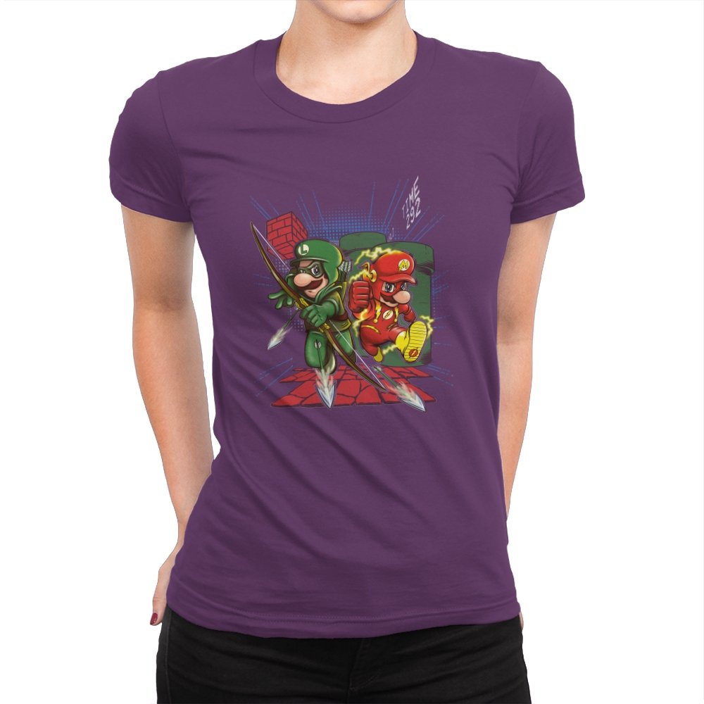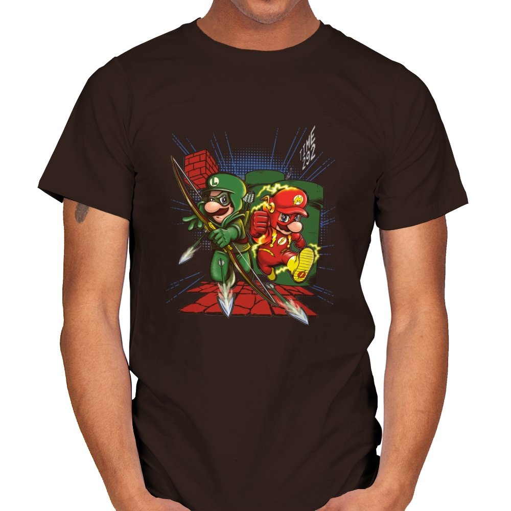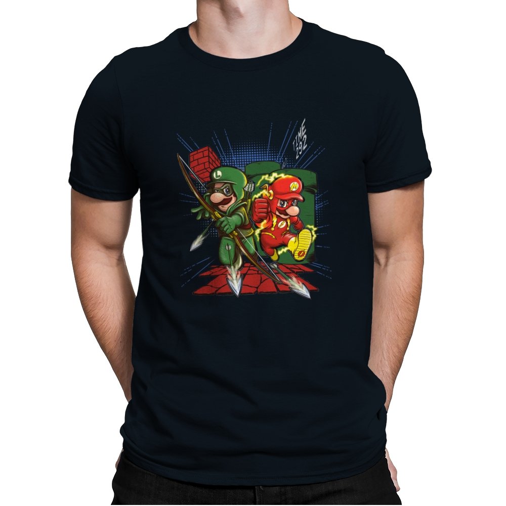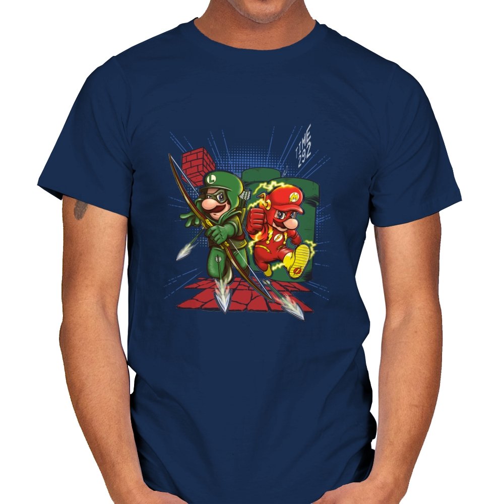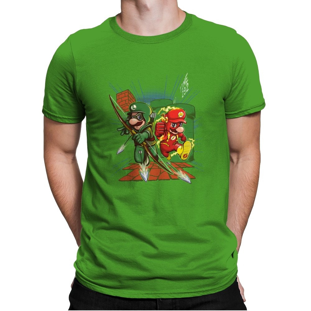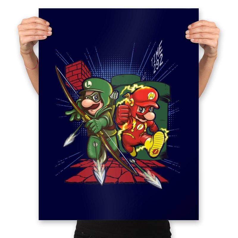 This design drops two familiar brothers into a mashup of comic book vigilantes and classic side scrolling platformers. One wears a green hood with a quiver full of arrows while the other streaks with lightning in a bright red speed suit. They burst from a warp pipe and dash across pixel blocks while arrows scatter across the scene. The small TIME readout in the corner seals the reference for anyone who has ever raced through those levels on muscle memory alone.