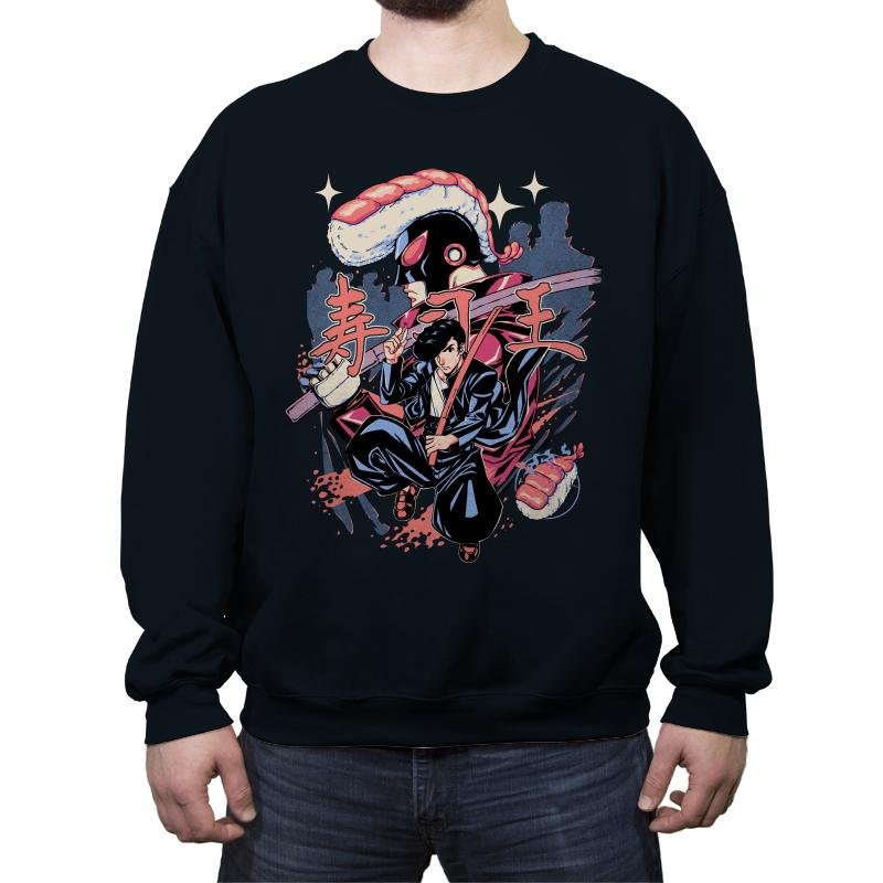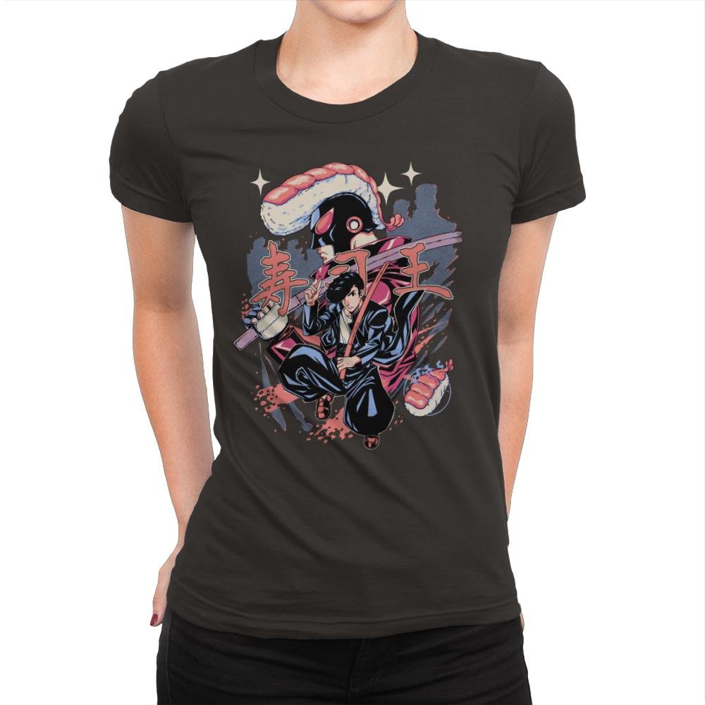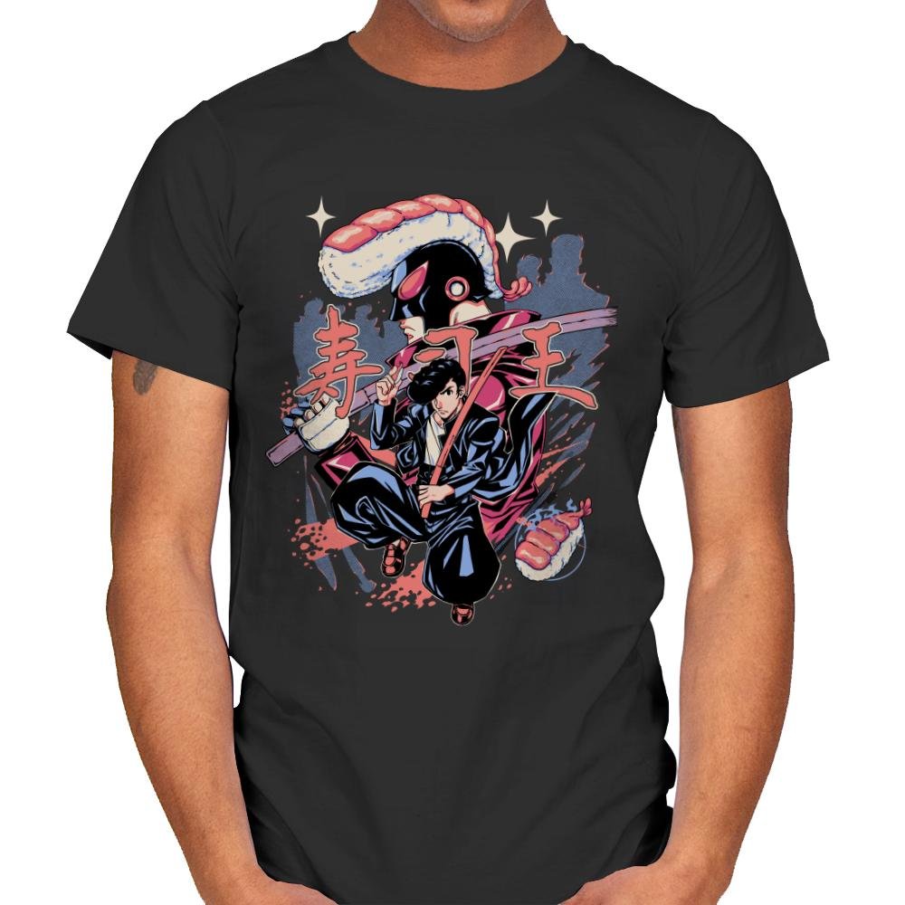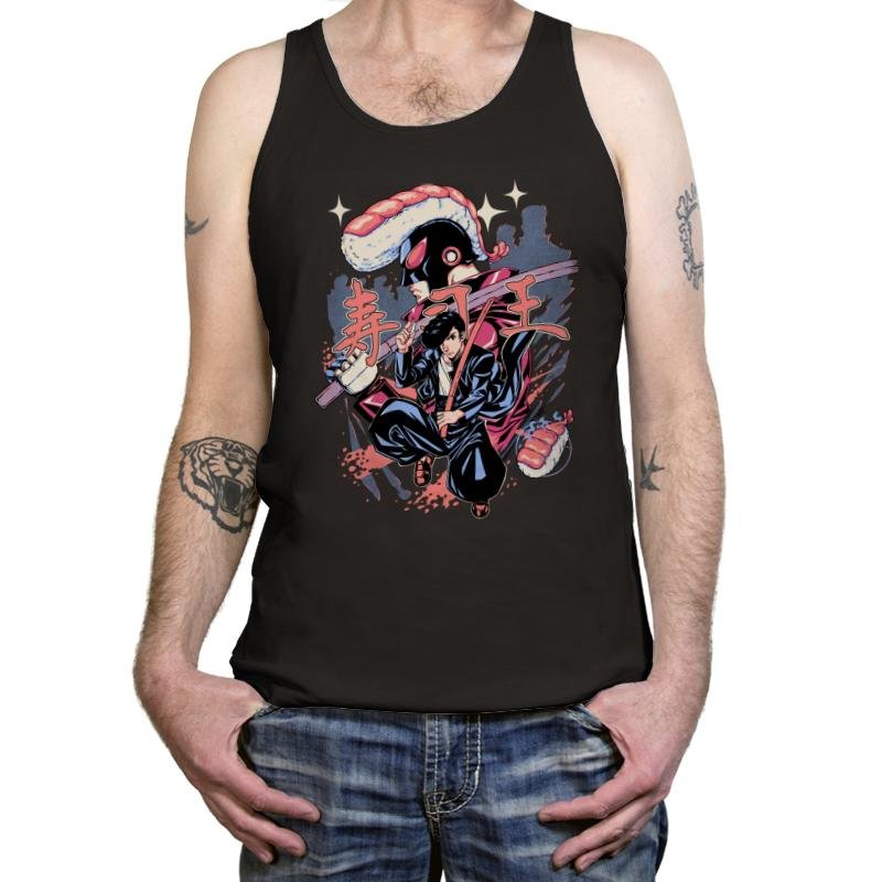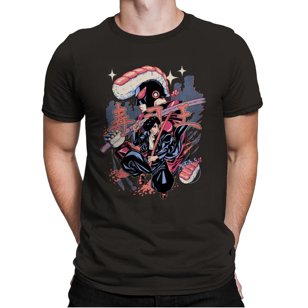 This illustration imagines a martial arts protagonist locked in battle with a sentient sushi monster. The human fighter wields a katana while rolls and nigiri orbit the scene like projectiles from an arcade boss. The villainous sushi creature towers above with a glossy salmon headpiece and dark robe, and Japanese text completes the retro action poster aesthetic. Fans of manga, tokusatsu, and culinary chaos will translate the joke without blinking.