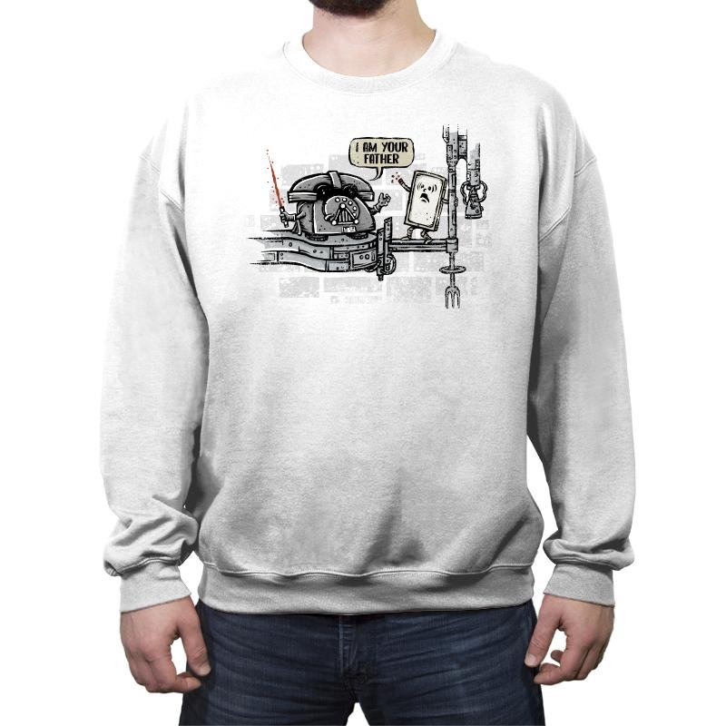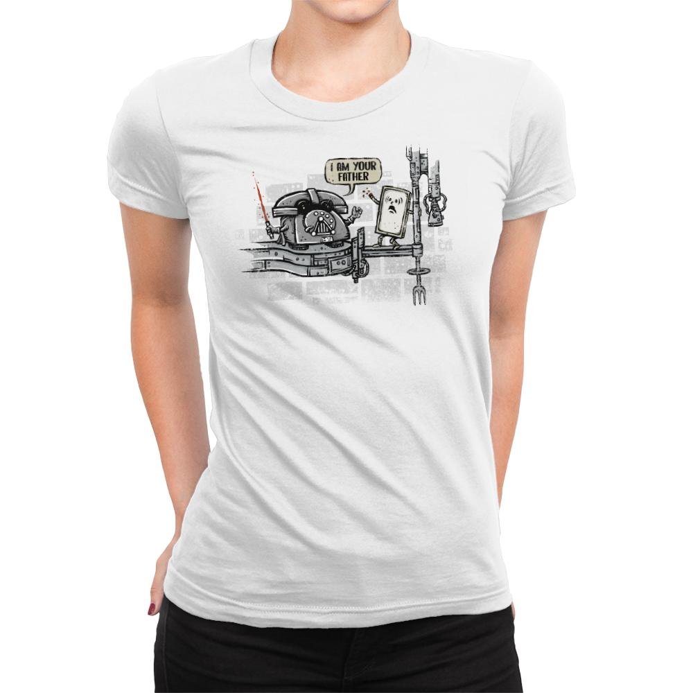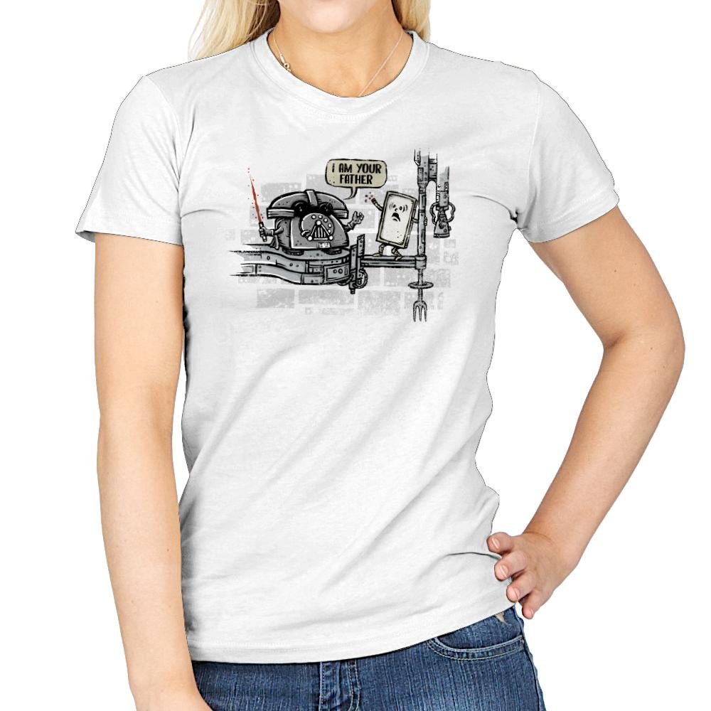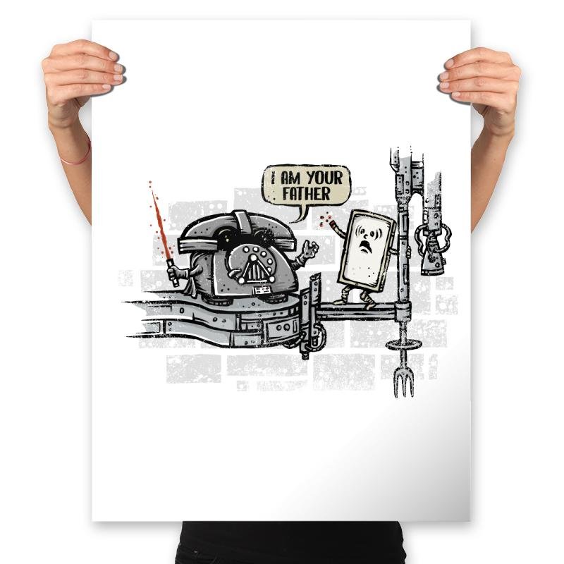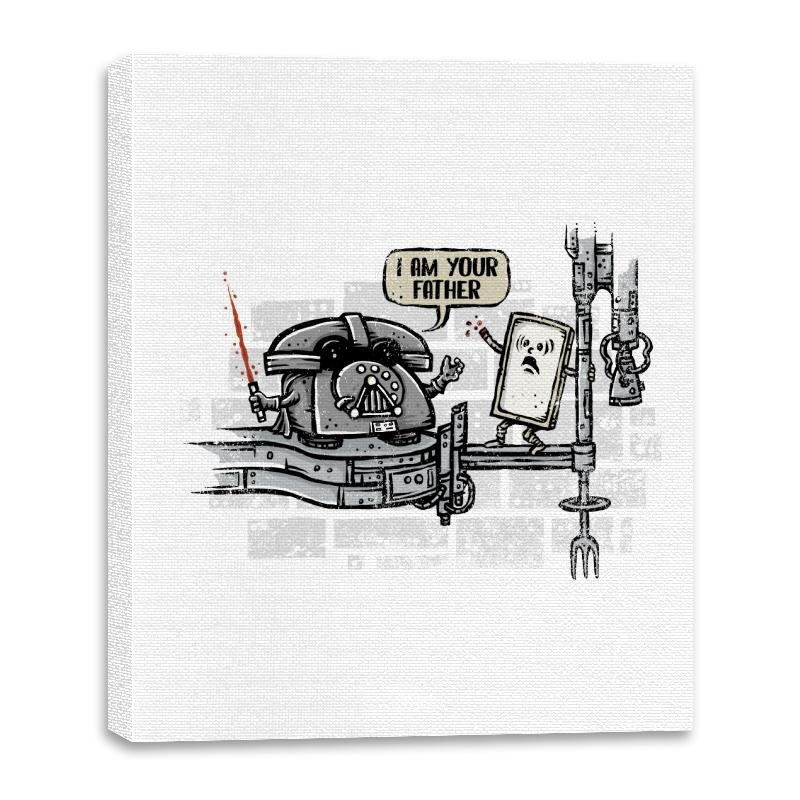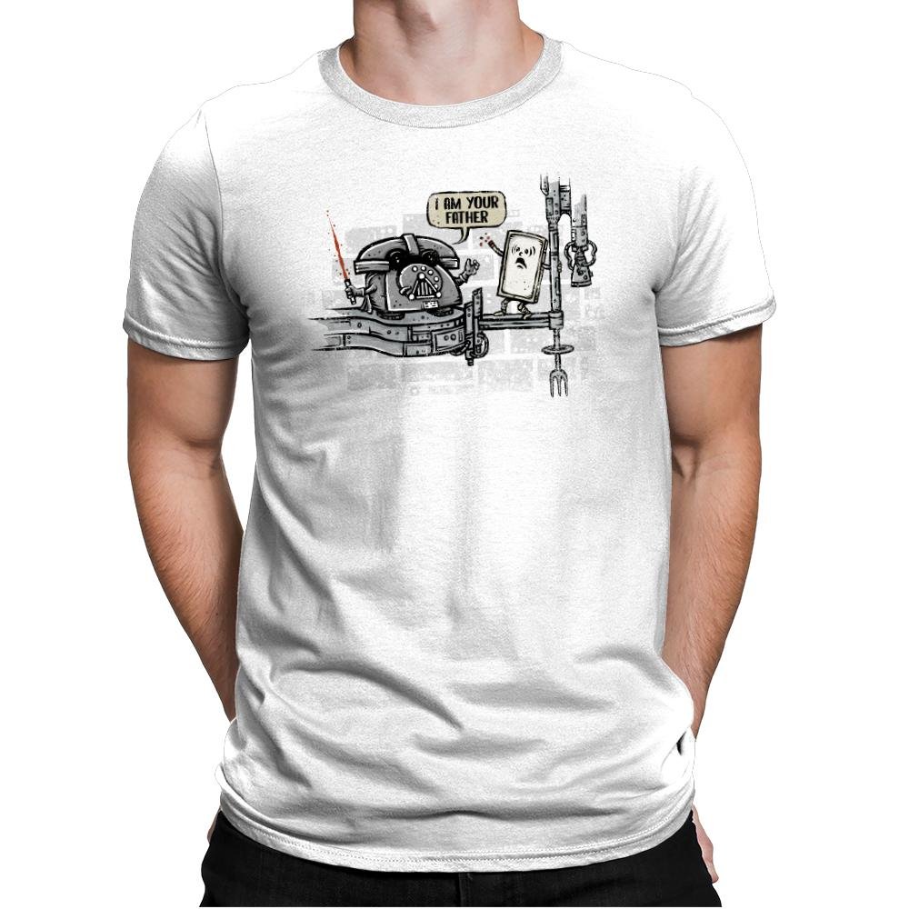This design turns a famous sci fi family reveal into a literal tech joke. A rotary phone takes the role of the stern parent, complete with helmet and a glowing red handset as a weapon. The flip phone stands on a narrow platform in mild disbelief, already halfway into its own fall from relevance. The city backdrop hints at cinematic drama but stays playful rather than serious.