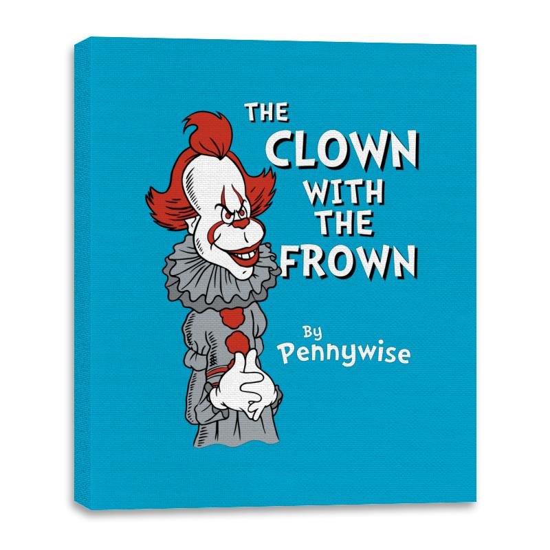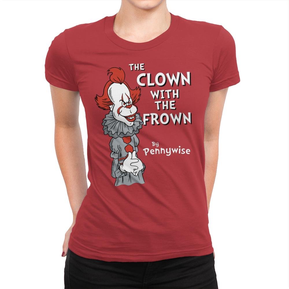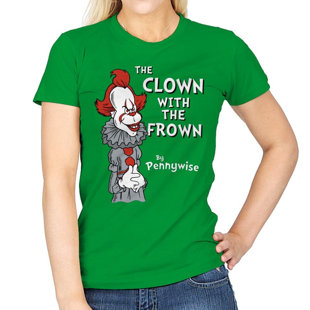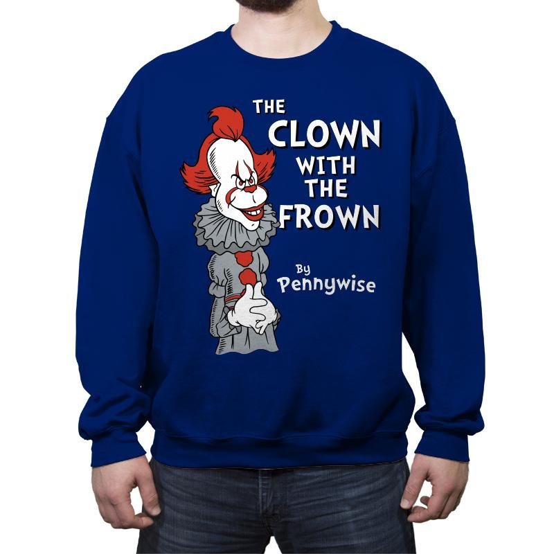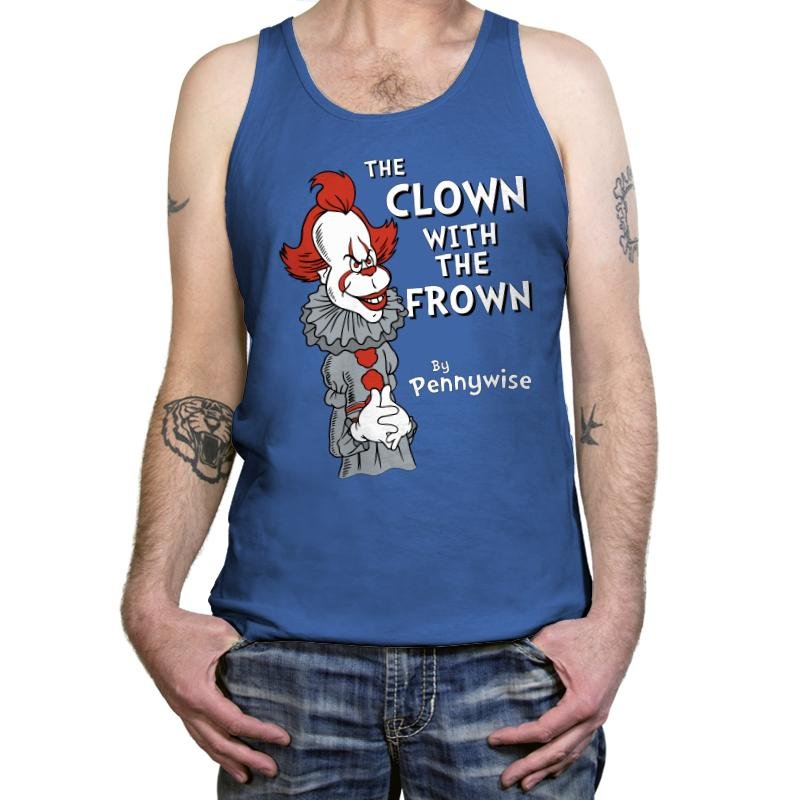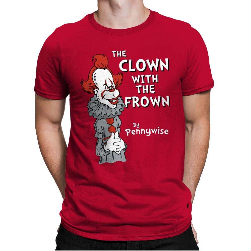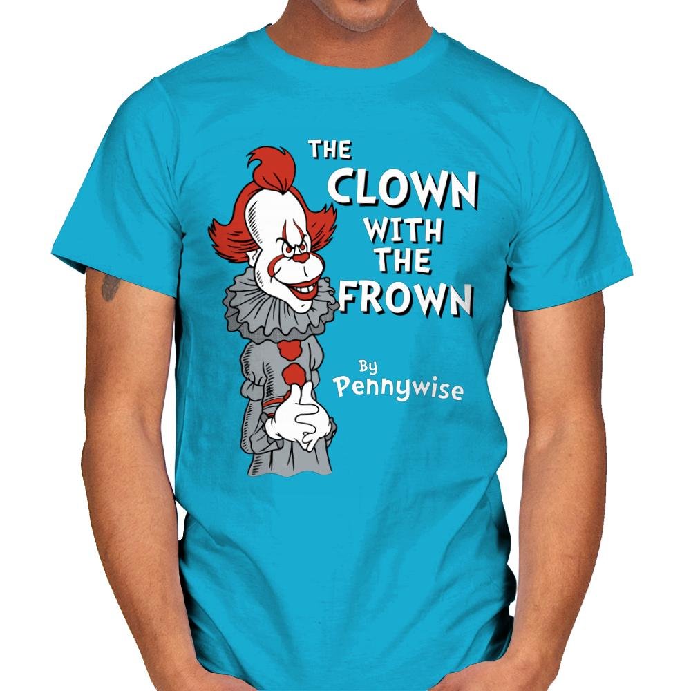 A scowling storybook clown stands in profile against a flat blue background, his ruffled collar and red buttons rendered with simple, confident lines. The hand lettered title reads like a twisted children’s book cover, turning a familiar nightmare into something almost charming. The expression does all the work, less rage than simmering disappointment, which longtime horror fans immediately recognize. It feels like a cautionary tale illustrated for readers who grew up a little sideways.