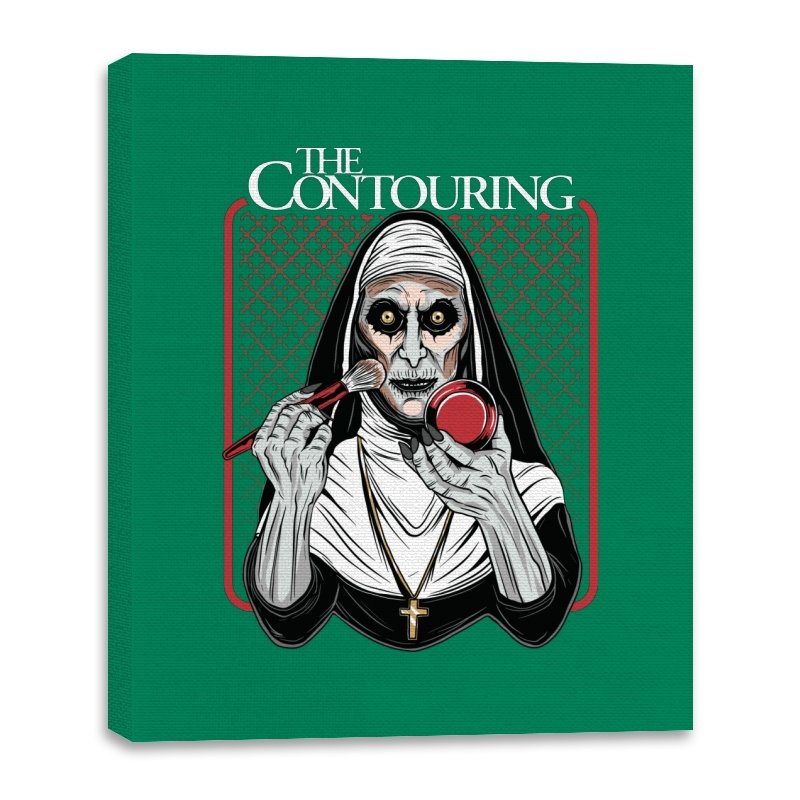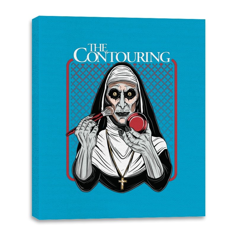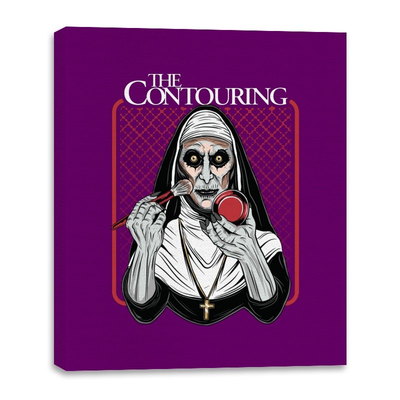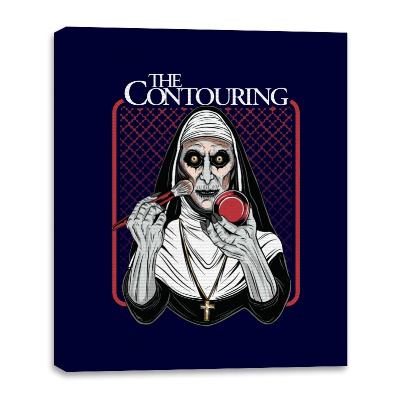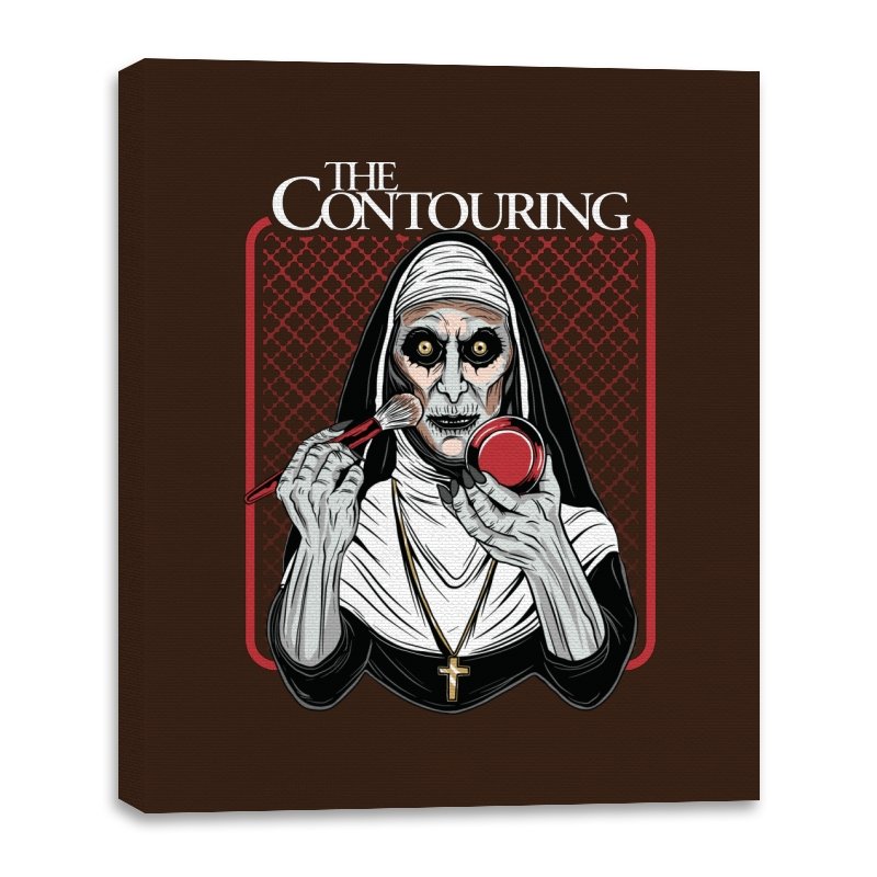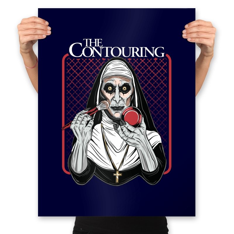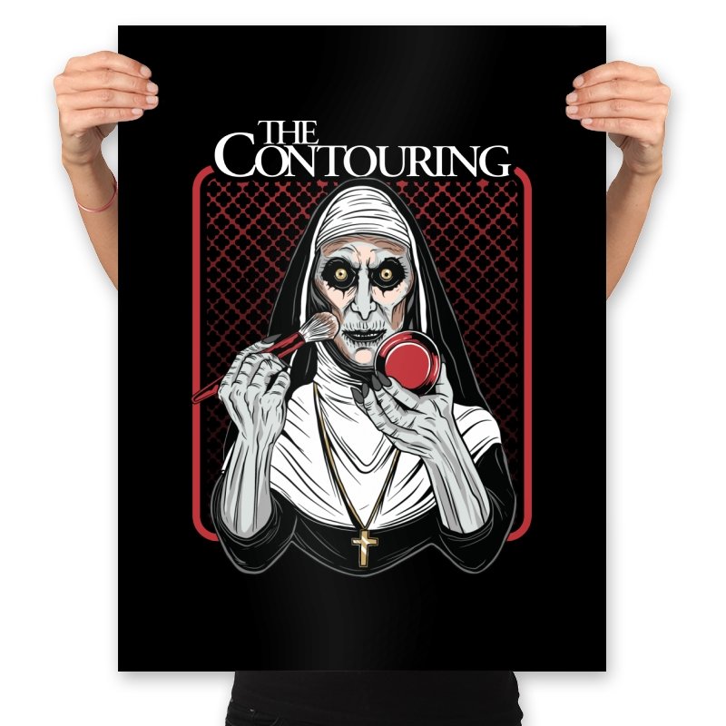This design reimagines a familiar horror figure mid ritual, but the ritual is cosmetic. Sunken eyes stare straight ahead while a makeup brush and compact replace the expected tools, turning possession into preparation. The composition leans into symmetry, stark contrast, and the absurd seriousness of self presentation. If you know the source, the joke works because it is played completely straight.