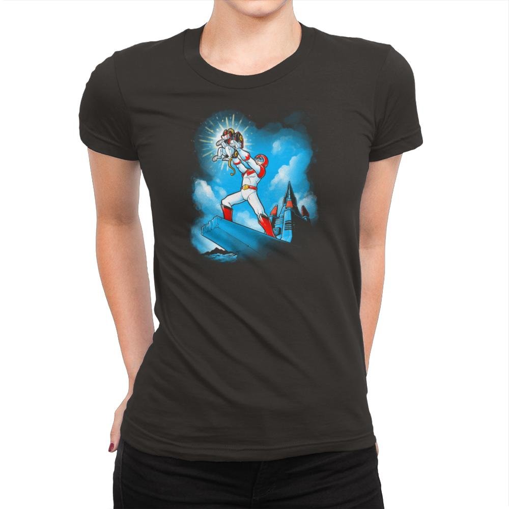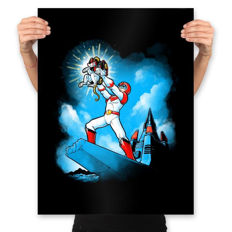 This design lifts a familiar heroic moment and reroutes it through classic mecha mythology. A pilot in clean red and white armor stands at the edge of a stone platform, raising a mechanical lion toward the sky as light breaks through the clouds. The composition mirrors a ceremonial passing of power, blending space opera drama with animated robot lore that longtime fans instantly recognize. It feels like a myth retold through chrome, circuits, and courage.