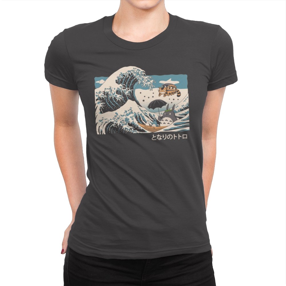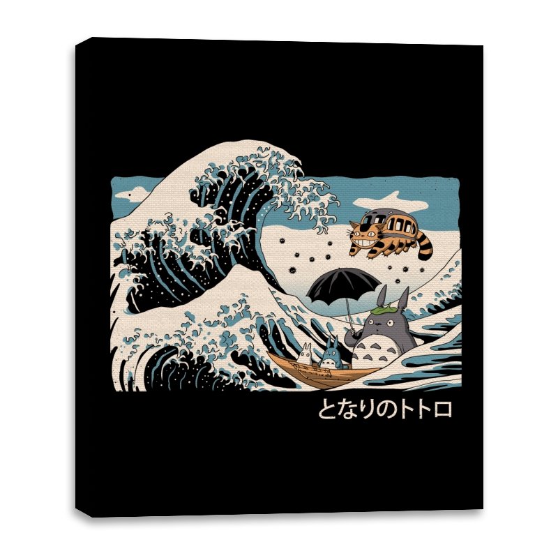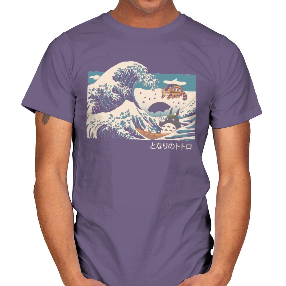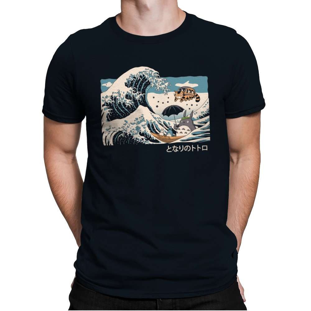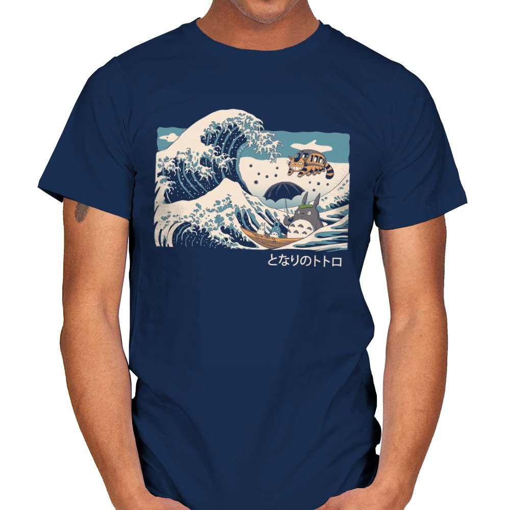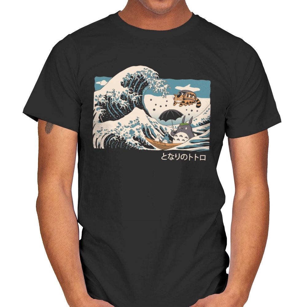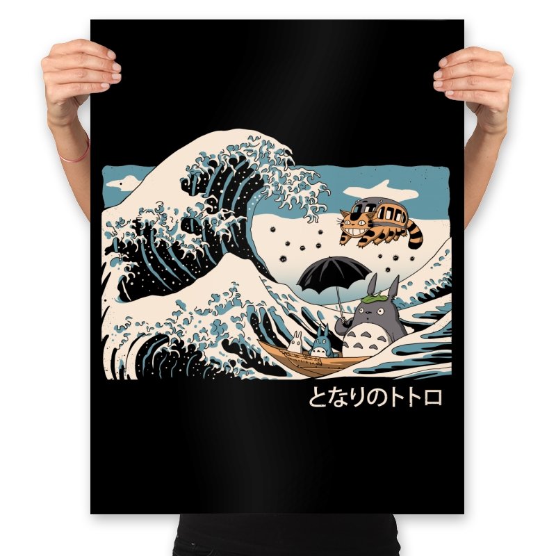 This design blends a classic woodblock wave with a quiet, countryside spirit. A towering surge curls forward while familiar rounded shapes drift calmly below, umbrellas and soot like dots scattered in the spray. The style mirrors old Japanese printmaking, but the scene softens it with warmth and whimsy. If you know the influences, the mix of calm and chaos feels intentional and comforting.