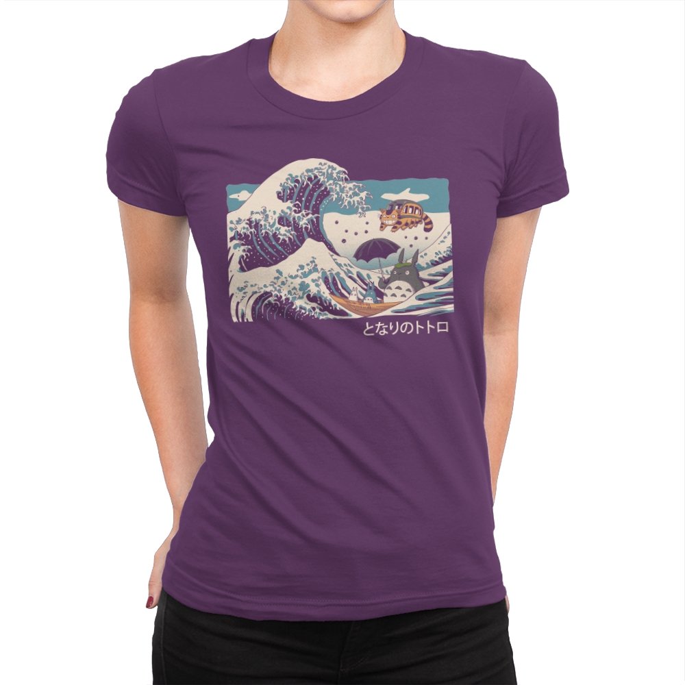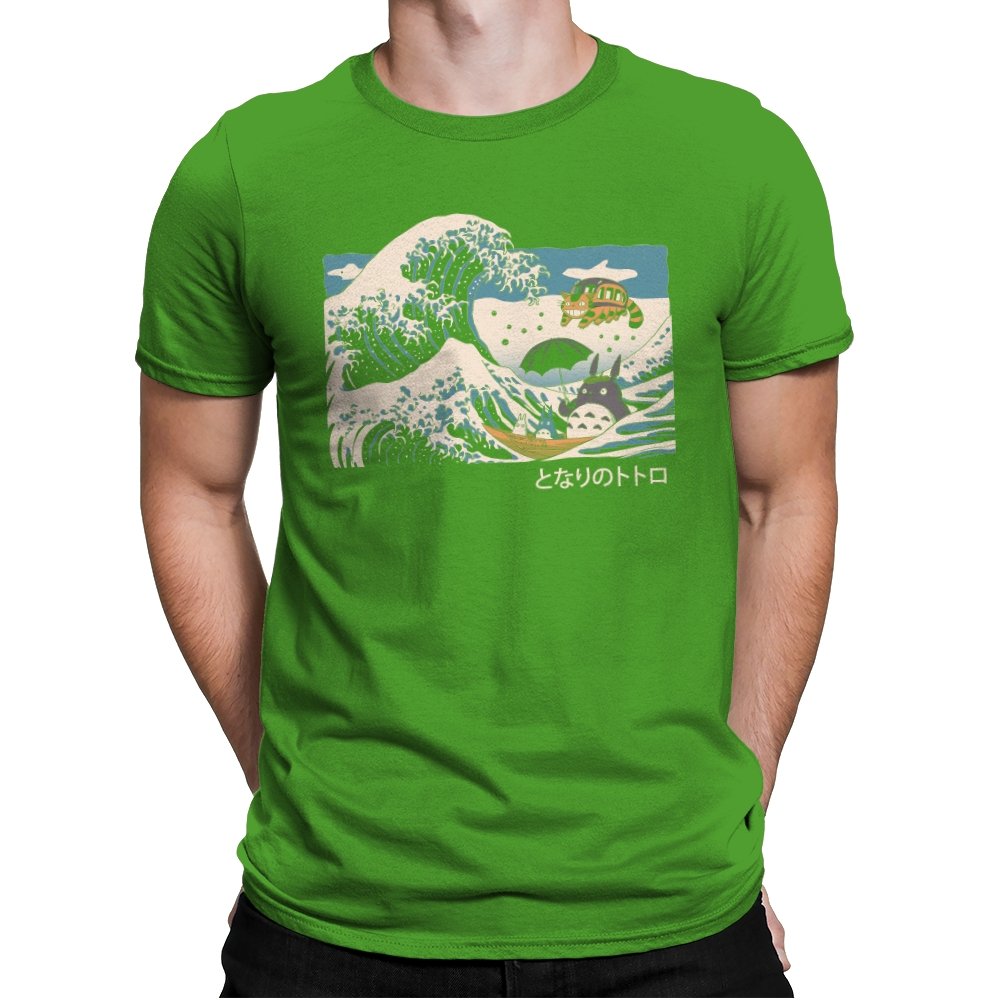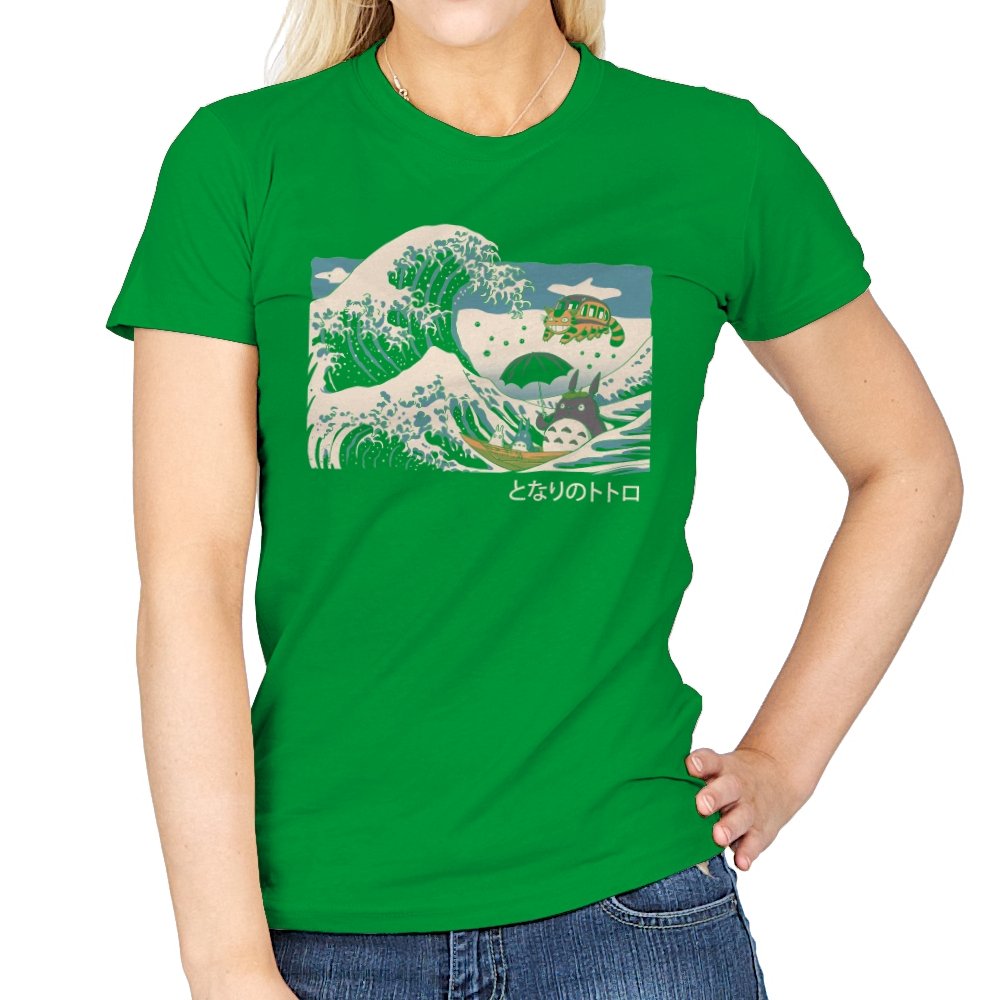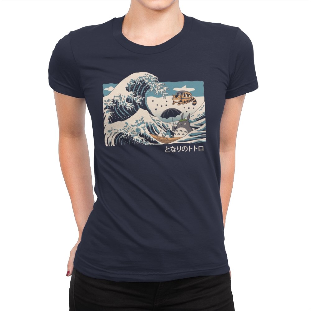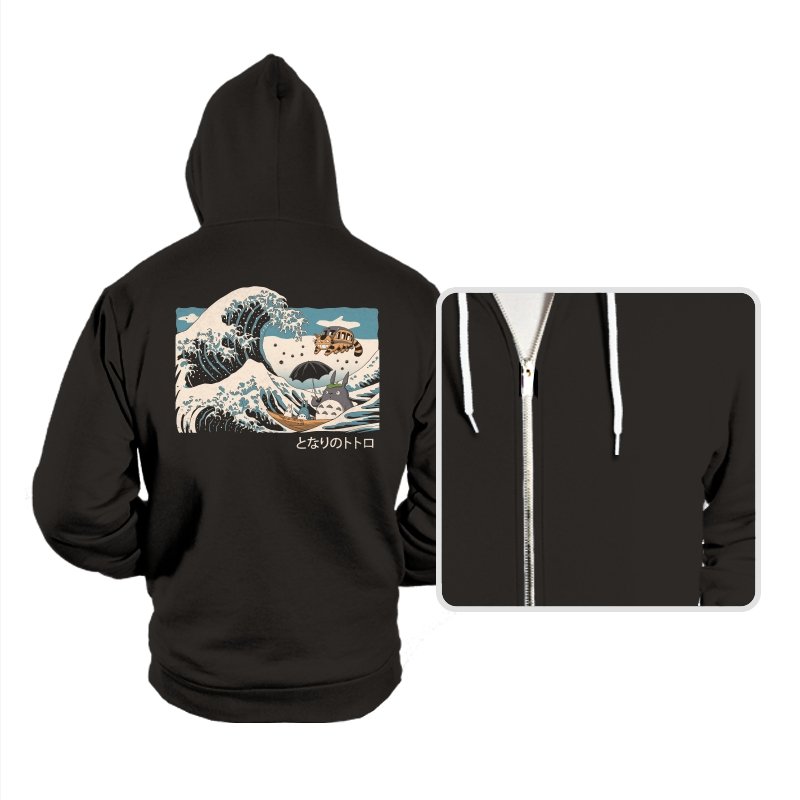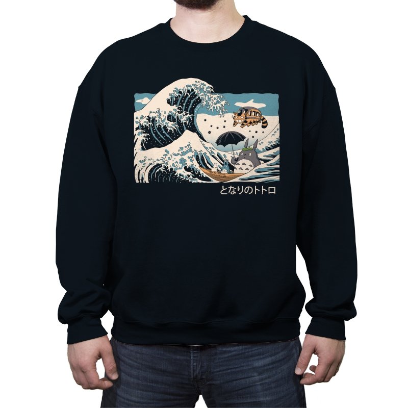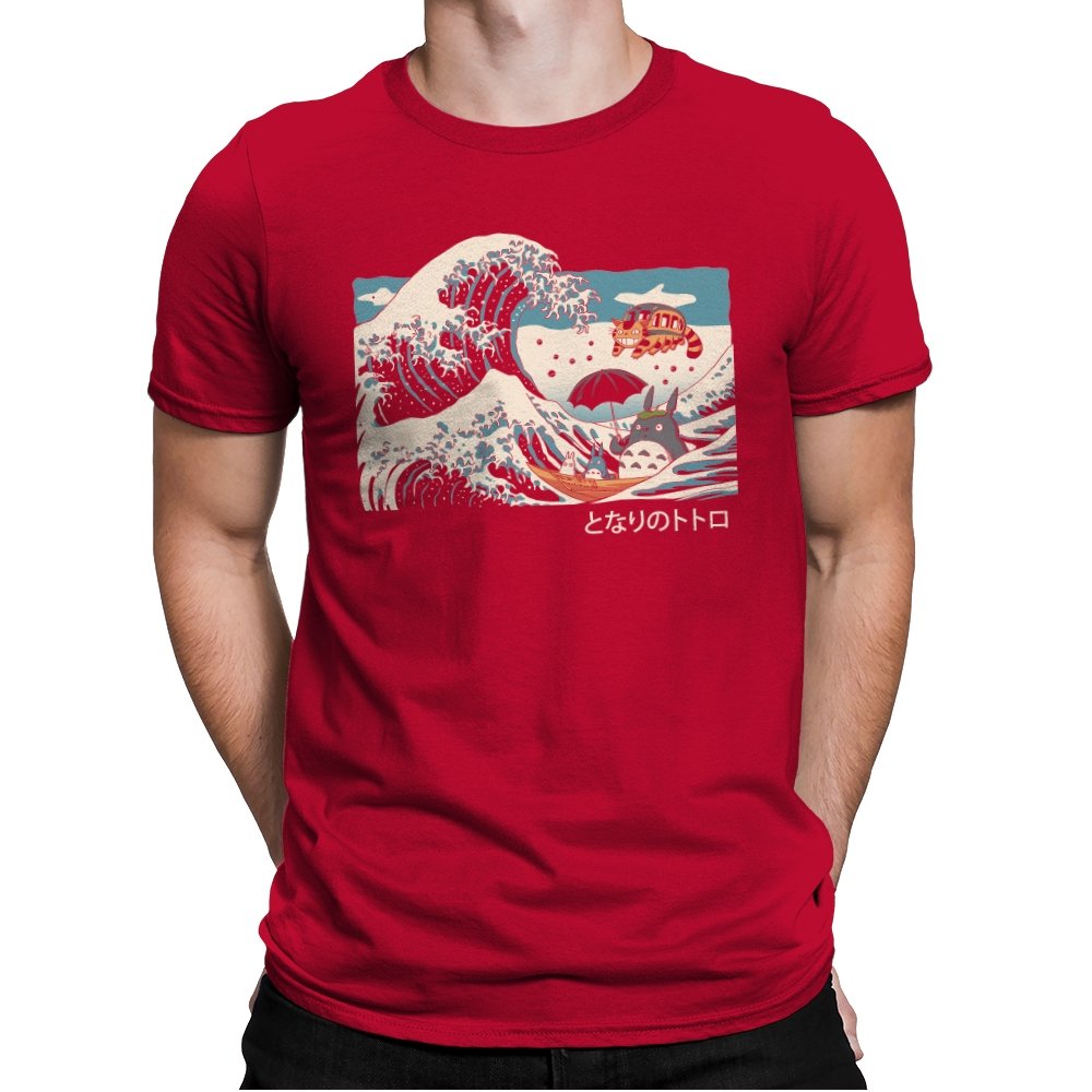 This design blends a classic woodblock wave with a quiet, countryside spirit. A towering surge curls forward while familiar rounded shapes drift calmly below, umbrellas and soot like dots scattered in the spray. The style mirrors old Japanese printmaking, but the scene softens it with warmth and whimsy. If you know the influences, the mix of calm and chaos feels intentional and comforting.
